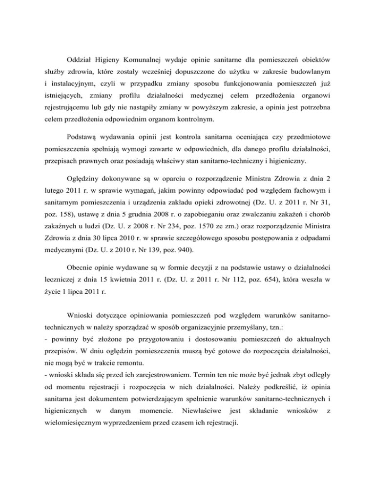 Oddział Higieny Komunalnej wydaje opinie sanitarne dla pomieszczeń obiektów służby zdrowia, które zostały wcześniej dopuszczone do użytku w zakresie budowlanym i instalacyjnym, czyli w przypadku zmiany sposobu funkcjonowania pomieszczeń już istniejących, zmiany profilu działalności medycznej celem przedłożenia organowi rejestrującemu lub gdy nie nastąpiły zmiany w powyższym zakresie, a opinia jest potrzebna celem przedłożenia odpowiednim organom kontrolnym. Podstawą wydawania opinii jest kontrola sanitarna oceniająca czy przedmiotowe pomieszczenia spełniają wymogi zawarte w odpowiednich, dla danego profilu działalności, przepisach prawnych oraz posiadają właściwy stan sanitarno-techniczny i higieniczny. Oględziny dokonywane są w oparciu o rozporządzenie Ministra Zdrowia z dnia 2 lutego 2011 r. w sprawie wymagań, jakim powinny odpowiadać pod względem fachowym i sanitarnym pomieszczenia i urządzenia zakładu opieki zdrowotnej (Dz. U. z 2011 r. Nr 31, poz. 158), ustawę z dnia 5 grudnia 2008 r. o zapobieganiu oraz zwalczaniu zakażeń i chorób zakaźnych u ludzi (Dz. U. z 2008 r. Nr 234, poz. 1570 ze zm.) oraz rozporządzenie Ministra Zdrowia z dnia 30 lipca 2010 r. w sprawie szczegółowego sposobu postępowania z odpadami medycznymi (Dz. U. z 2010 r. Nr 139, poz. 940). Obecnie opinie wydawane są w formie decyzji z na podstawie ustawy o działalności leczniczej z dnia 15 kwietnia 2011 r. (Dz. U. z 2011 r. Nr 112, poz. 654), która weszła w życie 1 lipca 2011 r. Wnioski dotyczące opiniowania pomieszczeń pod względem warunków sanitarnotechnicznych w należy sporządzać w sposób organizacyjnie przemyślany, tzn.: - powinny być złożone po przygotowaniu i dostosowaniu pomieszczeń do aktualnych przepisów. W dniu oględzin pomieszczenia muszą być gotowe do rozpoczęcia działalności, nie mogą być w trakcie remontu. - wnioski składa się przed ich zarejestrowaniem. Termin ten nie może być jednak zbyt odległy od momentu rejestracji i rozpoczęcia w nich działalności. Należy podkreślić, iż opinia sanitarna jest dokumentem potwierdzającym spełnienie warunków sanitarno-technicznych i higienicznych w danym momencie. Niewłaściwe jest wielomiesięcznym wyprzedzeniem przed czasem ich rejestracji. składanie wniosków z Wniosek o wydanie opinii sanitarnej powinien zawierać: - adres Wnioskodawcy, - informację, w jakim celu ma zostać wydana opinia, - lokalizację wnioskowanych pomieszczeń (szczególnie, gdy znajduje się w innej miejscowości niż siedziba główna obiektu) - rodzaj i zakres usług świadczonych w przedmiotowych pomieszczeniach, - rodzaj dokonanych zmian (modernizacja pomieszczeń/ zmiana zakresu świadczonych usług etc.), - krótki opis wnioskowanych pomieszczeń, - kontakt telefoniczny, - czytelny podpis Wnioskodawcy.