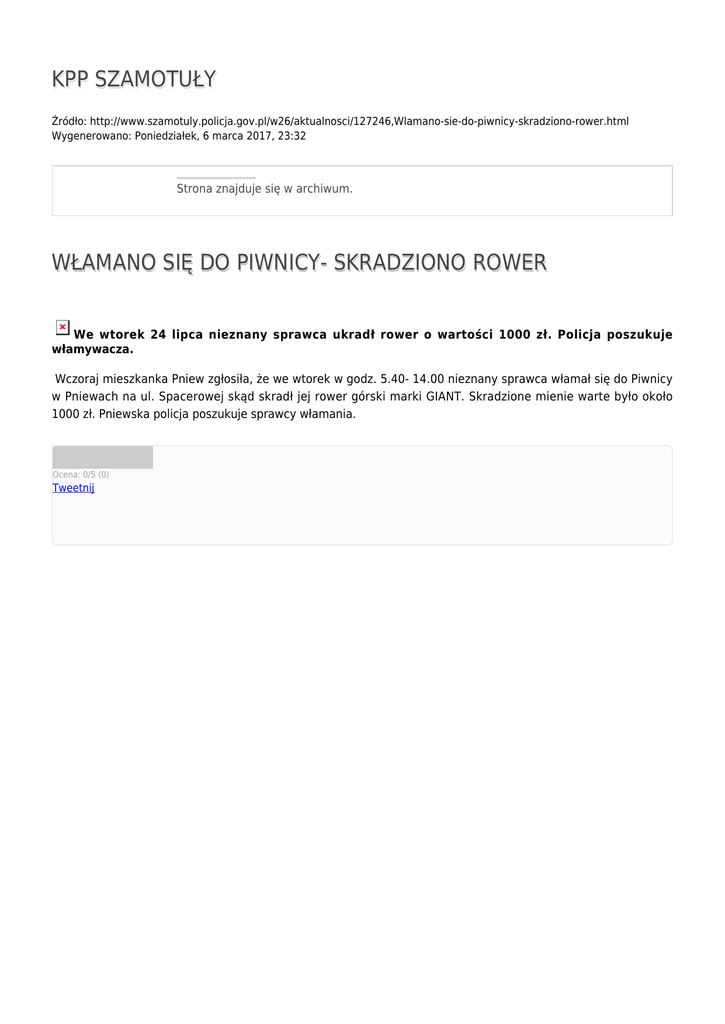KPP SZAMOTUŁY Źródło: http://www.szamotuly.policja.gov.pl/w26/aktualnosci/127246,Wlamano-sie-do-piwnicy-skradziono-rower.html Wygenerowano: Poniedziałek, 6 marca 2017, 23:32 Strona znajduje się w archiwum. WŁAMANO SIĘ DO PIWNICY- SKRADZIONO ROWER We wtorek 24 lipca nieznany sprawca ukradł rower o wartości 1000 zł. Policja poszukuje włamywacza. Wczoraj mieszkanka Pniew zgłosiła, że we wtorek w godz. 5.40- 14.00 nieznany sprawca włamał się do Piwnicy w Pniewach na ul. Spacerowej skąd skradł jej rower górski marki GIANT. Skradzione mienie warte było około 1000 zł. Pniewska policja poszukuje sprawcy włamania. Ocena: 0/5 (0) Tweetnij