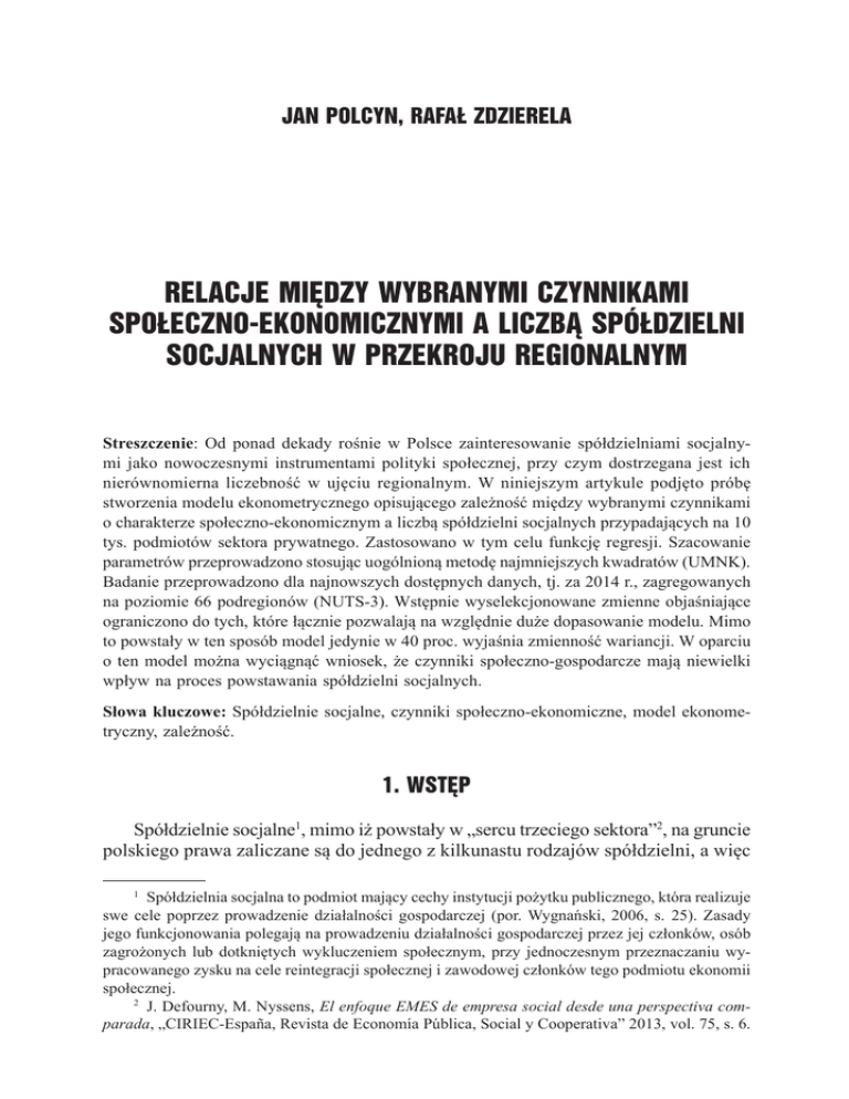 JAN POLCYN, RAFAŁ ZDZIERELA RELACJE MIĘDZY WYBRANYMI CZYNNIKAMI SPOŁECZNO-EKONOMICZNYMI A LICZBĄ SPÓŁDZIELNI SOCJALNYCH W PRZEKROJU REGIONALNYM Streszczenie: Od ponad dekady rośnie w Polsce zainteresowanie spółdzielniami socjalnymi jako nowoczesnymi instrumentami polityki społecznej, przy czym dostrzegana jest ich nierównomierna liczebność w ujęciu regionalnym. W niniejszym artykule podjęto próbę stworzenia modelu ekonometrycznego opisującego zależność między wybranymi czynnikami o charakterze społeczno-ekonomicznym a liczbą spółdzielni socjalnych przypadających na 10 tys. podmiotów sektora prywatnego. Zastosowano w tym celu funkcję regresji. Szacowanie parametrów przeprowadzono stosując uogólnioną metodę najmniejszych kwadratów (UMNK). Badanie przeprowadzono dla najnowszych dostępnych danych, tj. za 2014 r., zagregowanych na poziomie 66 podregionów (NUTS-3). Wstępnie wyselekcjonowane zmienne objaśniające ograniczono do tych, które łącznie pozwalają na względnie duże dopasowanie modelu. Mimo to powstały w ten sposób model jedynie w 40 proc. wyjaśnia zmienność wariancji. W oparciu o ten model można wyciągnąć wniosek, że czynniki społeczno-gospodarcze mają niewielki wpływ na proces powstawania spółdzielni socjalnych. Słowa kluczowe: Spółdzielnie socjalne, czynniki społeczno-ekonomiczne, model ekonometryczny, zależność. 1. WSTĘP Spółdzielnie socjalne1, mimo iż powstały w „sercu trzeciego sektora”2, na gruncie polskiego prawa zaliczane są do jednego z kilkunastu rodzajów spółdzielni, a więc Spółdzielnia socjalna to podmiot mający cechy instytucji pożytku publicznego, która realizuje swe cele poprzez prowadzenie działalności gospodarczej (por. Wygnański, 2006, s. 25). Zasady jego funkcjonowania polegają na prowadzeniu działalności gospodarczej przez jej członków, osób zagrożonych lub dotkniętych wykluczeniem społecznym, przy jednoczesnym przeznaczaniu wypracowanego zysku na cele reintegracji społecznej i zawodowej członków tego podmiotu ekonomii społecznej. 2 J. Defourny, M. Nyssens, El enfoque EMES de empresa social desde una perspectiva comparada, „CIRIEC-España, Revista de Economía Pública, Social y Cooperativa” 2013, vol. 75, s. 6. 1 Relacje między wybranymi czynnikami społeczno-ekonomicznymi... 371 form gospodarczych sięgających korzeniami czasów sprzed blisko 200 lat. O ile sektor spółdzielczy powoli odbudowuje się po okresie „wypaczeń” w funkcjonowaniu ruchu spółdzielczego w okresie komunizmu oraz defaworyzowaniu w okresie po przemianach ustrojowych3, to z analizowanym tu rodzajem spółdzielni, mimo jego stosunkowo krótkiej historii, bo sięgającej w Europie początku lat 90-tych ubiegłego wieku, polska spółdzielczość wiąże spore nadzieje4. Warty przy tym podkreślenia jest fakt, że spółdzielnie socjalne stanowią ponadto ten typ podmiotu ekonomii społecznej, któremu najbliżej do spełnienia kryteriów stawianych przez EMES wirtualnemu modelowi przedsiębiorstwa społecznego5. Spełniają bowiem 3 na 4 kryteria ekonomiczne oraz 4 na 5 kryteria społeczne6. Celem niniejszego artykułu jest podjęcie próby wyznaczenia modelu ekonometrycznego opisującego zależność między wybranymi czynnikami o charakterze społeczno-ekonomicznym a liczbą spółdzielni socjalnych przypadających na 10 000 podmiotów sektora prywatnego. W związku z tym autorzy stawiają następującą hipotezę badawczą: istnieją czynniki o charakterze społeczno-ekonomicznym, które istotnie wpływają na względną liczebność spółdzielni socjalnych w Polsce. Poznanie zależności opisywanych modelem umożliwi, politykom gospodarczym korzystanie z narzędzia ekonometrycznego, którego wartość aplikacyjna będzie pozwalać z jednej strony na stymulowanie liczebności spółdzielni socjalnych, z drugiej zaś – na szacowanie liczebności analizowanych podmiotów w przyszłości. 2. WYZNACZNIKI SPOŁECZNO-EKONOMICZNE LICZEBNOŚCI SPÓŁDZIELNI SOCJALNYCH W literaturze przedmiotu czynniki społeczno-ekonomiczne, czy też społeczno-gospodarcze należą do podstawowych uwarunkowań zakładania i prowadzenia działalności gospodarczej i są przedmiotem licznych badań7. Mogą być zatem E. Leś, Co-operatives in Poland: from state-controlled institutions to new trends in co-operative development, [w:] C. Borzaga, R. Spear (red.), Trends and challenges for co-operatives and social enterprises in developed and transition countries, Edizioni31, Trento 2004, s. 195. 4 P. Frączak, R. Skrzypiec, Kondycja spółdzielczości pracy oraz wizje jej rozwoju. Raport z badania, Spółdzielnia Kooperatywa Pozarządowa, Warszawa 2011, s. 121. 5 J. Herbst, Pole przedsiębiorczości społecznej w Polsce, [w:] A. Giza-Poleszczuk, J. Hausner (red.), Ekonomia społeczna w Polsce: osiągnięcia, bariery rozwoju i potencjał w świetle wyników, Fundacja Inicjatyw Społeczno-Ekonomicznych, Warszawa 2008, s. 60. 6 Na marginesie warto zauważyć zdaniem niektórych prawników hybrydowa konstrukcja spółdzielni socjalnej nie uprawnia do uznania jej ani za podmiot sektora pozarządowego, ani za przedsiębiorstwo, (por. Izdebski). 7 Por. E. Bittnerowa, Zmiana uwarunkowań rozwoju małych i średnich przedsiębiorstw przemysłowych w Wielkopolsce, Wydawnictwo Akademii Ekonomicznej w Poznaniu, Poznań 1999, s. 18; T. Łuczka, Bariery rozwoju małych i średnich przedsiębiorstw w Polsce, [w:] T. Łuczka (red.), Małe i średnie przedsiębiorstwa. Szkice o współczesnej przedsiębiorczości, Politechnika Poznańska, Poznań 2005, s. 30. 3 372 Jan Polcyn, Rafał Zdzierela przedmiotem analizy w odniesieniu do spółdzielni socjalnych – osobliwej formy prawnej prowadzenia działalności gospodarczej. Jednym z istotnych czynników determinujących liczebności spółdzielni socjalnych może być przestępczość, która obok innych zjawisk społecznych zaliczana jest do tzw. indykatorów kapitału spo