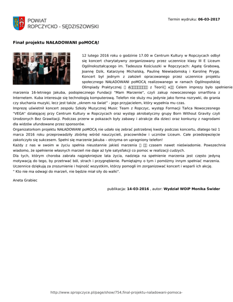 Termin wydruku: 06-03-2017 Finał projektu NAŁADOWANI poMOCĄ! 12 lutego 2016 roku o godzinie 17.00 w Centrum Kultury w Ropczycach odbył się koncert charytatywny zorganizowany przez uczennice klasy III E Liceum Ogólnokształcącego im. Tadeusza Kościuszki w Ropczycach: Agatę Grabową, Joannę Dzik, Katarzynę Michalską, Paulinę Niewiadomską i Karolinę Prygę. Koncert był jednym z założeń opracowanego przez uczennice projektu społecznego NAŁADOWANI poMOCĄ realizowanego w ramach Ogólnopolskiej Olimpiady Praktycznej Ḁ娀眀漀氀渀椀攀渀椀 z Teorii ᴀ⸀ Celem imprezy było spełnienie marzenia 16-letniego Jakuba, podopiecznego Fundacji "Mam Marzenie", czyli zakup nowoczesnego smartfona z Internetem. Kuba interesuje się technologią komputerową. Telefon nie służy mu jedynie jako forma rozrywki, do grania czy słuchania muzyki, lecz jest także „oknem na świat” - jego przyjacielem, który wypełnia mu czas. Imprezę uświetnił koncert zespołu Szkoły Muzycznej Music Team z Ropczyc, występ Formacji Tańca Nowoczesnego "VEGA" działającej przy Centrum Kultury w Ropczycach oraz występ akrobatyczny grupy Born Without Gravity czyli Urodzonych Bez Grawitacji. Podczas przerw w pokazach były zabawy i atrakcje dla dzieci oraz konkursy z nagrodami dla widzów ufundowane przez sponsorów. Organizatorkom projektu NAŁADOWANI poMOCĄ nie udało się zebrać potrzebnej kwoty podczas koncertu, dlatego też 1 marca 2016 roku przeprowadziły zbiórkę wśród nauczycieli, pracowników i uczniów Liceum. Całe przedsięwzięcie zakończyło się sukcesem. Spełni się marzenie Jakuba – otrzyma on upragniony telefon! Każdy z nas w swoim w życiu spełnia nieustannie jakieś marzenia ጀ czasem nawet nieświadomie. Powszechnie wiadomo, że spełnienie własnych marzeń nie daje aż tyle satysfakcji co pomoc w realizacji cudzych. Dla tych, którym choroba zabrała najpiękniejsze lata życia, nadzieja na spełnienie marzenia jest często jedyną motywacją do tego, by przetrwać ból, strach i przygnębienie. Pamiętajmy o tym i pomóżmy innym spełniać marzenia. Uczennice dziękują za zrozumienie i hojność wszystkim, którzy pomogli im zorganizować koncert i wsparli ich akcję. " Kto nie ma odwagi do marzeń, nie będzie miał siły do walki". Aneta Grabiec publikacja: 14-03-2016 , autor: Wydział WOiP Monika Świder http://www.spropczyce.pl/page/show/754,final-projektu-naladowani-pomoca-