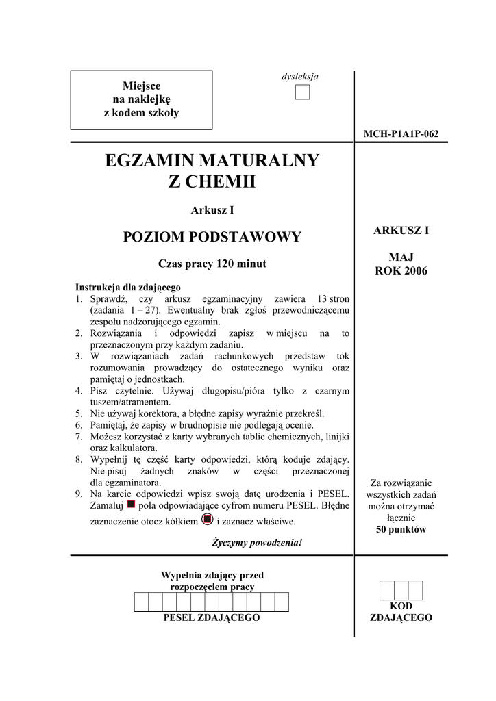 dysleksja Miejsce na naklejkę z kodem szkoły MCH-P1A1P-062 EGZAMIN MATURALNY Z CHEMII Arkusz I POZIOM PODSTAWOWY Czas pracy 120 minut Instrukcja dla zdającego 1. Sprawdź, czy arkusz egzaminacyjny zawiera 13 stron (zadania 1 – 27). Ewentualny brak zgłoś przewodniczącemu zespołu nadzorującego egzamin. 2. Rozwiązania i odpowiedzi zapisz w miejscu na to przeznaczonym przy każdym zadaniu. 3. W rozwiązaniach zadań rachunkowych przedstaw tok rozumowania prowadzący do ostatecznego wyniku oraz pamiętaj o jednostkach. 4. Pisz czytelnie. Używaj długopisu/pióra tylko z czarnym tuszem/atramentem. 5. Nie używaj korektora, a błędne zapisy wyraźnie przekreśl. 6. Pamiętaj, że zapisy w brudnopisie nie podlegają ocenie. 7. Możesz korzystać z karty wybranych tablic chemicznych, linijki oraz kalkulatora. 8. Wypełnij tę część karty odpowiedzi, którą koduje zdający. Nie pisuj żadnych znaków w części przeznaczonej dla egzaminatora. 9. Na karcie odpowiedzi wpisz swoją datę urodzenia i PESEL. Zamaluj pola odpowiadające cyfrom numeru PESEL. Błędne zaznaczenie otocz kółkiem i zaznacz właściwe. ARKUSZ I MAJ ROK 2006 Za rozwiązanie wszystkich zadań można otrzymać łącznie 50 punktów Życzymy powodzenia! Wypełnia zdający przed rozpoczęciem pracy PESEL ZDAJĄCEGO KOD ZDAJĄCEGO Egzamin maturalny z chemii Arkusz I 2 Informacja do zadania 1. i 2. Konfigurację elektronową atomu glinu w stanie podstawowym można przedstawić następująco: 1s2 2s22p6 3s23p1 (K2L8M3) Zadanie 1. (1 pkt) Przepisz ten fragment konfiguracji elektronowej atomu glinu, który odnosi się do elektronów walencyjnych. 3s23p1 Zadanie 2. (1 pkt) Podaj trwały stopień utlenienia, który glin przyjmuje w związkach chemicznych. III Informacja do zadań 3. – 5. Chlorek glinu otrzymuje się w reakcji glinu z chlorowodorem lub działając chlorem na glin. Związek ten tworzy kryształy, rozpuszczalne w wodzie zakwaszonej kwasem solnym. Z roztworów tych krystalizuje uwodniona sól – tak zwany heksahydrat chlorku glinu [gr. héks = sześć]. Hydraty (sole uwodnione) to sole zawierające w sieci krystalicznej cząsteczki wody, np. dekahydrat węglanu sodu, Na2CO3·10H2O. Zapis ten oznacza, że w sieci krystalicznej tej soli na 2 jony Na+ i 1 jon CO32– przypada 10 cząsteczek wody. Chlorek glinu jest stosowany jako katalizator w wielu syntezach organicznych. Na podstawie: Encyklopedia szkolna. Chemia, Warszawa 2001 Zadanie 3. (3 pkt) a) Napisz w formie cząsteczkowej równania reakcji ilustrujące wymienione w informacji metody otrzymywania chlorku glinu. Równanie reakcji ilustrujące I metodę: 2Al + 6HCl → 2AlCl3 + 3H2 Równanie reakcji ilustrujące II metodę: 2Al + 3Cl2 → 2AlCl3 b) Podaj liczbę moli chloru cząsteczkowego, która całkowicie przereaguje z jednym molem glinu. 1,5 mola Egzamin maturalny z chemii Arkusz I 3 Zadanie 4. (3 pkt) Napisz wzór i oblicz masę molową soli, która krystalizuje z wodnego roztworu chlorku glinu. Pamiętaj, że jest to sól uwodniona. Zapisz niezbędne obliczenia. a) wzór soli: AlCl3·6H2O b) obliczenia: MAl = 27 g/mol; MCl = 35,5 g/mol; MO = 16 g/mol; MH = 1 g/mol - obliczenie masy molowej: M AlCl 3 ⋅ 6H O 2 = [27 + 3 ⋅ 35,5 + 6 (2 + 16 )] g mol g mol Odpowiedź: Masa molowa soli wynosi 241,5 g/mol M AlCl ⋅6H O ≅ 241,5 3 2 Zadanie 5. (3 pkt) a) Dokończ poniższe równanie reakcji (stosunek molowy substratów wynosi 1:1). Cl + chlorek glinu + Cl 2 HCl b) Podaj nazwę systematyczną związku organicznego otrzymanego w tej reakcji. chlorobenzen c) Określ, jaką rolę w tej reakcji pełni chlorek glinu. katalizatora Zadanie 6. (2 pkt) Dysponujesz wodnymi roztworami następujących soli: KNO3, AgNO3, Ba(NO3)2 Korzystając z tablicy rozpuszczalności, wybierz spośród nich roztwór tej soli, za pomocą którego wytrącisz z wodnego roztworu chlorku glinu jony chlorkowe w postaci trudno rozpuszczalnego osadu. Napisz w formie jonowej skróconej równanie reakcji zachodzącej w czasie mieszania tych roztworów. a) wzór odczynnika (wpisz wzór soli): AgNO3 b) równanie reakcji w formie jonowej skróconej: Ag+ + Cl⎯ → AgCl↓ Nr zadania Wypełnia Maks. liczba pkt egzaminator! Uzyskana liczba pkt 1 1 2 1 3.1 2 3.2 1 4.1 1 4.2 2 5.1 1 5.2 1 5.3 1 6.1 1 6.2 1 Egzamin maturalny z chemii Arkusz I 4 Informacja do zadania 7. i 8. Tlenek magnezu ma zastosowanie do produkcji cegieł, którymi wykłada się wnętrza pieców hutniczych. Związek ten stosuje się również w medycynie jako składnik leków przeciw nadkwasocie (dolegliwości polegającej na nadmiernym wydzielaniu się w żołądku kwasu solnego). Zadanie 7. (2 pkt) a) Korzystając z tablicy elektroujemności, oblicz różnicę elektroujemności magnezu i tlenu, a następnie określ rodzaj wiązania chemicznego w tlenku magnezu. Różnica elektroujemności: 3,5 – 1,2 = 2,3 Rodzaj wiązania: jonowe b) Poniżej wymieniono pięć właściwości fizycznych tlenku magnezu. Spośród nich wybierz i podkreśl dwie, uzasadniające zastosowanie tego związku do obudowy wnętrz pieców hutniczych. ma wysoką temperaturę topnienia; ma wysoką temperaturę wrzenia; jest ciałem stałym; stopiony przewodzi prąd elektryczny; jest białej barwy Zadanie 8. (2 pkt) a) Napisz w formie cząsteczkowej równanie reakcji zachodzącej w żołądku po zażyciu przez osobę cierpiąca na nadkwasotę leku zawierającego tlenek magnezu. MgO + 2HCl → MgCl2 + H2O b) Określ, jaki charakter chemiczny (kwasowy, zasadowy, obojętny) przejawia tlenek magnezu w tej reakcji. zasadowy Zadanie 9. (2 pkt) W celu zbadania zachowania gazowego amoniaku i bromowodoru wobec wody wykonano doświadczenia, które ilustruje poniższy rysunek. HBr NH3 H2O H2O + wskaźnik + wskaźnik A B Określ odczyn roztworów otrzymanych w obu probówkach. Odczyn roztworu w probówce A: zasadowy Odczyn roztworu w probówce B: kwasowy Egzamin maturalny z chemii Arkusz I 5 Informacja do zadań 10. – 12. Przeprowadzono doświadczenie, w kt