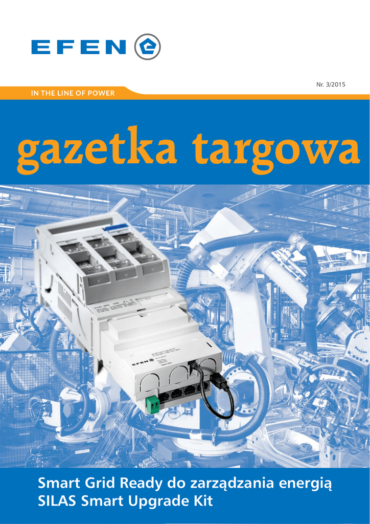 Nr. 3/2015 gazetka targowa Smart Grid Ready do zarządzania energią SILAS Smart Upgrade Kit 1 Szanowni Państwo, Już po raz trzeci oddajmy w Państwa ręce kolejny numer Gazetki Targowej. W ubiegłym roku nasza Gazetka, dotycząca przekładników prądowych niskiego napięcia, cieszyła się bardzo dużym zainteresowaniem. Fakt, iż był jej dwukrotny dodruk, świadczy o tym, że informacje w niej zawarte były dla Państwa przydatne. W tym roku chcielibyśmy kontynuować temat, jakim jest Smart Grid. Zachęcamy do zapoznania się z innowacyjnym rozwiązaniem, między innymi rozłącznika skrzynkowego SILAS Smart Upgrade Kit. W dalszym ciągu dokładamy wszelkich starań, aby przyszłość z inteligentną infrastrukturą pomiarową była bezpieczna i pewna. W tym numerze Gazetki Targowej chcemy Państwu przybliżyć również temat wkładek bezpiecznikowych niskiego napięcia. Przez ostatnie trzy lata rozdaliśmy ponad dwa tysiące książek „Bezpieczniki od A do Z“. Podręcznik ten ułatwił poznanie świata bezpieczników w łatwy i zrozumiały sposób. Wkładki bezpiecznikowe niskiego napięcia są z pozoru prostymi urządzeniami, jednak od wielu lat wciąż należą do najskuteczniejszych urządzeń zabezpieczających. Czas Targów jest również doskonałą okazją do spotkań oraz bezpośredniej wymiany uwag z naszymi pracownikami, do czego serdecznie Państwa zachęcam. Życzę Państwu, aby ten czas był owocny dla obydwu stron. Marcin Rajewski Rajewskii 2 EFEN Gazetka targowa 2015 Inteligentny sposób na pomiar i kontrolę zużycia energii Odpowiedzialne korzystanie ze źródeł energii staje się dla przedsiębiorstw czynnikiem przewagi konkurencyjnej. W tym celu wdrażane są systemy zarządzania energią zgodne z DIN EN ISO 50001, w których zawarty jest proces nieustannego ograniczenia zużycia energii. SILAS Smart Upgrade Kit rejestruje i kontroluje kluczowe parametry pracy przedsiębiorstwa. Smart Grid Ready SILAS Smart Upgrade Kit pozwala na ciągły odczyt i analizę poboru energii, daje obraz profilu mocy jak również powiadamia o zdarzeniach wymagających interwencji obsługi lub innych zakłóceniach. Urządzenie to dostarczane jest w formie gotowej do zabudowy i przystosowane do montażu pod zaciskami pierwotnymi rozłącznika bezpiecznikowego. Przekładnik prądowy, czujnik napięciowy, moduł komunikacyjny oraz interfejs danych są w nim już zintegrowane. EFEN Gazetka targowa 2015 3 Właściwości urządzenia • Konfigurowalne przez użytkownika funkcje alarmowe dla wszystkich wartości elektrycznych • Rejestracja danych w pamięci oraz historia zdarzeń zapisywana przez rok • Zapis pomiaru z ostatnich dwóch godzin pracy oraz zapis pomiaru po przekroczeniu nastaw użytkownika • Zegar Czasu Rzeczywistego nadaje znacznik czasu do rejestrowanych danych • Prosta i szybka metoda separacji galwanicznej przy corocznych rutynowych pomiarach rezystancji izolacji w sieci elektrycznej Wyświetlacz Zasilacz & Gateway #1 #2 max. = #5 Power Supply & Gateway jako Repeater max. 9m Podłączenie wyświetlacza poprzez Modbus RTU równolegle z zasilaczem 24V DC Różnorodne opcje komunikacyjne Programowanie oraz zdalna komunikacja odbywa się poprzez Modbus RTU lub CANopen. Kopiowanie danych operacyjnych jak również aktualizacja i konfiguracja odbywa się poprzez port USB. 4 EFEN Gazetka targowa 2015 USB 2.0 Zakresy pomiarowe Wartości mierzone Opis Napięcie V1 / V2 / V3/ VN (opt) Napięcie fazowe-N Napięcie U12 / U23 / U31 Napięcie międzyfazowe Prąd I1 / I2 / I3 / IN Prądy w fazach L1, L2 oraz L3. Prąd na torze N jest wyliczany. Pomiar mocy: 3P, P 3Q, Q 3S, S Urządzenie mierzy wartości chwilowe oraz wartości średnie i akumulowane Wygodne oddzielenie podczas pomiaru rezystancji izolacji SILAS Smart Upgrade Kit, NH 00, 150A, zacisk M8 Oznaczenie Nr produktu SILAS SUK NH 00 150A U5 70001-1510 SILAS Smart Upgrade Kit, NH 00, 150A, zacisk ramkowy Oznaczenie Nr produktu SILAS SUK NH 00 150A R5 70001-1520 Akcesoria Adapter podwyższający do rozłączników tablicowych Oznaczenie Nr produktu SILAS SUK adapter 25 mm 70901-0000 Adapter zasilający/gateway: Wejście 230 V AC; wyjście 24 V DC poprzez RJ45 Modbus RTU; na listwę DIN 35 mm Oznaczenie Nr produktu Adapter zasilający typu Gateway Modbus HB 70908-0000 Wyświetlacz: Wejście 24 V DC poprzez Modbus RTU; do pracy jako wyświetlacz i jednostka konfiguracyjna Oznaczenie Nr produktu Wyświetlacz Display Modbus RTU 96x96 70807-0000 Rysunki wymiarowe EFEN Gazetka targowa 2015 5 Smart Grid Interfejs: Inteligentny przesył energii dla nowoczesnych zakładów energetycznych Smart Grid Ready 6 EFEN Gazetka targowa 2015 Smart Grid Interfejs: Inteligentny przesył energii dla nowoczesnych zakładów energetycznych Strategia transformacji energetycznej wpływa w znaczący sposób na sieci przesyłowe. Dzieje się tak dlatego, że gwałtowny wzrost udziału w sieci energii odnawialnej prowadzi do bardzo wysokiej niestabilności w rozpływie prądów. Od zdecentralizowanych nowoczesnych systemów wymaga się, aby nieustannie monitorowały przekroczenia zakresu napięciowego oraz reagowały na przeciążenia w czasie rzeczywistym tak, aby można było uniknąć takich sytuacji przy zastosowaniu środków automatycznej regulacji. Smart Grid Ready Smart Grid Ready Smart Grid Ready Smart Grid Ready Smart Grid Ready Smart Grid Ready Smart Grid Ready Smart Grid Ready Smart Grid Ready Smart Grid Ready Smart Grid Ready Smart Grid Ready Smart Grid Ready Czytelny przepływ energii jest czynnikiem decydującym o stabilności nowoczesnych sieci energetycznych. Stajemy przed wyzwaniem jakim jest zmierzenie i określenie chwilowych parametrów sieci, która jest nieustannie narażona na duże wahania przepływu energii pochodzące z niestabilnych źródeł wytwórczych. Zestaw firmy EFEN pod nazwą Smart Grid Interfejs pozwala na zrealizowanie punktów pomiarowych w strategicznych punktach lokalnych sieci energetycznych - w prosty