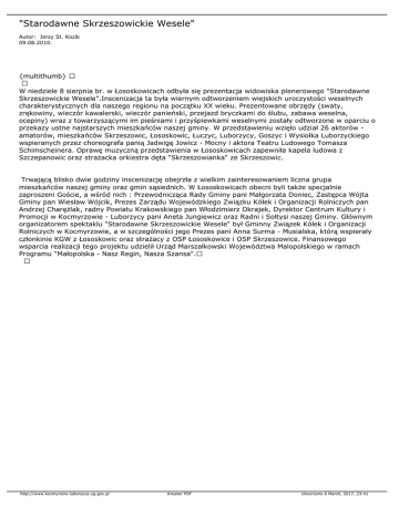 przekazy ustne najstarszych mieszkańców naszej gminy. W przedstawieniu wzięło udział 26 aktorów amatorów, mieszkańców Skrzeszowic, Łososkowic, Łuczyc, Luborzycy, Goszyc i Wysiołka Luborzyckiego