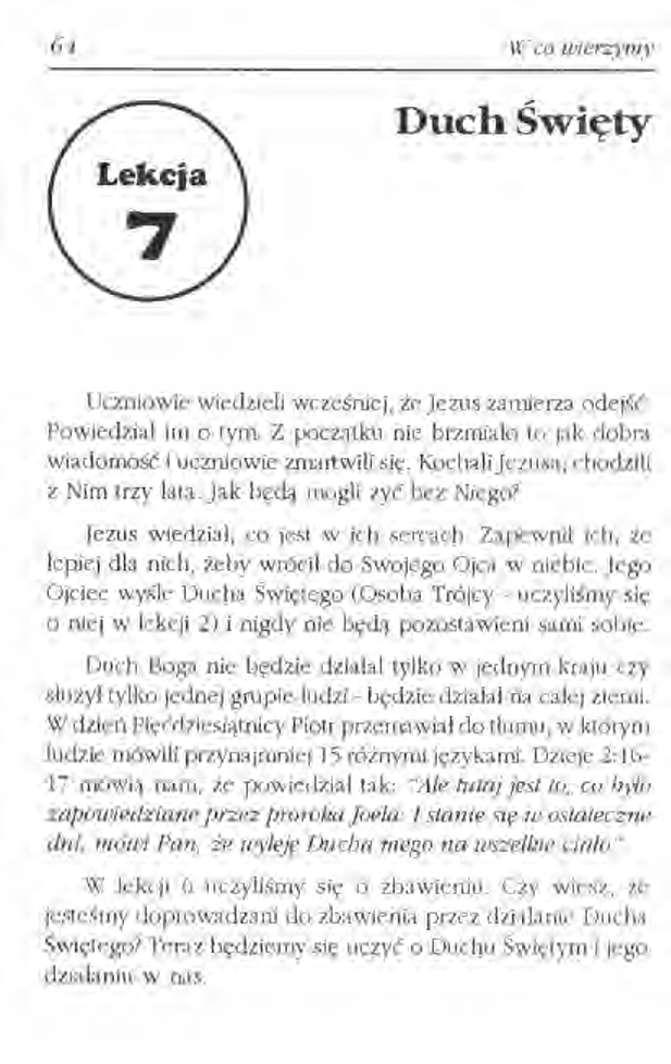 ~flco unerzymy Duch Święty Uczniowie wiedzieli wcześniej, ze Jezus zamierza odejść. Powiedział im o tym. Z początku nie brzmiało to jak dobra wiadomość i uczniowie zmartwili się. Kochali Jezusa; chodzili z Nim trzy lata. Jak będą mogli zyć bez Niego? Jezus wiedział, co jest w ich sercach. Zapewni! ich, ze lepiej dla nich, żeby wróci! do Swojego Ojca w niebie. Jego Ojciec wyśle Ducha Świętego (Osoba Trójcy - uczyliśmy się o niej w lekcji 2) i nigdy nie będą pozostawieni sarni sobie. Duch Boga nie będzie działał tylko w jednym kraju czy służył tylko jednej grupie ludzi - będzie działał na całej ziemi. W dzień Pięćrl'iesiątnicy Piotr przemawiał do tłumu, w którym ludzie mówili przynajmniej 15 róźnynu językami. Dzieje 2:1617 mówią nam, ze powiedział tak: "Ale lulaj jestto, co !JV/o zapowiedziane przez proroka Joe/a: I stanie się w ostateczne dni, mówi Pan, że wyleję Ducha mego na wsze/kip cia/o". W lekcji 6 uczyliśmy się o zbawieniu. Czy wiesz, ze jesteśmy doprowadzani do zbawienia przez działanie Ducha Świętego? Teraz będziemy się uczyć o Duchu Świętym i jego działaniu w nas. W tej lekcji będziesz się uczyć ... Osoba Ducha Świętego. Działanie Ducha Świętego. Ta lekcja pomoże d .. • Opisać osobę Ducha Świętego . • Wyjaśnić działanie Ducha Świętego w zbawieniu . .. Zrozumieć działanie Ducha Świętego w twoim życiu. OSOBA DUCHA SWIĘTEGO Cel 1. Opisz kim jest Duch Święty i trymiet) przynajmniej pięć jego cech, Duch Święty jest Bogiem Jest trzecią Osobą Boga czyli Świętej Trójcy. Tak jak Ojciec i Syn ma także inne imiona. w co wierzymy 66 Duch Boży, Dl/ch Prawdy, Pocieszyciel - to niektóre z nich. wszystkie trzy Osoby. "Idźcie tedy i czyńcie uczniami uszystkie narody, chrzczqc je UJ imię Ojca i Syna, i Ducba Świętego ". Mateusz 28: 19 wymienia Duch Święty jest taki jak Bóg Ojciec. Jest wieczny, wszechmogący, wszystkowiedzący, jest wszędzie. Razem z Ojcem i Synem stwarzał świat. Przyjrzyjmy się kilku wersetom, które mówią o Duchu Świętym. "...kreu: Oirysiusa, który przez Ducba uiecznego ofiarouał samego siebie bez skazy Bogu ... " (Hebrajczyków 9:14). "...gdyż Ducb bada llSZJ5tko, nawet głębokości Boże" (I Koryntian 2:10). "Ducb Boży stworzył mnie, a tebnienie Wszecbmocnego ożywiło mnie" (Job 33:4). Duch Święty działał w prorokach i kapłanach w czasach Starego Testamentu. Pomagał ludziom służyć Bogu. O Józefie, który został sprzedany jako niewolnik do Egiptu powiedziano: "Czy moglibyśmy znaleźć innego męża, który miałby ducha Bożego tak jak ten?" (I Mojżeszowa 41:38). t:- ZADANIE DLA OEBffi 1 Duch Święty jest .................... Dziala razem z i był na ziemi od Osobą i . . Duch Święty 2 67 Przeczytaj poniższe miejsca Pisma Świętego. Przy każdym z nich napisz cechę czy działanie określające Ducha Świętego, które wymienia ten werset. a) Rzymian 15:13 . b) Hebrajczyków 10:15 .. c) I Piotra 4:14 . d) l Jana 5:6 . e)Jan 14:16-17 . DZIAłANIE DUCHA SW!llTEGO Cel 2. Ustal sześć zadań w Biblii. Ducha ŚtVl'ętego wymienionycb Duch Święty odgrywa zasadniczą rolę w naszym zbawieniu. Pokazuje nam jak złe są nasze grzechy i pomaga przyjąć Jezusa jako Zbawiciela. Zmienia nasze życie . .~ On [Ducb Święty}, gdy przyjdzie, przekona o grzechu i o sprawiedliwości, i o sqdzie" (lan 16:8). świat "Odpounedział jezus: Zaprawdę, zaprawdę, powiadam ci, jeśli się kto nie narodzi z wody i z Ducha, nie może wejŚć do Królestwa Bożego. Co się narodziło z ciała, ciałem jest, a co się narodziło z Ducba, ducbem jest" (łan 3:5-6). Duch Święty przebywa w każdym wierzącym człowieku. Wchodzi do serca, gdy się nawracamy: "Aponieważ jesteście synami, przeto Bóg zesłał Ducba Syna swego do serc uaszycb, wołającego: Abba, Ojcze!" (Galacjan 4:6). Rzymian 8:9 mówi: 68 w co wierzymy "jeśli zaś kto nie ma Ducha Cbrystusowego, ten nie jest jego". Jeśli należymy do rodziny Boga, Jego Duch rnieszka w nas. "Wszak nie wzięliście ducha niewoli, by znowu ulegać bojaźni, lecz wzięliście ducha synostwa, w którym wołamy: Abba, Ojcze! Ten to Ducb świadczy wespół z duchem naszym, że dziećmi Bożymi jesteśmy " (Rzymian 8:15-16). Mówiliśmy o zamieszkaniu Ducha Świętego, a możemy też mówić o napełnieniu Duchem Świętym, które dokonuje się po nawróceniu. Czasem nazywamy to chrztem w Ducbu Świętym. Nie każdy wierzący jest ochrzczony w Duchu Świętym, ale Bóg chce, aby każde Jego dziecko doświadczyło tego. "WYZ0-Ższony tedy prawicą Bożą i otrzymawszy od Ojca obietnicę Ducba Świętego, sprawił to, co 1Ić}' teraz widzicie i słyszycie" (Dz. Ap. 2:33), Piotr powiedział do nich: "Upamiętajcie się i niecbuj się każdy z was da ochrzcić w imię [ezusa Chrystusa na odpuszczenie grzechoto lIXISZyCiJ,a otrzymacie dar Ducha Świętego" (Dz. Ap. 2:38). Duch Święty 69 Duch Święty jest naszym Pocieszycielem i Pomocnikiem. On naucza, daje odczuć miłość i bliskość, wprowadza nas w prawdę. Rodzi w nas owoce takie jak radość, pokój, cierpliwość, pokora i opanowanie (Gal. 5:22) i daje dary duchowe, którymi możemy uslugiwać Panu i bliźnim (1 Kor. 12:4-7). ~--------- 3 Zakreśl ZADANIE DlA CIEBffi literę przed PRAWDZIWYM zdaniem: a) Duch Święty jest obecny w każdym wierzącym. b) Duch Święty prowadzi nas do zbawienia. c) nawrócenie i chrzest w Duchu Świętym to to samo. d) Duch Święty objawia, że jesteśmy dziećmi Bożymi. 4 Przeczytaj podany po lewej stronie fragment Biblii. Przed każdym z miejsc wpisz numer dzialania Ducha Świętego z prawej kolumny, który jest wspomniany w tym fragmencie . .... a) Izajasza 11:2 l) Daje moc .... b) Ezechiela 36:27 2) Poucza .... c) joel 3:1 3) Objawia prawdę .... d) Łukasz 12:12 4) Daje mądrość, poznanie, i rnoc. .... e) Micheasz 3:8 5) Daje proroctwa, sny i wizje .... f) Jan 16:13 6) Powoduje, że postępujesz według Bożych przy
