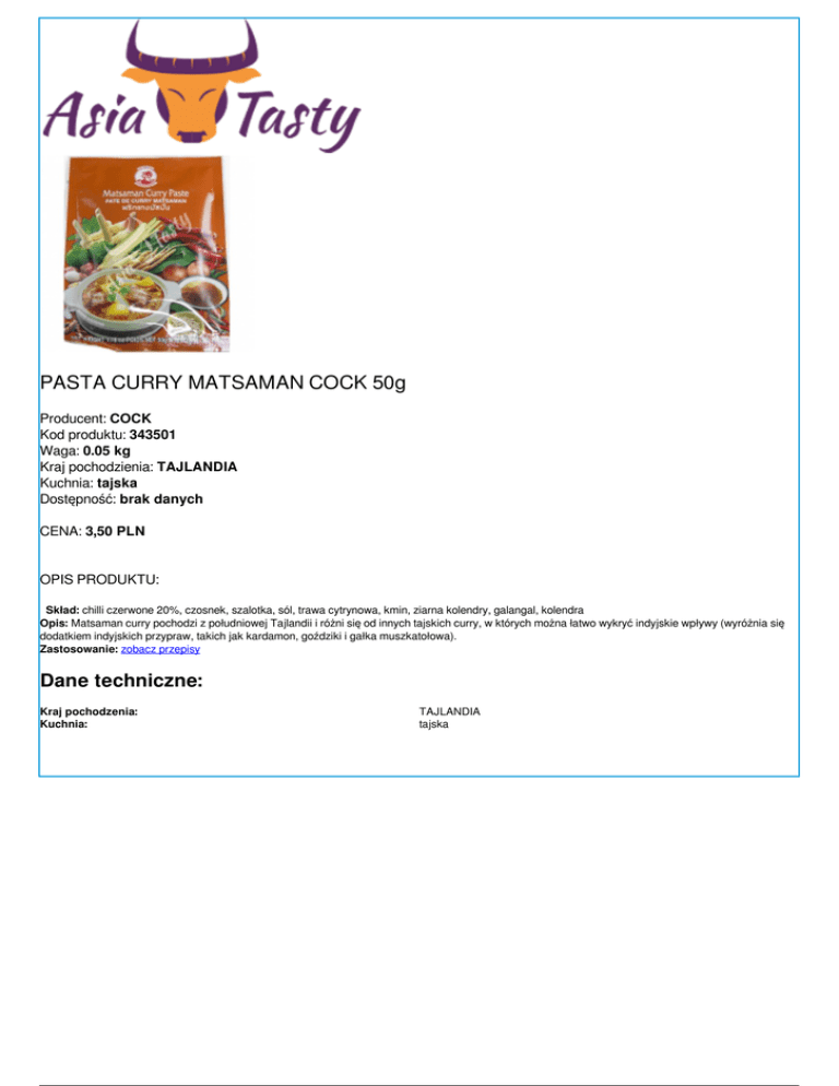PASTA CURRY MATSAMAN COCK 50g Producent: COCK Kod produktu: 343501 Waga: 0.05 kg Kraj pochodzienia: TAJLANDIA Kuchnia: tajska Dostępność: brak danych CENA: 3,50 PLN OPIS PRODUKTU: Skład: chilli czerwone 20%, czosnek, szalotka, sól, trawa cytrynowa, kmin, ziarna kolendry, galangal, kolendra Opis: Matsaman curry pochodzi z południowej Tajlandii i różni się od innych tajskich curry, w których można łatwo wykryć indyjskie wpływy (wyróżnia się dodatkiem indyjskich przypraw, takich jak kardamon, goździki i gałka muszkatołowa). Zastosowanie: zobacz przepisy Dane techniczne: Kraj pochodzenia: Kuchnia: Powered by TCPDF (www.tcpdf.org) TAJLANDIA tajska