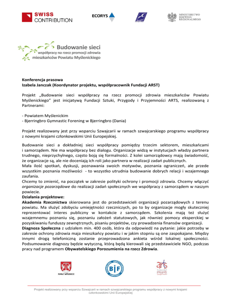 Konferencja prasowa Izabela Janczak (Koordynator projektu, współpracownik Fundacji ARST) Projekt „Budowanie sieci współpracy na rzecz promocji zdrowia mieszkańców Powiatu Myślenickiego” jest inicjatywą Fundacji Sztuki, Przygody i Przyjemności ARTS, realizowaną z Partnerami: - Powiatem Myślenickim - Bjerringbro Gymnastic Forening w Bjerringbro (Dania) Projekt realizowany jest przy wsparciu Szwajcarii w ramach szwajcarskiego programu współpracy z nowymi krajami członkowskimi Unii Europejskiej. Budowanie sieci a dokładniej sieci współpracy pomiędzy trzecim sektorem, mieszkańcami i samorządem. Nie ma współpracy bez dialogu. Organizacje widzą w instytucjach władzy partnera trudnego, nieprzychylnego, często boją się formalności. Z kolei samorządowcy mają świadomość, że organizacje są, ale nie doceniają ich roli jako partnera w realizacji zadań publicznych. Mała ilość spotkań, dyskusji, poznawania swoich motywów, poznania ograniczeń, ale przede wszystkim poznania możliwości - to wszystko utrudnia budowanie dobrych relacji i wzajemnego zaufania. Chcemy to zmienić, na początek w zakresie polityki ochrony i promocji zdrowia. Chcemy włączyć organizacje pozarządowe do realizacji zadań społecznych we współpracy z samorządem w naszym powiecie. Działania projektowe: Akademia Rzecznictwa skierowana jest do przedstawicieli organizacji pozarządowych z terenu powiatu. Ma służyć zdobyciu umiejętności rzeczniczych, po to by organizacje mogły skuteczniej reprezentować interes publiczny w kontakcie z samorządem. Szkolenia mają też służyć wzajemnemu poznaniu się, poznaniu założeń statutowych, jak również pomocy eksperckiej w pozyskiwaniu funduszy zewnętrznych, pisaniu projektów, czy prowadzenia finansów organizacji. Diagnoza Społeczna z udziałem min. 400 osób, która da odpowiedź na pytanie: jakie potrzeby w zakresie ochrony zdrowia maja mieszkańcy powiatu i w jakim stopniu są one zaspokajane. Między innymi drogą telefoniczną zostanie przeprowadzona ankieta wśród lokalnej społeczności. Podsumowanie diagnozy będzie wytyczną, którą będą kierowali się przedstawiciele NGO, podczas pracy nad programem Obywatelskiego Porozumienia na rzecz Zdrowia. Projekt realizowany przy wsparciu Szwajcarii w ramach szwajcarskiego programu współpracy z nowymi krajami członkowskimi Unii Europejskiej Obywatelskie Porozumienie na Rzecz Zdrowia da odpowiedz na pytanie jakim stopniu organizacje uczestniczą w realizacji celów obowiązującego Programu Ochrony Zdrowia. Organizacje z terenu powiatu myślenickiego uzupełniają działania sektora publicznego. Lokalny samorząd będzie mógł się zastanowić jakie dodatkowe działania mogą przejmować przedstawiciele NGO, na jakich obszarach można podjąć dodatkową współpracę. Organizacje działają bliżej ludzi, będą więc mogły reprezentować problemy mieszkańców z jakimi mają styczność podczas swojej działalności w obszarze zdrowia. Porozumienie będzie też próbą wypracowania przez władze samorządowe, przedstawicieli instytucji i NGO wspólnych założeń do Programu Ochrony Zdrowia, który w przyszłości ma zostać wdrożony w życie przez Starostwo Powiatowe w Myślenicach. Dni Zdrowia, podczas których udzielane będę przez specjalistów m.in. informacje dotyczące praw pacjenta i porady zdrowotne. Ponadto zostaną zorganizowane konkursy, zawody i wystawy związane z tematyką zdrowia. NGO, które włączą się w organizację, będą prezentować i promować swoją działalność na scenie i stoiskach. Zaplanowana jest także konferencja ekspercka z panelem dyskusyjnym dla instytucji zajmujących się promocją i ochroną zdrowia. Najbardziej aktywni uczestnicy AR i OPZ będą mieli możliwość uczestnictwa w wizycie studyjnej w organizacji partnerskiej w Danii, by przyjrzeć się wypracowanym modelom współpracy tamtejszych organizacji z sektorem publicznym. Współpracy ścisłej, wielokierunkowej i współpracy partnerskiej, ponieważ w Danii III sektor odgrywa bardzo dużą rolę w tworzeniu polityk publicznych. W projekcie przewidziane są filmy prezentujące aktywność obywatelską organizacji zaangażowanych w projekt. Filmy, mają także zachęcić mieszkańców do włączenia się i współdziałania z organizacjami, do zrzeszania się , oraz do zdobywania doświadczenia poprzez wolontariat. Często jest tak, że jeśli osoba zetknie z ogłoszeniem o pracy wolontariackiej następuje odwrót. Tymczasem aktywność w organizacjach, to najlepszy sposób aby odreagować, oderwać się od pracy czy nauki a jednocześnie nawiązywać nowe wartościowe kontakty. Bycie wolontariuszem to szansa na spełnienie swoich osobistych aspiracji, a także okazja do zdobycia doświadczenia. Wolontariat to pierwszy krok w stronę sukcesu, element układanki, z której budujemy swoją przyszłą karierę. A satysfakcja z możliwości pomagania innym sprawia, że początkowe wątpliwości szybko się rozwiewają. Podsumowanie rekrutacji. III sektor społeczny charakteryzuje się brakiem nastawienia na zysk i funkcjonuje niezależnie od I sektora jakim jest biznes i sektora II jakim jest państwo. Organizacje działające na terenie powiatu myślenickiego uzupełniają działania samorządu. Zarówno sektor publiczny jak sektor społeczny ma silne i słabe strony. Organy władzy za bardzo skupiają się na problemach związanych z szeroko rozumianą kontrolą w obszarze zdrowia. Organizacje działają bliżej ludzi, kładąc nacisk na więź społeczną, lepiej rozumieją problemy społeczne i niwelują słabe strony samorządu: biurokrację, małą elastyczność, brak bezpośredniego kontaktu z adresatem pomocy. Ale organizacje potrzebują wsparcia – gdyż często brak im doświadczenia, nie znają formuł prawnych, nie posiadają środków na rozwój działalności. Współdziałanie władz z sektorem społecznym zmniejszy słabości obu stron i pozwali na wy