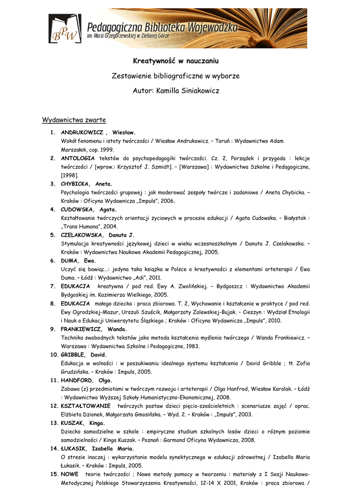 Kreatywność w nauczaniu Zestawienie bibliograficzne w wyborze