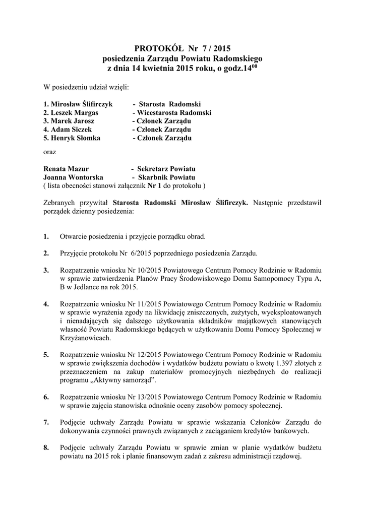 PROTOKÓŁ Nr 7 / 2015 posiedzenia Zarządu Powiatu Radomskiego z dnia 14 kwietnia 2015 roku, o godz.1400 W posiedzeniu udział wzięli: 1. Mirosław Ślifirczyk 2. Leszek Margas 3. Marek Jarosz 4. Adam Siczek 5. Henryk Słomka - Starosta Radomski - Wicestarosta Radomski - Członek Zarządu - Członek Zarządu - Członek Zarządu oraz Renata Mazur - Sekretarz Powiatu Joanna Wontorska - Skarbnik Powiatu ( lista obecności stanowi załącznik Nr 1 do protokołu ) Zebranych przywitał Starosta Radomski Mirosław Ślifirczyk. Następnie przedstawił porządek dzienny posiedzenia: 1. Otwarcie posiedzenia i przyjęcie porządku obrad. 2. Przyjęcie protokołu Nr 6/2015 poprzedniego posiedzenia Zarządu. 3. Rozpatrzenie wniosku Nr 10/2015 Powiatowego Centrum Pomocy Rodzinie w Radomiu w sprawie zatwierdzenia Planów Pracy Środowiskowego Domu Samopomocy Typu A, B w Jedlance na rok 2015. 4. Rozpatrzenie wniosku Nr 11/2015 Powiatowego Centrum Pomocy Rodzinie w Radomiu w sprawie wyrażenia zgody na likwidację zniszczonych, zużytych, wyeksploatowanych i nienadających się dalszego użytkowania składników majątkowych stanowiących własność Powiatu Radomskiego będących w użytkowaniu Domu Pomocy Społecznej w Krzyżanowicach. 5. Rozpatrzenie wniosku Nr 12/2015 Powiatowego Centrum Pomocy Rodzinie w Radomiu w sprawie zwiększenia dochodów i wydatków budżetu powiatu o kwotę 1.397 złotych z przeznaczeniem na zakup materiałów promocyjnych niezbędnych do realizacji programu „Aktywny samorząd”. 6. Rozpatrzenie wniosku Nr 13/2015 Powiatowego Centrum Pomocy Rodzinie w Radomiu w sprawie zajęcia stanowiska odnośnie oceny zasobów pomocy społecznej. 7. Podjęcie uchwały Zarządu Powiatu w sprawie wskazania Członków Zarządu do dokonywania czynności prawnych związanych z zaciąganiem kredytów bankowych. 8. Podjęcie uchwały Zarządu Powiatu w sprawie zmian w planie wydatków budżetu powiatu na 2015 rok i planie finansowym zadań z zakresu administracji rządowej. 9. Rozpatrzenie projektu uchwały Rady Powiatu w sprawie zaciągnięcia kredytu. 10. Rozpatrzenie wniosku Nr 2/2015 Wydziału Organizacji i Nadzoru w sprawie zwiększenia planu wydatków w rozdziale 15011 o kwotę 10.466,14 złotych (projekt BW) oraz zmniejszenia planu wydatków w rozdziale 75020 o kwotę 10.466,14 złotych. 11. Rozpatrzenie wniosku Nr 8/2015 Wydziału Edukacji w sprawie wysokości środków finansowych przeznaczonych na pomoc zdrowotną dla nauczycieli korzystających z opieki zdrowotnej i określenia rodzajów świadczeń w ramach tej pomocy oraz warunków i sposobów ich przyznawania. 12. Rozpatrzenie wniosku Nr 9/2015 Wydziału Edukacji w sprawie poszerzenia źródeł dochodów i wydatków na wydzielonym rachunku Centrum Kształcenia Zawodowego i Ustawicznego w Pionkach. 13. Rozpatrzenie wniosku Nr 10/2015 Wydziału Edukacji w sprawie propozycji zmian w zakresie wydzielonego rachunku dochodów na 2015 rok w Centrum Kształcenia Zawodowego i Ustawicznego w Pionkach oraz wydatków nimi finansowanych. 14. Rozpatrzenie wniosku Nr 7/2015 Wydziału Geodezji, Kartografii, Katastru i Nieruchomości w sprawie wyrażenia zgody na podział nieruchomości zabudowanej oznaczonej jako działka ewidencyjna Nr 426/23 o pow. 1,4863 ha stanowiącej własność Powiatu Radomskiego będącej w trwałym zarządzie Domu Pomocy Społecznej w Jedlance. 15. Rozpatrzenie wniosku Nr 6/2015 Wydziału Zdrowia i Spraw Społecznych w sprawie powołania składu osobowego Rady Społecznej przy Samodzielnym Publicznym Zespole Zakładów Opieki Zdrowotnej – Szpital w Iłży. 16. Rozpatrzenie wniosku Nr 1/2015 Powiatowego Zespołu ds. Orzekania o Niepełnosprawności w sprawie zwiększenia dochodów i wydatków w rozdziale 85321 o kwotę 41.750 złotych z przeznaczeniem na wypłaty nagród dla pracowników Zespołu. 17. Informacja Komendanta Miejskiego Państwowej Straży Pożarnej nt. stanu bezpieczeństwa obszaru miasta Radomia i Powiatu Radomskiego w zakresie ochrony przeciwpożarowej za 2014 rok. 18. Sprawy różne. W/w porządek dzienny posiedzenia został przyjęty jednogłośnie. Przystąpiono do realizacji 2 pktu porządku dziennego posiedzenia – przyjęcie protokołu Nr 6/2014 poprzedniego posiedzenia Zarządu. Protokół Nr 6/2014 poprzedniego posiedzenia Zarządu został przyjęty jednogłośnie, bez uwag. 2 Przystąpiono do realizacji 3 pktu porządku dziennego posiedzenia – rozpatrzenie wniosku Nr 10/2015 Powiatowego Centrum Pomocy Rodzinie w Radomiu w sprawie zatwierdzenia Planów Pracy Środowiskowego Domu Samopomocy Typu A, B w Jedlance na rok 2015. Starosta Radomski Mirosław Ślifirczyk poinformował, że wniosek PCPR dotyczy zatwierdzenia na rok bieżący Planów Pracy Środowiskowego Domu Samopomocy Typu A i B w Jedlance. Typ A jest dla osób przewlekle chorych psychicznie, typ B dla osób upośledzonych umysłowo. Poinformował, że zgodnie z ustawowym wymogiem treści w/w planów pracy zostały uzgodnione z wojewodą i uzyskały akceptację. W związku z tym wnioskuje o zatwierdzenie Planów Pracy Środowiskowego Domu Samopomocy Typu A, B w Jedlance na rok 2015. Zarząd Powiatu podjął uchwałę Nr 41/2015 w sprawie zatwierdzenia Planów Pracy Środowiskowego Domu Samopomocy Typu A, B w Jedlance na rok 2015, która stanowi załącznik Nr 2 do protokołu. Przystąpiono do realizacji 4 pktu porządku dziennego posiedzenia – rozpatrzenie wniosku Nr 11/2015 Powiatowego Centrum Pomocy Rodzinie w Radomiu w sprawie wyrażenia zgody na likwidację zniszczonych, zużytych, wyeksploatowanych i nienadających się dalszego użytkowania składników majątkowych stanowiących własność Powiatu Radomskiego będących w użytkowaniu Domu Pomocy Społecznej w Krzyżanowicach. Starosta Radomski Mirosław Ślifirczyk poinformował, że Komisja powołana przez Dyrektora DPS w Krzyżanowicach dokonała szczegółowego przeglądu i oceny stopnia zdolności użytkowej składników majątkowych będących na stanie jednostki