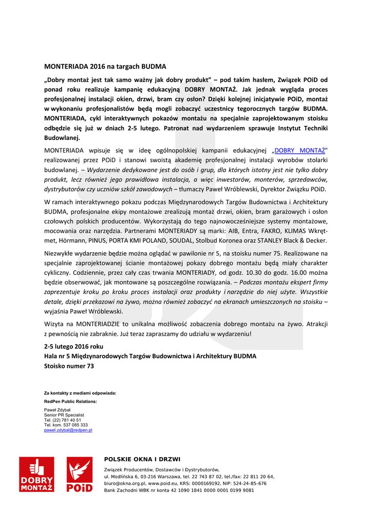 MONTERIADA 2016 na targach BUDMA „Dobry montaż jest tak samo ważny jak dobry produkt” – pod takim hasłem, Związek POiD od ponad roku realizuje kampanię edukacyjną DOBRY MONTAŻ. Jak jednak wygląda proces profesjonalnej instalacji okien, drzwi, bram czy osłon? Dzięki kolejnej inicjatywie POiD, montaż w wykonaniu profesjonalistów będą mogli zobaczyć uczestnicy tegorocznych targów BUDMA. MONTERIADA, cykl interaktywnych pokazów montażu na specjalnie zaprojektowanym stoisku odbędzie się już w dniach 2-5 lutego. Patronat nad wydarzeniem sprawuje Instytut Techniki Budowlanej. MONTERIADA wpisuje się w ideę ogólnopolskiej kampanii edukacyjnej „DOBRY MONTAŻ" realizowanej przez POiD i stanowi swoistą akademię profesjonalnej instalacji wyrobów stolarki budowlanej. – Wydarzenie dedykowane jest do osób i grup, dla których istotny jest nie tylko dobry produkt, lecz również jego prawidłowa instalacja, a więc inwestorów, monterów, sprzedawców, dystrybutorów czy uczniów szkół zawodowych – tłumaczy Paweł Wróblewski, Dyrektor Związku POiD. W ramach interaktywnego pokazu podczas Międzynarodowych Targów Budownictwa i Architektury BUDMA, profesjonalne ekipy montażowe zrealizują montaż drzwi, okien, bram garażowych i osłon czołowych polskich producentów. Wykorzystają do tego najnowocześniejsze systemy montażowe, mocowania oraz narzędzia. Partnerami MONTERIADY są marki: AIB, Entra, FAKRO, KLIMAS Wkrętmet, Hörmann, PINUS, PORTA KMI POLAND, SOUDAL, Stolbud Koronea oraz STANLEY Black & Decker. Niezwykłe wydarzenie będzie można oglądać w pawilonie nr 5, na stoisku numer 75. Realizowane na specjalnie zaprojektowanej ścianie montażowej pokazy dobrego montażu będą miały charakter cykliczny. Codziennie, przez cały czas trwania MONTERIADY, od godz. 10.30 do godz. 16.00 można będzie obserwować, jak montowane są poszczególne rozwiązania. – Podczas montażu ekspert firmy zaprezentuje kroku po kroku proces instalacji oraz produkty i narzędzie do niej użyte. Wszystkie detale, dzięki przekazowi na żywo, można również zobaczyć na ekranach umieszczonych na stoisku – wyjaśnia Paweł Wróblewski. Wizyta na MONTERIADZIE to unikalna możliwość zobaczenia dobrego montażu na żywo. Atrakcji z pewnością nie zabraknie. Już teraz zapraszamy do udziału w wydarzeniu! 2-5 lutego 2016 roku Hala nr 5 Międzynarodowych Targów Budownictwa i Architektury BUDMA Stoisko numer 73 Za kontakty z mediami odpowiada: RedPen Public Relations: Paweł Zdybał Senior PR Specialist Tel. (22) 781 40 51 Tel. kom. 537 085 333 [email protected]