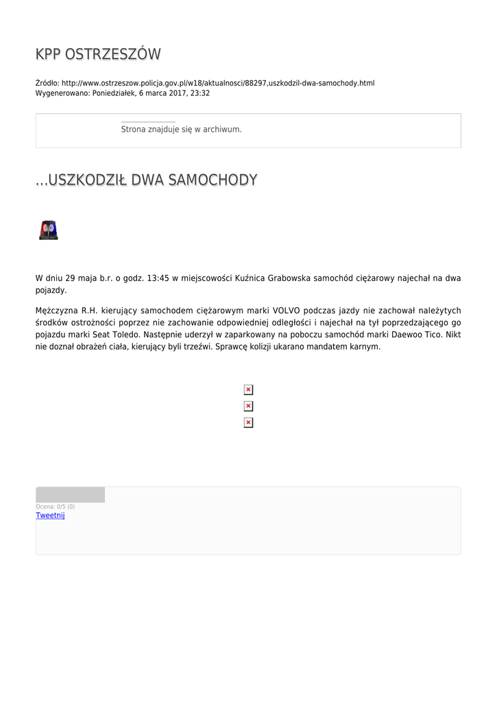 KPP OSTRZESZÓW Źródło: http://www.ostrzeszow.policja.gov.pl/w18/aktualnosci/88297,uszkodzil-dwa-samochody.html Wygenerowano: Poniedziałek, 6 marca 2017, 23:32 Strona znajduje się w archiwum. ...USZKODZIŁ DWA SAMOCHODY W dniu 29 maja b.r. o godz. 13:45 w miejscowości Kuźnica Grabowska samochód ciężarowy najechał na dwa pojazdy. Mężczyzna R.H. kierujący samochodem ciężarowym marki VOLVO podczas jazdy nie zachował należytych środków ostrożności poprzez nie zachowanie odpowiedniej odległości i najechał na tył poprzedzającego go pojazdu marki Seat Toledo. Następnie uderzył w zaparkowany na poboczu samochód marki Daewoo Tico. Nikt nie doznał obrażeń ciała, kierujący byli trzeźwi. Sprawcę kolizji ukarano mandatem karnym. Ocena: 0/5 (0) Tweetnij