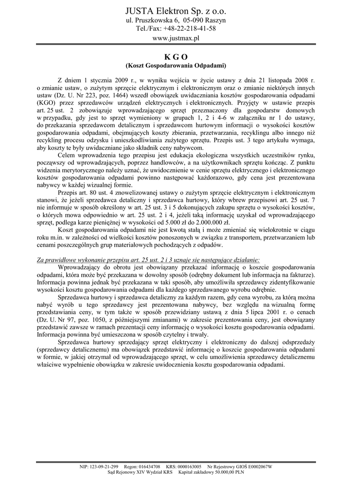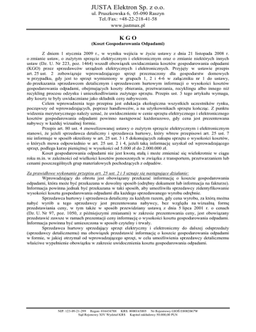 JUSTA Elektron Sp. z o.o. ul. Pruszkowska 6, 05-090 Raszyn Tel./Fax: +48-22-218-41-58 www.justmax.pl KGO (Koszt Gospodarowania Odpadami) Z dniem 1 stycznia 2009 r., w wyniku wejścia w życie ustawy z dnia 21 listopada 2008 r. o zmianie ustaw, o zużytym sprzęcie elektrycznym i elektronicznym oraz o zmianie niektórych innych ustaw (Dz. U. Nr 223, poz. 1464) wszedł obowiązek uwidaczniania kosztów gospodarowania odpadami (KGO) przez sprzedawców urządzeń elektrycznych i elektronicznych. Przyjęty w ustawie przepis art. 25 ust. 2 zobowiązuje wprowadzającego sprzęt przeznaczony dla gospodarstw domowych w przypadku, gdy jest to sprzęt wymieniony w grupach 1, 2 i 4-6 w załączniku nr 1 do ustawy, do przekazania sprzedawcom detalicznym i sprzedawcom hurtowym informacji o wysokości kosztów gospodarowania odpadami, obejmujących koszty zbierania, przetwarzania, recyklingu albo innego niż recykling procesu odzysku i unieszkodliwiania zużytego sprzętu. Przepis ust. 3 tego artykułu wymaga, aby koszty te były uwidaczniane jako składnik ceny nabywcom. Celem wprowadzenia tego przepisu jest edukacja ekologiczna wszystkich uczestników rynku, począwszy od wprowadzających, poprzez handlowców, a na użytkownikach sprzętu kończąc. Z punktu widzenia merytorycznego należy uznać, że uwidocznienie w cenie sprzętu elektrycznego i elektronicznego kosztów gospodarowania odpadami powinno następować każdorazowo, gdy cena jest prezentowana nabywcy w każdej wizualnej formie. Przepis art. 80 ust. 4 znowelizowanej ustawy o zużytym sprzęcie elektrycznym i elektronicznym stanowi, że jeżeli sprzedawca detaliczny i sprzedawca hurtowy, który wbrew przepisowi art. 25 ust. 7 nie informuje w sposób określony w art. 25 ust. 3 i 5 dokonujących zakupu sprzętu o wysokości kosztów, o których mowa odpowiednio w art. 25 ust. 2 i 4, jeżeli taką informację uzyskał od wprowadzającego sprzęt, podlega karze pieniężnej w wysokości od 5.000 zł do 2.000.000 zł. Koszt gospodarowania odpadami nie jest kwotą stałą i może zmieniać się wielokrotnie w ciągu roku m.in. w zależności od wielkości kosztów ponoszonych w związku z transportem, przetwarzaniem lub cenami poszczególnych grup materiałowych pochodzących z odpadów. Za prawidłowe wykonanie przepisu art. 25 ust. 2 i 3 uznaje się następujące działanie: Wprowadzający do obrotu jest obowiązany przekazać informację o koszcie gospodarowania odpadami, która może być przekazana w dowolny sposób (odrębny dokument lub informacja na fakturze). Informacja powinna jednak być przekazana w taki sposób, aby umożliwiła sprzedawcy zidentyfikowanie wysokości kosztu gospodarowania odpadami dla każdego sprzedawanego wyrobu odrębnie. Sprzedawca hurtowy i sprzedawca detaliczny za każdym razem, gdy cena wyrobu, za którą można nabyć wyrób u tego sprzedawcy jest prezentowana nabywcy, bez względu na wizualną formę przedstawiania ceny, w tym także w sposób przewidziany ustawą z dnia 5 lipca 2001 r. o cenach (Dz. U. Nr 97, poz. 1050, z późniejszymi zmianami) w zakresie prezentowania ceny, jest obowiązany przedstawić zawsze w ramach prezentacji ceny informację o wysokości kosztu gospodarowania odpadami. Informacja powinna być umieszczona w sposób czytelny i trwały. Sprzedawca hurtowy sprzedający sprzęt elektryczny i elektroniczny do dalszej odsprzedaży (sprzedawcy detalicznemu) ma obowiązek przedstawić informację o koszcie gospodarowania odpadami w formie, w jakiej otrzymał od wprowadzającego sprzęt, w celu umożliwienia sprzedawcy detalicznemu właściwe wypełnienie obowiązku w zakresie uwidocznienia kosztu gospodarowania odpadami. NIP: 123-09-21-299 Regon: 016434708 KRS: 0000163005 Nr Rejestrowy GIOŚ E0002067W Sąd Rejonowy XIV Wydział KRS Kapitał zakładowy 50.000,00 PLN