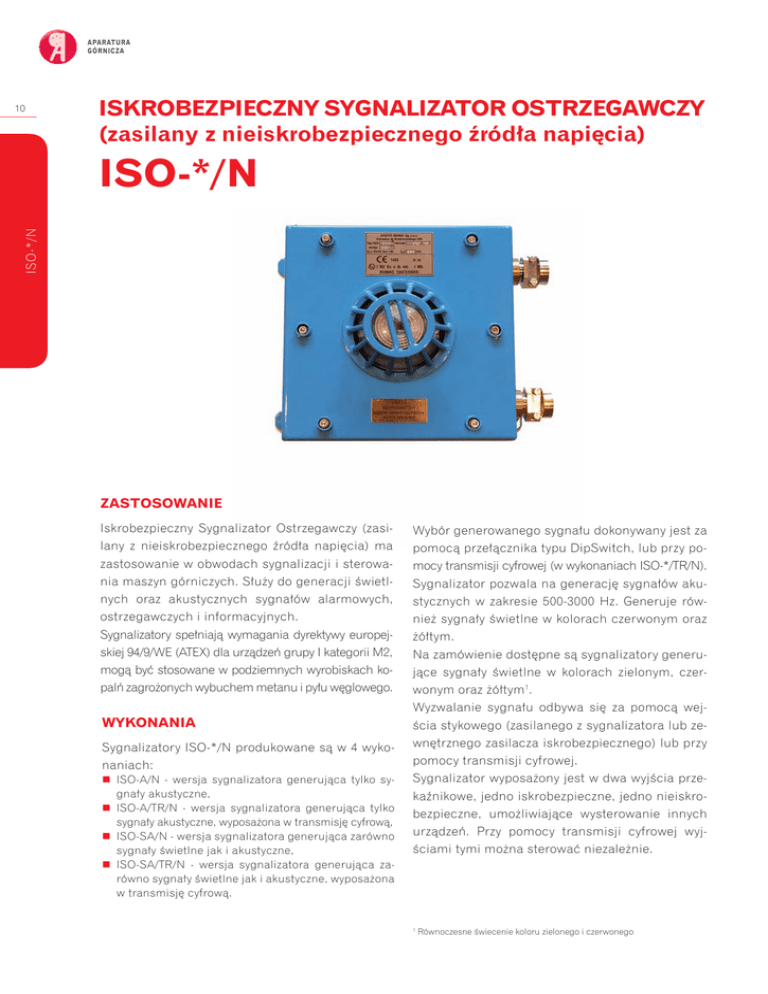 APARATURA GÓRNICZA 10 ISKROBEZPIECZNY SYGNALIZATOR OSTRZEGAWCZY (zasilany z nieiskrobezpiecznego źródła napięcia) ISO-*/N ISO-*/N ZASTOSOWANIE Iskrobezpieczny Sygnalizator Ostrzegawczy (zasilany z nieiskrobezpiecznego źródła napięcia) ma zastosowanie w obwodach sygnalizacji i sterowania maszyn górniczych. Służy do generacji świetlnych oraz akustycznych sygnałów alarmowych, ostrzegawczych i informacyjnych. Sygnalizatory spełniają wymagania dyrektywy europejskiej 94/9/WE (ATEX) dla urządzeń grupy I kategorii M2, mogą być stosowane w podziemnych wyrobiskach kopalń zagrożonych wybuchem metanu i pyłu węglowego. WYKONANIA Sygnalizatory ISO-*/N produkowane są w 4 wykonaniach: ISO-A/N - wersja sygnalizatora generująca tylko sygnały akustyczne, ISO-A/TR/N - wersja sygnalizatora generująca tylko sygnały akustyczne, wyposażona w transmisję cyfrową, ISO-SA/N - wersja sygnalizatora generująca zarówno sygnały świetlne jak i akustyczne, ISO-SA/TR/N - wersja sygnalizatora generująca zarówno sygnały świetlne jak i akustyczne, wyposażona w transmisję cyfrową. Wybór generowanego sygnału dokonywany jest za pomocą przełącznika typu DipSwitch, lub przy pomocy transmisji cyfrowej (w wykonaniach ISO-*/TR/N). Sygnalizator pozwala na generację sygnałów akustycznych w zakresie 500-3000 Hz. Generuje również sygnały świetlne w kolorach czerwonym oraz żółtym. Na zamówienie dostępne są sygnalizatory generujące sygnały świetlne w kolorach zielonym, czerwonym oraz żółtym1. Wyzwalanie sygnału odbywa się za pomocą wejścia stykowego (zasilanego z sygnalizatora lub zewnętrznego zasilacza iskrobezpiecznego) lub przy pomocy transmisji cyfrowej. Sygnalizator wyposażony jest w dwa wyjścia przekaźnikowe, jedno iskrobezpieczne, jedno nieiskrobezpieczne, umożliwiające wysterowanie innych urządzeń. Przy pomocy transmisji cyfrowej wyjściami tymi można sterować niezależnie. 1 Równoczesne świecenie koloru zielonego i czerwonego ENERGIA BEZPIECZNIE POŁĄCZONA Tabela 3. DANE TECHNICZNE 11 Typ ISO-*/N Napięcie zasilania: 24 ÷ 42 V a.c/d.c. Maksymalny pobór prądu (zasilanie 24 V a.c.): ISO-A/N, ISO-A/TR/N ISO-SA/N, ISO-SA/TR/N 150 mA 650 mA -20 °C÷40 °C ISO-*/N Zakres temperatur pracy 0,5 mm2÷4 mm2 Dopuszczalne przekroje przewodów łączeniowych Wymiary obudowy (z kompletem 4 wpustów): ISO-A/N, ISO-A/TR/N ISO-SA/N, ISO-SA/TR/N 320 x 244 x 138 mm 320 x 244 x 180 mm Stopień ochrony obudowy: IP 54 Znakowanie urządzeń: 1453 Nr certyfikatu I M2 Ex e ib mb I Mb KOMAG 12ATEX0055 Generowana częstotliwośc dźwięku: 500-3000 Hz Ciśnienie akustyczne generowanego dźwięku: Kolory generowanego światła: >90 dB czerwony, żółty, zielony (na zamówienie) 138 180 244 200 ± 0,5 WYMIARY 240 295 ~ 320 dla wykonania z 4-ma wpustami PRZYKŁAD ZAMÓWIENIA Iskrobezpieczny sygnalizator ostrzegawczy ISO-SA/N oznacza zamówienie sygnalizatora ostrzegawczego, generującego sygnały akustyczne i świetlne w kolorach czerwonym i źółtym.