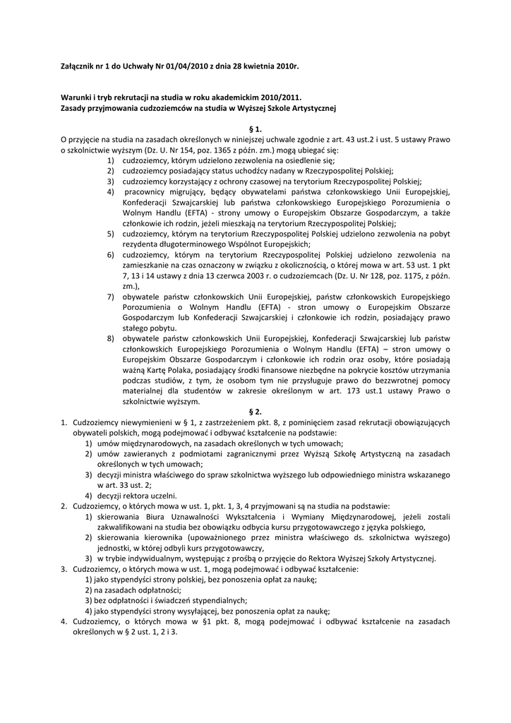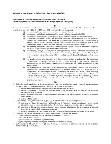 Załącznik nr 1 do Uchwały Nr 01/04/2010 z dnia 28 kwietnia 2010r. Warunki i tryb rekrutacji na studia w roku akademickim 2010/2011. Zasady przyjmowania cudzoziemców na studia w Wyższej Szkole Artystycznej § 1. O przyjęcie na studia na zasadach określonych w niniejszej uchwale zgodnie z art. 43 ust.2 i ust. 5 ustawy Prawo o szkolnictwie wyższym (Dz. U. Nr 154, poz. 1365 z późn. zm.) mogą ubiegać się: 1) cudzoziemcy, którym udzielono zezwolenia na osiedlenie się; 2) cudzoziemcy posiadający status uchodźcy nadany w Rzeczypospolitej Polskiej; 3) cudzoziemcy korzystający z ochrony czasowej na terytorium Rzeczypospolitej Polskiej; 4) pracownicy migrujący, będący obywatelami państwa członkowskiego Unii Europejskiej, Konfederacji Szwajcarskiej lub państwa członkowskiego Europejskiego Porozumienia o Wolnym Handlu (EFTA) - strony umowy o Europejskim Obszarze Gospodarczym, a także członkowie ich rodzin, jeżeli mieszkają na terytorium Rzeczypospolitej Polskiej; 5) cudzoziemcy, którym na terytorium Rzeczypospolitej Polskiej udzielono zezwolenia na pobyt rezydenta długoterminowego Wspólnot Europejskich; 6) cudzoziemcy, którym na terytorium Rzeczypospolitej Polskiej udzielono zezwolenia na zamieszkanie na czas oznaczony w związku z okolicznością, o której mowa w art. 53 ust. 1 pkt 7, 13 i 14 ustawy z dnia 13 czerwca 2003 r. o cudzoziemcach (Dz. U. Nr 128, poz. 1175, z późn. zm.), 7) obywatele państw członkowskich Unii Europejskiej, państw członkowskich Europejskiego Porozumienia o Wolnym Handlu (EFTA) - stron umowy o Europejskim Obszarze Gospodarczym lub Konfederacji Szwajcarskiej i członkowie ich rodzin, posiadający prawo stałego pobytu. 8) obywatele państw członkowskich Unii Europejskiej, Konfederacji Szwajcarskiej lub państw członkowskich Europejskiego Porozumienia o Wolnym Handlu (EFTA) – stron umowy o Europejskim Obszarze Gospodarczym i członkowie ich rodzin oraz osoby, które posiadają ważną Kartę Polaka, posiadający środki finansowe niezbędne na pokrycie kosztów utrzymania podczas studiów, z tym, że osobom tym nie przysługuje prawo do bezzwrotnej pomocy materialnej dla studentów w zakresie określonym w art. 173 ust.1 ustawy Prawo o szkolnictwie wyższym. § 2. 1. Cudzoziemcy niewymienieni w § 1, z zastrzeżeniem pkt. 8, z pominięciem zasad rekrutacji obowiązujących obywateli polskich, mogą podejmować i odbywać kształcenie na podstawie: 1) umów międzynarodowych, na zasadach określonych w tych umowach; 2) umów zawieranych z podmiotami zagranicznymi przez Wyższą Szkołę Artystyczną na zasadach określonych w tych umowach; 3) decyzji ministra właściwego do spraw szkolnictwa wyższego lub odpowiedniego ministra wskazanego w art. 33 ust. 2; 4) decyzji rektora uczelni. 2. Cudzoziemcy, o których mowa w ust. 1, pkt. 1, 3, 4 przyjmowani są na studia na podstawie: 1) skierowania Biura Uznawalności Wykształcenia i Wymiany Międzynarodowej, jeżeli zostali zakwalifikowani na studia bez obowiązku odbycia kursu przygotowawczego z języka polskiego, 2) skierowania kierownika (upoważnionego przez ministra właściwego ds. szkolnictwa wyższego) jednostki, w której odbyli kurs przygotowawczy, 3) w trybie indywidualnym, występując z prośbą o przyjęcie do Rektora Wyższej Szkoły Artystycznej. 3. Cudzoziemcy, o których mowa w ust. 1, mogą podejmować i odbywać kształcenie: 1) jako stypendyści strony polskiej, bez ponoszenia opłat za naukę; 2) na zasadach odpłatności; 3) bez odpłatności i świadczeń stypendialnych; 4) jako stypendyści strony wysyłającej, bez ponoszenia opłat za naukę; 4. Cudzoziemcy, o których mowa w §1 pkt. 8, mogą podejmować i odbywać kształcenie na zasadach określonych w § 2 ust. 1, 2 i 3. § 3. 1. Na studia pierwszego stopnia mogą być przyjmowani cudzoziemcy, którzy: 1) legitymują się polskim świadectwem dojrzałości albo zalegalizowanym lub opatrzonym apostille świadectwem lub innym dokumentem uzyskanym za granicą, uznanym, zgodnie z przepisami w sprawie nostryfikacji świadectw szkolnych i świadectw maturalnych uzyskanych za granicą lub na podstawie umowy międzynarodowej, za równoważny odpowiedniemu polskiemu świadectwu dojrzałości; 2) uzyskają pozytywny wynik rozmowy kwalifikacyjnej sprawdzającej predyspozycje do kształcenia na uczelni artystycznej. 2. Wykazują się dobrym stanem zdrowia, udokumentowanym zaświadczeniem lekarskim, stwierdzającym brak przeciwwskazań do podjęcia kształcenia na obranym kierunku i formie kształcenia; 3. Posiadają polisę ubezpieczeniową na wypadek choroby lub następstw nieszczęśliwych wypadków na okres kształcenia w Polsce albo Europejską Kartę Ubezpieczenia Zdrowotnego lub przystąpią do ubezpieczenia w Narodowym Funduszu Zdrowia niezwłocznie po rozpoczęciu kształcenia. 4. Ukończą roczny kurs przygotowawczy do podjęcia nauki w języku polskim w jednostkach wyznaczonych przez ministra właściwego do spraw szkolnictwa wyższego, 5. Posiadają certyfikat znajomości języka polskiego wydany przez Państwową Komisję Poświadczania Znajomości Języka Polskiego jako Obcego lub 6. Uzyskają potwierdzenie uczelni przyjmującej, że ich przygotowanie oraz stopień znajomości języka polskiego pozwalają na podjęcie studiów w języku polskim. § 4. Cudzoziemcy, którzy odbywają studia na zasadach odpłatności wnoszą opłaty zgodnie z Zarządzeniem Rektora w sprawie ustalenia wysokości opłat za naukę oraz innych opłat związanych z przebiegiem studiów stacjonarnych i niestacjonarnych w roku akademickim 2010/2011. § 5. Wymagane dokumenty: 1. w oryginale świadectwa lub dyplomy, o których mowa w § 3 ust. 1, pkt. 1 wraz z dokumentami legalizacyjnymi lub nostryfikacyjnymi – przetłumaczone na język polski przez tłumacza przysięgłego, 2. wypełnioną według ustalonego wzoru ankietę osobową wraz z podaniem o przyjęcie na studia, 3. kopię paszportu, wizy i innych dokumentów potwierdzający