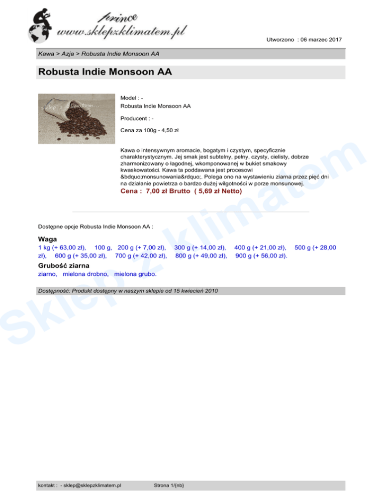 Utworzono : 06 marzec 2017 Kawa > Azja > Robusta Indie Monsoon AA Robusta Indie Monsoon AA Model : Robusta Indie Monsoon AA Producent : Cena za 100g - 4,50 zł m e t Kawa o intensywnym aromacie, bogatym i czystym, specyficznie charakterystycznym. Jej smak jest subtelny, pełny, czysty, cielisty, dobrze zharmonizowany o łagodnej, wkomponowanej w bukiet smakowy kwaskowatości. Kawa ta poddawana jest procesowi „monsunowania”. Polega ono na wystawieniu ziarna przez pięć dni na działanie powietrza o bardzo dużej wilgotności w porze monsunowej. a m Cena : 7,00 zł Brutto ( 5,69 zł Netto) Dostępne opcje Robusta Indie Monsoon AA : Waga z p 1 kg (+ 63,00 zł), 100 g, 200 g (+ 7,00 zł), zł), 600 g (+ 35,00 zł), 700 g (+ 42,00 zł), Grubość ziarna ziarno, mielona drobno, mielona grubo. e l k i l k 300 g (+ 14,00 zł), 800 g (+ 49,00 zł), Dostępność: Produkt dostępny w naszym sklepie od 15 kwiecień 2010 S kontakt : - [email protected] Strona 1/{nb} 400 g (+ 21,00 zł), 900 g (+ 56,00 zł). 500 g (+ 28,00