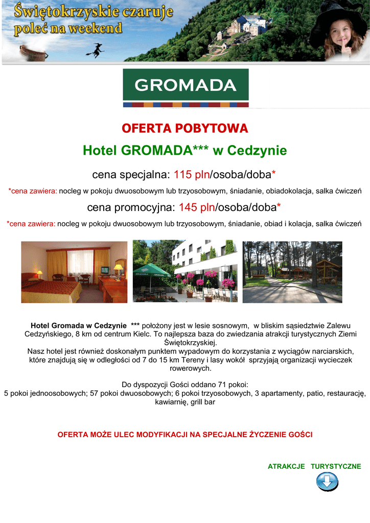 OFERTA POBYTOWA Hotel GROMADA*** w Cedzynie cena specjalna: 115 pln/osoba/doba* *cena zawiera: nocleg w pokoju dwuosobowym lub trzyosobowym, śniadanie, obiadokolacja, salka ćwiczeń cena promocyjna: 145 pln/osoba/doba* *cena zawiera: nocleg w pokoju dwuosobowym lub trzyosobowym, śniadanie, obiad i kolacja, salka ćwiczeń Hotel Gromada w Cedzynie *** połoŜony jest w lesie sosnowym, w bliskim sąsiedztwie Zalewu Cedzyńskiego, 8 km od centrum Kielc. To najlepsza baza do zwiedzania atrakcji turystycznych Ziemi Świętokrzyskiej. Nasz hotel jest równieŜ doskonałym punktem wypadowym do korzystania z wyciągów narciarskich, które znajdują się w odległości od 7 do 15 km Tereny i lasy wokół sprzyjają organizacji wycieczek rowerowych. Do dyspozycji Gości oddano 71 pokoi: 5 pokoi jednoosobowych; 57 pokoi dwuosobowych; 6 pokoi trzyosobowych, 3 apartamenty, patio, restaurację, kawiarnię, grill bar OFERTA MOśE ULEC MODYFIKACJI NA SPECJALNE śYCZENIE GOŚCI ATRAKCJE TURYSTYCZNE Mała Pętla Świętokrzyska - Święty KrzyŜ - według legendy opactwo benedyktyńskie załoŜył Bolesław Chrobry w 1006 r. Od XIV w. nazywane Świętym KrzyŜem, jako Ŝe przechowywane są tu relikwie drzewa KrzyŜa świętego, na którym miał umrzeć Jezus Chrystus. Odtąd stało się jednym z najwaŜniejszych polskich sanktuariów i celem licznych pielgrzymek. Święta Katarzyna - klasztor klarysek, Ciekoty (miejsce związane ze Stefanem śeromskim], Nowa Słupia – Muzeum StaroŜytnego Hutnictwa i Górnictwa Kielce - Pałac Biskupów – W centrum Kielc na Wzgórzu Zamkowym (ok. 280 m), znajduje się pałac biskupów krakowskich, jeden z najcenniejszych zabytków architektury w Polsce. Ten znakomicie zachowany obiekt jest przykładem rezydencji pałacowej o tradycjach obronnej budowli zamkowej. Obecnie mieszczą się tu zbiory kieleckiego Muzeum Narodowego, Amfiteatr Kadzielnia naturalnie wykuty w skale, Muzeum Zabawkarstwa, Klasztor Karczówka. Zamek w Chęcinach – z dala widoczne dla kaŜdego podróŜnego ruiny średniowiecznego zamczyska na szczycie góry. Nocą po jego murach błądzi Biała Dama…Jedna z legend mówi o skarbach pozostawionych w zamkowych lochach przez opuszczającą w pośpiechu Chęciny królową Bonę. Wyjechała ona do Włoch w 1556 roku, po trzydziestu ośmiu latach pobytu w Polsce, zabierając wiele złotych i srebrnych precjozów. Jak utrzymuje okoliczna ludność, pod cięŜarem kosztowności Bony załamał się przy przeprawie przez rzekę Nidę most. KrzyŜtopór - (dawniej Krzysztopór) zamek w miejscowości Ujazd, gmina Iwaniska. Budowany w latach 1627-1644 przez Krzysztofa Ossolińskiego, nigdy w pełni nie został ukończony. Jest to obszerny pałac w stylu włoskim typu palazzo in fortezza. Historia powstania zamku i jego świetności pozostaje wciąŜ nie do końca poznana. Jest to powodem do narastania wokół niego legend. Jedną z nich jest opowieść o zastosowaniu na zamku symboliki liczb nawiązującej do kalendarza: okien miał tyle, ile dni w roku, pokoi tyle, ile tygodni; sal wielkich tyle, ile miesięcy, a 4 naroŜne jego baszty odpowiadały liczbie kwartałów. Skansen Wsi Kieleckiej Tokarnia – 15 km od Kielc na trasie w kierunku Krakowa. Cudowne widoki na całą okolicę, arcyciekawe chaty, domy, zagroda z Ŝywymi zwierzętami gospodarskimi, prawdziwy młyn z wiatrakiem, stary drewniany kościółek, dwór szlachecki. Wszystko na duŜej otwartej przestrzeni na ukwieconych łąkach. Pysznie!!! Oblęgorek - to pałacyk i majątek ziemski, dar Narodu Polskiego na progu XX wieku dla Henryka Sienkiewicza. Miał tutaj siedzieć i pisać, tworzyć nowe arcydzieła na miarę Quo vadis ,czy Trylogii. Dąb Bartek - W okresie międzywojennym wiek tego dębu oceniano nawet na 1200 lat. Prawdziwy wiek jest niemoŜliwy do ustalenia, ze względu na spróchniały środek pnia. W 1934 sąd konkursowy pod przewodnictwem profesora Władysława Szafera uznał Bartka za "najokazalsze drzewo w Polsce". Jaskinia Raj – Jaskinia Raj jest typową jaskinią krasową rozwiniętą w wapieniach. Choć niewielka, wyróŜnia się wśród polskich jaskiń bogatą i dobrze zachowaną szatą naciekową. NaleŜy do nielicznych w kraju jaskiń oświetlonych elektrycznie (oświetlenie światłowodowe) i udostępnionych do zwiedzania . Kurozwęki – odbudowany pałac magnacki rodziny Popielów, znów zarządzany przez jednego z jej potomków hr. Marcina Popiela, który prowadzi jedyną w Polsce hodowlę bizonów. Jest tam teŜ mni-zoo (wiele ciekawych i egzotycznych zwierząt), stadnina koni, bryczki, piękne miejsce na całodzienny piknik z dziećmi. Odległość ok. 70 km od hotelu Bałtowski Park Jurajski - Park, w którym moŜna obejrzeć m.in. makiety dinozaurów w naturalnych wymiarach. ŚcieŜki spacerowe podzielone są na odcinki, które reprezentują kolejne epoki geologiczne Ziemi, od kambru, do momentu pojawienia się człowieka w neolicie. W chwili obecnej na terenie parku znajduje się około czterdziestu modeli dinozaurów (największy z nich to mierzący około 26 metrów długości diplodok, z okresu triasu, jury i kredy. Serdecznie zapraszamy
