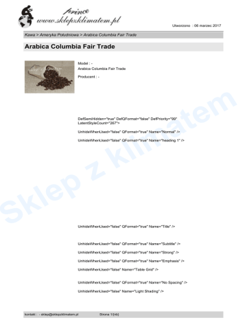 Utworzono : 06 marzec 2017 Kawa > Ameryka Południowa > Arabica Columbia Fair Trade Arabica Columbia Fair Trade Model : Arabica Columbia Fair Trade Producent : - i l k UnhideWhenUsed="false" QFormat="true" Name="Normal" /> UnhideWhenUsed="false" QFormat="true" Name="heading 1" /> S e l k z p UnhideWhenUsed="false" QFormat="true" Name="Title" /> UnhideWhenUsed="false" QFormat="true" Name="Subtitle" /> UnhideWhenUsed="false" QFormat="true" Name="Strong" /> UnhideWhenUsed="false" QFormat="true" Name="Emphasis" /> UnhideWhenUsed="false" Name="Table Grid" /> UnhideWhenUsed="false" QFormat="true" Name="No Spacing" /> UnhideWhenUsed="false" Name="Light Shading" /> kontakt : - [email protected] Strona 1/{nb} m e t a m DefSemiHidden="true" DefQFormat="false" DefPriority="99" LatentStyleCount="267"> Utworzono : 06 marzec 2017 Kawa > Ameryka Południowa > Arabica Columbia Fair Trade Arabica Columbia Fair Trade UnhideWhenUsed="false" Name="Light List" /> UnhideWhenUsed="false" Name="Light Grid" /> UnhideWhenUsed="false" Name="Medium Shading 1" /> UnhideWhenUsed="false" Name="Medium Shading 2" /> m e t UnhideWhenUsed="false" Name="Medium List 1" /> UnhideWhenUsed="false" Name="Medium List 2" /> a m UnhideWhenUsed="false" Name="Medium Grid 1" /> UnhideWhenUsed="false" Name="Medium Grid 2" /> i l k UnhideWhenUsed="false" Name="Medium Grid 3" /> UnhideWhenUsed="false" Name="Dark List" /> UnhideWhenUsed="false" Name="Colorful Shading" /> z p UnhideWhenUsed="false" Name="Colorful List" /> UnhideWhenUsed="false" Name="Colorful Grid" /> S e l k UnhideWhenUsed="false" Name="Light Shading Accent 1" /> UnhideWhenUsed="false" Name="Light List Accent 1" /> UnhideWhenUsed="false" Name="Light Grid Accent 1" /> UnhideWhenUsed="false" Name="Medium Shading 1 Accent 1" /> UnhideWhenUsed="false" Name="Medium Shading 2 Accent 1" /> UnhideWhenUsed="false" Name="Medium List 1 Accent 1" /> UnhideWhenUsed="false" QFormat="true" Name="List Paragraph" /> UnhideWhenUsed="false" QFormat="true" Name="Quote" /> UnhideWhenUsed="false" QFormat="true" Name="Intense Quote" /> UnhideWhenUsed="false" Name="Medium List 2 Accent 1" /> UnhideWhenUsed="false" Name="Medium Grid 1 Accent 1" /> UnhideWhenUsed="false" Name="Medium Grid 2 Accent 1" /> UnhideWhenUsed="false" Name="Medium Grid 3 Accent 1" /> UnhideWhenUsed="false" Name="Dark List Accent 1" /> kontakt : - [email protected] Strona 2/{nb} Utworzono : 06 marzec 2017 Kawa > Ameryka Południowa > Arabica Columbia Fair Trade Arabica Columbia Fair Trade UnhideWhenUsed="false" Name="Colorful Shading Accent 1" /> UnhideWhenUsed="false" Name="Colorful List Accent 1" /> UnhideWhenUsed="false" Name="Colorful Grid Accent 1" /> UnhideWhenUsed="false" Name="Light Shading Accent 2" /> m e t UnhideWhenUsed="false" Name="Light List Accent 2" /> UnhideWhenUsed="false" Name="Light Grid Accent 2" /> a m UnhideWhenUsed="false" Name="Medium Shading 1 Accent 2" /> UnhideWhenUsed="false" Name="Medium Shading 2 Accent 2" /> i l k UnhideWhenUsed="false" Name="Medium List 1 Accent 2" /> UnhideWhenUsed="false" Name="Medium List 2 Accent 2" /> UnhideWhenUsed="false" Name="Medium Grid 1 Accent 2" /> z p UnhideWhenUsed="false" Name="Medium Grid 2 Accent 2" /> UnhideWhenUsed="false" Name="Medium Grid 3 Accent 2" /> S e l k UnhideWhenUsed="false" Name="Dark List Accent 2" /> UnhideWhenUsed="false" Name="Colorful Shading Accent 2" /> UnhideWhenUsed="false" Name="Colorful List Accent 2" /> UnhideWhenUsed="false" Name="Colorful Grid Accent 2" /> UnhideWhenUsed="false" Name="Light Shading Accent 3" /> UnhideWhenUsed="false" Name="Light List Accent 3" /> UnhideWhenUsed="false" Name="Light Grid Accent 3" /> UnhideWhenUsed="false" Name="Medium Shading 1 Accent 3" /> UnhideWhenUsed="false" Name="Medium Shading 2 Accent 3" /> UnhideWhenUsed="false" Name="Medium List 1 Accent 3" /> UnhideWhenUsed="false" Name="Medium List 2 Accent 3" /> UnhideWhenUsed="false" Name="Medium Grid 1 Accent 3" /> UnhideWhenUsed="false" Name="Medium Grid 2 Accent 3" /> UnhideWhenUsed="false" Name="Medium Grid 3 Accent 3" /> UnhideWhenUsed="false" Name="Dark List Accent 3" /> kontakt : - [email protected] Strona 3/{nb} Utworzono : 06 marzec 2017 Kawa > Ameryka Południowa > Arabica Columbia Fair Trade Arabica Columbia Fair Trade UnhideWhenUsed="false" Name="Colorful Shading Accent 3" /> UnhideWhenUsed="false" Name="Colorful List Accent 3" /> UnhideWhenUsed="false" Name="Colorful Grid Accent 3" /> m e t UnhideWhenUsed="false" Name="Light Shading Accent 4" /> UnhideWhenUsed="false" Name="Light List Accent 4" /> UnhideWhenUsed="false" Name="Light Grid Accent 4" /> a m UnhideWhenUsed="false" Name="Medium Shading 1 Accent 4" /> UnhideWhenUsed="false" Name="Medium Shading 2 Accent 4" /> i l k UnhideWhenUsed="false" Name="Medium List 1 Accent 4" /> UnhideWhenUsed="false" Name="Medium List 2 Accent 4" /> UnhideWhenUsed="false" Name="Medium Grid 1 Accent 4" /> z p UnhideWhenUsed="false" Name="Medium Grid 2 Accent 4" /> UnhideWhenUsed="false" Name="Medium Grid 3 Accent 4" /> S e l k UnhideWhenUsed="false" Name="Dark List Accent 4" /> UnhideWhenUsed="false" Name="Colorful Shading Accent 4" /> UnhideWhenUsed="false" Name="Colorful List Accent 4" /> UnhideWhenUsed="false" Name="Colorful Grid Accent 4" /> UnhideWhenUsed="false" Name="Light Shading Accent 5" /> UnhideWhenUsed="false" Name="Light List Accent 5" /> UnhideWhenUsed="false" Name="Light Grid Accent 5" /> UnhideWhenUsed="false" Name="Medium Shading 1 Accent 5" /> UnhideWhenUsed="false" Name="Medium Shading 2 Accent 5" /> UnhideWhenUsed="false" Name="Medium List 1 Accent 5" /> UnhideWhenUsed="false" Name="Medium List 2 Accent 5" /> UnhideWhenUsed="false" Name="Medium Grid 1 Accent 5" /> UnhideWhenUsed="false" Name="Medium Grid 2 Accent 5" /> UnhideWhenUsed="false" Name="Medium Grid 3 Accent 5" /> kontakt : - [email protected] Strona 4/{nb} Utworzono : 06 marzec 2017 Kawa > Ameryka Południowa > Arabica Columbia Fair Trade Arabica Columbia Fair Trade UnhideWhenUsed="false" Name="Dark List Accent 5" /> Un