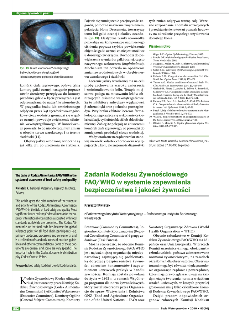Higiena żywności i pasz Ryc. 13. Jaskra wrodzona u 2-miesięcznego źrebięcia, widoczny obrzęk rogówki i charakterystyczne pęknięcia błony Descemeta komórki ciała rzęskowego, opływa tylną komorę gałki ocznej, następnie poprzez otwór źreniczny przepływa do komory przedniej, gdzie w kącie przesączania jest odprowadzana do naczyń krwionośnych. W przypadku braku lub zmniejszonego odpływu przez kąt tęczówkowo-rogówkowy ciecz wodnista gromadzi się w gałce ocznej i powoduje zwiększenie ciśnienia wewnątrzgałkowego. W konsekwencji prowadzi to do nieodwracalnych zmian w obrębie nerwu wzrokowego i na terenie siatkówki (11). Objawy jaskry wrodzonej widoczne są już kilka dni po urodzeniu się źrebięcia. The tasks of Codex Alimentarius FAO/WHO in the system of assurance of food safety and quality Kwiatek K. National Veterinary Research Institute, Pulawy This article gives the brief overview of the structure and activity of the Codex Alimentarius Commission FAO/WHO in the field of food safety and quality. Most significant issues making Codex Alimentarius the superior international organization associated with food standards worldwide are presented. The Codex Alimentarius or the food code has become the global reference point for all food chain participants (e.g. primary producers, processors and consumers), and is a collection of standards, codes of practice, guidelines and other recommendations. Some of these documents are general and some are very specific. The important role in the Codex documents distribution play Codex Contact Points. Keywords: food safety, food chain, world food standards. K odeks Żywnościowy (Codex Alimentarius) jest tworzony przez Komisję Kodeksu Żywnościowego (Codex Alimentarius Commision) i jej Komitet Wykonawczy (Executive Committee), Komitety Ogólne (General Subject Committees), Komitety 852 Pojawia się zmniejszenie przejrzystości rogówki, potoczne nazywane zmętnieniem, pęknięcia błony Descemeta, towarzyszy temu ból gałki ocznej i okolicy oczodołu (ryc. 13). Elastyczne tkanki noworodka pozwalają na kompensację nadmiernego ciśnienia poprzez szybkie powiększenie objętości gałki ocznej, co nie jest możliwe u dorosłego zwierzęcia. Dochodzi do powiększenia wymiarów gałki ocznej, często nazywanego wolooczem (buphthalmos). Mechanizm ten pozwala na opóźnienie zmian zwyrodnieniowych w obrębie nerwu wzrokowego i siatkówki. Leczenie jaskry wrodzonej ma na celu próbę zachowania wzroku zwierzęcia i zminimalizowanie bólu. Terapia miejscowa polega na stosowaniu leków obniżających ciśnienie wewnątrzgałkowe. Są to inhibitory anhydrazy węglanowej, β-adrenolityki oraz pochodne prostaglandyn. Przy braku efektów leczenia farmakologicznego zaleca się wykonanie cyklokrioablacji, cyklofotoablacji lub ablacji chemicznej. Zabiegi te polegają na zniszczeniu komórek ciała rzęskowego, co prowadzi do zmniejszenia produkcji cieczy wodnistej. Wady wrodzone narządu wzroku stanowią niewielki odsetek chorób oczu występujących u koni, ale znajomość diagnostyki tych zmian odgrywa ważną rolę. Wczesne rozpoznanie anomalii rozwojowych i przedstawienie rokowań pozwala hodowcy na określenie przyszłego użytkowania dorosłego konia. Piśmiennictwo 1. Gilger B.C.: Equine Ophthalmology, Elsevier, 2005. 2. Brooks D.E.: Ophthalmology for the Equine Practitioner, Teton NewMedia, 2002 3. Maggs D.J., Miller P.E., Ofri R.: Slatter’s Fundamentals of Veterinary Ophthalmology, Elsevier, 2008. 4. Gelatt K.N.: Veterinary Ophthalmology, Lippincott Williams & Wilkins, 1991. 5. Roberts S.M.: Congenital ocular anomalies. Vet. Clin. North Am. Equine Pract. 1992, 8, 459-478. 6. Turner A.G.: Ocular conditions of neonatal foals. Vet. Clin. North Am. Equine Pract. 2004, 20, 429-440. 7. Grahn B.H., Pinard C., Archer S., Bellone R., Forsyth G., Sandmeyer L.S.: Congenital ocular anomalies in purebred and crossbred Rocky and Kentucky Mountain horses in Canada. Can. Vet. J. 2008, 49, 675–681. 8. Ramsey D.T., Ewart S.L., Render J.A., Cook C.S., Latimer C.A.: Congenital ocular abnormalities of Rocky Mountain horses. Vet. Ophalmol. 1999, 2, 47-59. 9. Beech J., Irby N.: Inherited nuclear cataracts in the Morgan horse. J. Heredity 1985, 7, 371-372. 10. Walde I.: Some observations on congenital cataracts in the horse. Equine Vet. J. 2010, 15(S2), 27-28. 11. Ollivier F., Monclin S.: Equine glaucomas. Equine Vet. Educ. 2010, 22, 299-305. Lekarz wet. Marta Warzecha, Centrum Zdrowia Konia, Psucin, ul. Lipowa 37, 05-190 Legionowo Zadania Kodeksu Żywnościowego FAO/WHO w systemie zapewnienia bezpieczeństwa i jakości żywności Krzysztof Kwiatek z Państwowego Instytutu Weterynaryjnego – Państwowego Instytutu Badawczego w Puławach Branżowe (Commodity Committees), Regionalne Komitety Koordynacyjne (Regional Coordinating Committees) i grupy zadaniowe (Task Forces). Można stwierdzić, że obecnie Komisja Kodeksu Żywnościowego FAO/WHO jest najważniejszą organizacją międzynarodową zajmującą się problematyką dotyczącą bezpieczeństwa żywności, zdrowiem konsumentów i zapewnieniem uczciwych praktyk w handlu żywnością. Komisja została powołana do życia w 1963 r. w ramach Wspólnego programu dla norm żywnościowych, który został stworzony przez Organizację do spraw Wyżywienia i Rolnictwa ONZ (Food and Agriculture Organization of the United Nations – FAO) oraz Światową Organizację Zdrowia (World Health Organization – WHO). Obecnie członkostwo w Komisji Kodeksu Żywnościowego FAO/WHO ma 181 państw oraz Unia Europejska. W pracach Komisji uczestniczyć mogą, obok państw członkowskich, państwa zainteresowane normami żywnościowymi, na zasadach określonych dla obserwatorów. Obserwatorami mogą być również międzynarodowe organizacje rządowe i pozarządowe, które mają prawo zgłaszać uwagi na każdym etapie tworzenia norm, z wyjątkiem ustaleń końcowych, w których przywilej głosowania mają tylko czł