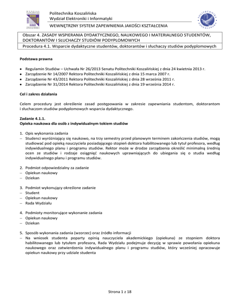 Politechnika Koszalińska Wydział Elektroniki i Informatyki WEWNĘTRZNY SYSTEM ZAPEWNIENIA JAKOŚCI KSZTAŁCENIA Obszar 4. ZASADY WSPIERANIA DYDAKTYCZNEGO, NAUKOWEGO I MATERIALNEGO STUDENTÓW, DOKTORANTÓW I SŁUCHACZY STUDIÓW PODYPLOMOWYCH Procedura 4.1. Wsparcie dydaktyczne studentów, doktorantów i słuchaczy studiów podyplomowych Podstawa prawna Regulamin Studiów – Uchwała Nr 26/2013 Senatu Politechniki Koszalińskiej z dnia 24 kwietnia 2013 r. Zarządzenie Nr 14/2007 Rektora Politechniki Koszalińskiej z dnia 15 marca 2007 r. Zarządzenie Nr 43/2011 Rektora Politechniki Koszalińskiej z dnia 28 września 2011 r. Zarządzenie Nr 31/2014 Rektora Politechniki Koszalińskiej z dnia 19 września 2014 r. Cel i zakres działania Celem procedury jest określenie zasad postępowania w zakresie zapewniania studentom, doktorantom i słuchaczom studiów podyplomowych wsparcia dydaktycznego. Zadanie 4.1.1. Opieka naukowa dla osób z indywidualnym tokiem studiów 1. Opis wykonania zadania Studenci wyróżniający się naukowo, na trzy semestry przed planowym terminem zakończenia studiów, mogą studiować pod opieką nauczyciela posiadającego stopień doktora habilitowanego lub tytuł profesora, według indywidualnego planu i programu studiów. Rektor może w drodze zarządzenia określić minimalną średnią ocen ze studiów i rodzaje osiągnięć naukowych uprawniających do ubiegania się o studia według indywidualnego planu i programu studiów. 2. Podmiot odpowiedzialny za zadanie Opiekun naukowy Dziekan 3. Podmiot wykonujący określone zadanie Student Opiekun naukowy Rada Wydziału 4. Podmioty monitorujące wykonanie zadania Opiekun naukowy Dziekan 5. Sposób wykonania zadania (wzorzec) oraz źródło informacji Na wniosek studenta poparty opinią nauczyciela akademickiego (opiekuna) ze stopniem doktora habilitowanego lub tytułem profesora, Rada Wydziału podejmuje decyzję w sprawie powołania opiekuna naukowego oraz zatwierdzenia indywidualnego planu i programu studiów, który wcześniej opracowuje opiekun naukowy przy udziale studenta Strona 1 z 18 Politechnika Koszalińska Wydział Elektroniki i Informatyki WEWNĘTRZNY SYSTEM ZAPEWNIENIA JAKOŚCI KSZTAŁCENIA Obszar 4. ZASADY WSPIERANIA DYDAKTYCZNEGO, NAUKOWEGO I MATERIALNEGO STUDENTÓW, DOKTORANTÓW I SŁUCHACZY STUDIÓW PODYPLOMOWYCH Procedura 4.1. Wsparcie dydaktyczne studentów, doktorantów i słuchaczy studiów podyplomowych 6. Dokumentacja związana z realizacją zadania Wniosek studenta, opinia nauczyciela akademickiego (opiekuna) ze stopniem doktora habilitowanego lub tytułem profesora. Indywidualny plan i program studiów powołany opiekun naukowego zatwierdzony przez Radę Wydziału 7. Termin wykonania zadania Trzy semestry przed planowym terminem zakończenia studiów Zadanie 4.1.2. Indywidualna organizacja kursów 1. Opis wykonania zadania Studenci znajdujący się w szczególnej sytuacji życiowej mogą ubiegać się o indywidualną organizację kursów w semestrze 2. Podmiot odpowiedzialny za zadanie Dziekan 3. Podmiot wykonujący określone zadanie Student Nauczyciele akademicy realizujący kursy w semestrze Dziekan 4. Podmioty monitorujące wykonanie zadania Dziekan Prorektor ds. Kształcenia 5. Sposób wykonania zadania (wzorzec) oraz źródło informacji Student składa wniosek z niezbędną dokumentacją uprawniającą go do ubiegania się o ten tryb studiów oraz dołącza zasady i plan organizacji studiów uzgodnionych z prowadzącymi poszczególne kursy. Decyzję na semestr wydaje Dziekan a w szczególnych przypadkach po akceptacji Prorektora ds. Kształcenia. 6. Dokumentacja związana z realizacją zadania Wniosek studenta wraz z niezbędną dokumentacją, zasady i plan organizacji studiów uzgodnionymi z przewodzącymi kursy i decyzja Dziekana 7. Termin wykonania zadania Przed rozpoczęciem semestru lub trakcie trwania semestru w wyjątkowych sytuacjach Strona 2 z 18 Politechnika Koszalińska Wydział Elektroniki i Informatyki WEWNĘTRZNY SYSTEM ZAPEWNIENIA JAKOŚCI KSZTAŁCENIA Obszar 4. ZASADY WSPIERANIA DYDAKTYCZNEGO, NAUKOWEGO I MATERIALNEGO STUDENTÓW, DOKTORANTÓW I SŁUCHACZY STUDIÓW PODYPLOMOWYCH Procedura 4.1. Wsparcie dydaktyczne studentów, doktorantów i słuchaczy studiów podyplomowych Zadanie 4.1.3. Wsparcie osób niepełnosprawnych realizowane przez opiekuna powołanego przez Dziekana 1. Opis wykonania zadania Dostosowanie organizacji i realizacji procesu dydaktycznego, w tym dostosowanie warunków odbywania studiów przez studentów niepełnosprawnych 2. Podmiot odpowiedzialny za zadanie Dziekan 3. Podmiot wykonujący określone zadanie Pełnomocnik Dziekana ds. Studentów Niepełnosprawnych 4. Podmioty monitorujące wykonanie zadania Rada Wydziału Samorząd Studentów Pełnomocnik Rektora ds. Studentów Niepełnosprawnych Dziekan 5. Sposób wykonania zadania (wzorzec) oraz źródło informacji Powołanie przez Dziekana Pełnomocnika ds. Studentów Niepełnosprawnych Przedstawienie, przez Pełnomocnika, zgłoszonych przez studentów, szczególnych potrzeb w zakresie organizacji i realizacji procesu dydaktycznego, w tym dostosowanie warunków odbywania studiów do rodzaju niepełnosprawności Określenie przez Dziekana i za zgodą prowadzącego zajęcia form wsparcia 6. Dokumentacja związana z realizacją zadania Opis szczególnych i oczekiwanych potrzeb studenta w zakresie organizacji procesu dydaktycznego; w tym warunków odbywania studiów Dokumenty potwierdzające rodzaj niepełnosprawności Zgoda Dziekana na określone formy wsparcia 7. Termin wykonania zadania Po złożeniu wniosku przez studenta Zadanie 4.1.4. Wsparcie studenta niepełnosprawnego realizowane przez opiekuna indywidualnego 1. Opis wykonania zadania Zapewnienie odpowiednich warunków odbywania i zaliczania zajęć przy uwzględnieniu stopnia niesprawności studenta i możliwości Wydziału wraz z możliwością powołania indywidualnego opiekuna studenta 2. Podmiot odpowiedzialny za zadanie Dziekan Strona 3 