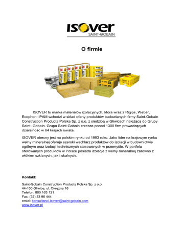 O firmie ISOVER to marka materiałów izolacyjnych, która wraz z Rigips, Weber, Ecophon i PAM wchodzi w skład oferty produktów budowlanych firmy Saint-Gobain Construction Products Polska Sp. z o.o. z siedzibą w Gliwicach należącą do Grupy Saint- Gobain. Grupa Saint-Gobain zrzesza ponad 1300 firm prowadzących działalność w 64 krajach świata. ISOVER obecny jest na polskim rynku od 1993 roku. Jako lider na krajowym rynku wełny mineralnej oferuje szeroki wachlarz produktów do izolacji w budownictwie ogólnym oraz izolacji technicznych stosowanych w przemyśle. W portfelu oferowanych produktów w Polsce posiada izolacje z wełny mineralnej zarówno z włókien szklanych, jak i skalnych. Kontakt: Saint-Gobain Construction Products Polska Sp. z o.o. 44-100 Gliwice, ul. Okrężna 16 Telefon: 800 163 121 Fax: (32) 33 96 444 emial: [email protected] www.isover.pl