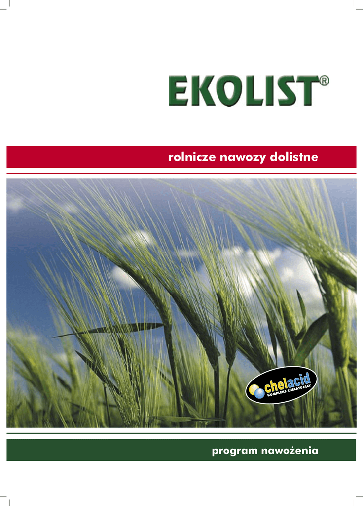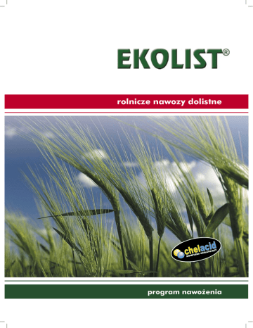 rolnicze nawozy dolistne program nawożenia Uznana marka wysokiej jakości nawozów dolistnych makro- i mikroelementowych stosowanych do dokarmiania roślin rolniczych, sadowniczych i ogrodniczych. EKOLIST zawiera w swoim składzie całkowicie przyswajalne mikroelementy ze specjalnie opracowanym kompleksem chelatującym – chelacid. Chelacid jest nowym kompleksem mikroelementów schelatowanych związkiem EDTA i kwasami organicznymi. Zapewnia szybkie i bezpieczne wchłanianie mikroelementów do komórek liści, czyniąc nawożenie dolistne najlepszym i najszybszym sposobem uzupełnienia mikroelementów. EKOLIST Standard - N (122 g/l), K2O (73 g/l), MgO (33 g/l) - uniwersalny nawóz wieloskładnikowy z wysoką zawartością mikroelementów do dolistnego nawożenia wszystkich roślin użytkowych. Optymalne proporcje składników z dodatkiem kompleksu chelatującego - chelacid zapewniają wysoką skuteczność plonotwórczą nawozu i właściwości wzmacniające odporność roślin. EKOLIST MIKRO U, Z, RB, K, Zm, S, T - wysoko skoncentrowane nawozy magnezowo-mikroelementowe z podwyższoną zawartością siarki, przeznaczone do upraw intensywnych z wysokim nawożeniem doglebowym (zboża, rzepak, buraki cukrowe, kukurydza, ziemniaki oraz rośliny strączkowe i tytoń). Dzięki zawartości mikroelementów w postaci kompleksu chelatującego - chelacid stymulują rozwój i wzmacniają odporność roślin, podnoszą ilość i jakość plonu (MTZ, zawartość białka, cukrów i witamin). EKOLIST Wapniowy - N (115 g/l), MgO (36 g/l), CaO (200 g/l) - dolistny i doglebowy, bezchlorkowy koncentrat nawozowy wapnia z azotem, magnezem i kompletem schelatowanych mikroelementów. Stosowany jako podstawowe źródło wapnia w uprawach sadowniczych i ogrodniczych. W uprawach rolniczych skutecznie zapobiega niedoborom wapnia na glebach kwaśnych i świeżo wapnowanych. EKOLIST PK-1 - P2O5 (117 g/l), K2O (247 g/l) - koncentrat fosforowo-potasowy. Niezbędny przy niskim nawożeniu doglebowym i w okresach stresowych (chłody, susze, wysokie zakwaszenie gleby), w których odżywianie korzeniowe zostaje ograniczone. Stosowany jesienią na uprawach ozimych, podnosi odporność roślin na wymarzanie. EKOLIST P fosforowy - N (105 g/l), P2O5 (504 g/l) - skoncentrowany nawóz fosforowy z azotem i mikroelementami do nawożenia kukurydzy, strączkowych, zbóż, ziemniaków, sadów owocowych i innych roślin rolniczych i ogrodniczych. Zapobiega powstawaniu niedoborów fosforu, boru i cynku oraz likwiduje ich objawy (fioletowe zabarwienie liści, słabo rozwinięty system korzeniowy i inne). EKOLIST MAKRO 35+Mg - N (350 g/l), MgO (47 g/l) - koncentrat azotowo-magnezowo-mikroelementowy do nawożenia wszystkich upraw o wysokim potencjale plonotwórczym. Dzięki wysokiej zawartości łatwo przyswajalnego azotu, magnezu i manganu silnie stymuluje wzrost i rozwój roślin. EKOLIST MAKRO 12-4-7 - N (145 g/l), P2O5 (48 g/l), K2O (85 g/l) - koncentrat makroelementowy z dodatkiem mikroelementów. Optymalne proporcje i formy N-P-K zapewniają skuteczne odżywienie wszystkich roślin uprawnych. EKOLIST MAKRO 6-12-7 - N (75 g/l), P2O5 (148 g/l), K2O (86 g/l) - koncentrat makroelementowy ze zwiększoną zawartością fosforu i dodatkiem mikroelementów. Przeznaczony do upraw o zwiększonym zapotrzebowaniu na fosfor oraz na glebach ubogich w ten składnik. EKOLIST MONO Bor - B (151 g/l) - koncentrat nawozowy boru w formie organicznej, zapewniającej znacznie lepszą przyswajalność i wykorzystanie przez rośliny niż tradycyjne formy mineralne (np.: kwas borowy, boraks). Szczególnie polecany w uprawach buraków cukrowych, rzepaku, ziemniaków i kukurydzy. EKOLIST MONO Mangan - Mn (160 g/l) - koncentrat o wysokiej zawartości manganu w postaci chelatu EDTA. Zalecany do stosowania na glebach o niskiej zawartości manganu oraz uprawach intensywnych o wysokim zapotrzebowaniu na mangan (buraki, rzepak, ziemniaki, zboża). EKOLIST MONO Miedź - Cu (78 g/l) - koncentrat o wysokiej zawartości miedzi w postaci chelatu EDTA. Łatwo przyswajalna miedź zawarta w tym nawozie stymuluje produkcję białka oraz wzmacnia odporność roślin. Zalecany do stosowania w uprawach zbożowych oraz pozostałych wrażliwych na niedobór miedzi (lucerna, ziemniak, drzewa owocowe). EKOLIST MONO Cynk - Zn (112 g/l) - koncentrat o wysokiej zawartości cynku w postaci chelatu EDTA. Zalecany do stosowania w uprawach kukurydzy oraz pozostałych roślin użytkowych, w których występują niedobory cynku (strączkowe, drzewa owocowe, len, chmiel, zboża). EKOLIST MONO Żelazo - Fe (140 g/l) - koncentrat o wysokiej zawartości żelaza z chelatem EDTA i kompleksem aminowo-cytrynianowym, zapewniający pełną i szybką przyswajalność żelaza oraz stabilność w roztworach roboczych. Wpływa na zwiększenie ilości chlorofilu, powierzchni asymilacyjnej liści, intensywności fotosyntezy i odporności roślin na stres. SALETRA WAPNIOWA 17% CaO - CaO (255 g/l) - płynny koncentrat nawozowy azotanu wapnia do doglebowego i dolistnego nawożenia upraw ogrodniczych i rolniczych. Przeznaczony także do sporządzania roztworów odżywczych w nawożeniu kropelkowym, hydroponice i uprawach na wełnie mineralnej. 2 PŁYNNE NAWOZY DOLISTNE DLA UPRAW ROLNICZYCH I OGRODNICZYCH N S B Cu Fe Mn NAWOZY DOLISTNE WIELOSKŁADNIKOWE 2,7 + 0,41 0,41 0,08 0,04 3,5 + 0,02 0,20 0,02 1,00 + + 0,02 0,01 0,02 0,01 + + 0,01 0,01 0,02 0,01 0,5 2,5 14 + 0,02 0,03 0,02 0,01 17 NAWOZY DOLISTNE MIKROELEMENTOWE EKOLIST MIKRO U 4 5 4,3 0,56 0,60 0,67 1,00 EKOLIST MIKRO Z 4 5 4,3 0,16 0,35 1,00 0,98 EKOLIST MIKRO RB 4 5 4,3 0,56 0,55 0,60 1,00 EKOLIST MIKRO S 4 5 4,0 0,30 0,20 0,45 0,42 EKOLIST MIKRO Zm 4 5 4,3 0,35 0,45 0,65 1,10 EKOLIST MIKRO K 4 5 4,0 0,30 0,24 0,40 0,42 EKOLIST MIKRO T 4 5 4,2 0,56 0,55 0,65 1,00 EKOLIST MONO Bor 11 EKOLIST MONO Mangan 3 5,0 11,4 EKOLIST MONO Miedź 6 3,0 6 EKOLIST MONO Cynk 6 4,0 EKOLIST MONO Żelazo 4 5,5 9,7 * zaprawianie nasion przed siewem: [300 ml EKOLIST Standar