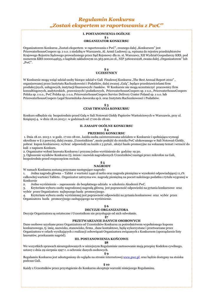 Regulamin Konkursu „Zostań ekspertem w raportowaniu z PwC” I. POSTANOWIENIA OGÓLNE §1 ORGANIZATOR KONKURSU Organizatorem Konkursu „Zostań ekspertem w raportowaniu z PwC", zwanego dalej „Konkursem” jest PricewaterhouseCoopers sp. z o.o. z siedzibą w Warszawie, Al. Armii Ludowej 14, wpisana do rejestru przedsiębiorców Krajowego Rejestru Sądowego prowadzonego przez Sąd Rejonowy dla m. st. Warszawy, XII Wydział Gospodarczy KRS, pod numerem KRS 0000044655, o kapitale zakładowym 10.363.900,oo zł., NIP 5260210228, zwana dalej „Organizatorem” lub „PwC”. §2 UCZESTNICY W Konkursie mogą wziąć udział osoby biorące udział w Gali Finałowej Konkursu „The Best Annual Report 2012” , organizowanej przez Instytutu Rachunkowości i Podatków, dalej zwanej „Galą”, będące przedstawicielami firm produkcyjnych, usługowych, instytucji finansowych i banków. W Konkursie nie mogą uczestniczyć pracownicy firm konsultingowych, audytorskich , prawniczych i podatkowych, PricewaterhouseCoopers sp. z o.o., PricewaterhouseCoopers Polska sp. z o.o., PwC Polska sp. z o.o, PricewaterhouseCoopers Service Delivery Center Poland sp. z o.o. lub PricewaterhouseCoopers Legal Szurmińska-Jaworska sp.k. oraz Instytutu Rachunkowosci i Podatków. §3 CZAS TRWANIA KONKURSU Konkurs odbędzie się bezpośrednio przed Galą w Sali Notowań Giełdy Papierów Wartościowych w Warszawie, przy ul. Książęcej 4, w dniu 18.10.2013 r. w godzinach od 17:00 do 18:00. II. ZASADY OGÓLNE KONKURSU §4 PRZEBIEG KONKURSU 1. Dnia 18.10. 2013 r. w godz. 17:00-18:00 , każda osoba zainteresowana udziałem w Konkursie i spełniająca wymogi określone w § 2 powyżej, dalej zwana „Uczestnikiem”, może podejść do stoiska PwC ulokowanego w Sali Notowań Giełdy, pobrać kupon konkursowy, wybrać odpowiedź na każde z 3 pytań , ułożyć hasło promocyjne na wskazany temat i wrzucić do kuli z napisem Konkurs. 2. Organizator wyłoni laureata Konkursu i przyzna jedno wyróżnienie do godziny 19:30. 3. Ogłoszenie wyników Konkursu (tj. imion i nazwisk nagrodzonych Uczestników) nastąpi przez mikrofon na Gali, bezpośrednio przed rozpoczęciem recitalu. §5 NAGRODY W ramach Konkursu zostaną przyznane następujące nagrody: 1. Jedna nagroda główna – Tablet o wartości 1440 zł netto oraz nagroda pieniężna w wysokości odpowiadającej 11,1% całkowitej wartości Tabletu . Organizator zatrzyma ww. nagrodę pieniężną na poczet należnego podatku z tytułu wygranej w Konkursie 2. Jedno wyróżnienie – zaproszenie do bezpłatnego udziału w szkoleniu Akademii PwC. 3. Kryterium wyboru osoby nagrodzonej nagrodą główną jest poprawność odpowiedzi na pytania konkursowe oraz wybór przez Organizatora najlepszego hasła promocyjnego. 4. Kryterium wyboru osoby wyróżnionej jest poprawność odpowiedzi na pytania konkursowe oraz wybór przez Organizatora hasła promocyjnego zasługującego na wyróżnienie. §6 DECYZJE ORGANIZATORA Decyzje Organizatora są ostateczne i Uczestnikom nie przysługuje od nich odwołanie. §7 PRZETWARZANIE DANYCH OSOBOWYCH Dane osobowe uzyskane przez Organizatora od Uczestników Konkursu za pośrednictwem wypełnionego kuponu konkursowego, tj. imię, nazwisko, stanowisko, firma , dane kontaktowe, będą wykorzystane i przetwarzane przez Organizatora w celach wynikających z realizacji zobowiązań Organizatora związanych z Konkursem (sporządzenie listy laureatów, przekazanie nagród). III. POSTANOWIENIA KOŃCOWE §8 We wszystkich sprawach nieuregulowanych w niniejszym Regulaminie zastosowanie mają przepisy Kodeksu cywilnego, ustawy z dnia 29 sierpnia 1997 r. o ochronie danych osobowych. §9 Regulamin Konkursu jest udostępniony do wglądu na stronie internetowej www.pwc.pl oraz będzie dostępny na stoisku podczas Gali. § 10 Każdy z Uczestników przez przystąpienie do Konkursu akceptuje warunki niniejszego Regulaminu.