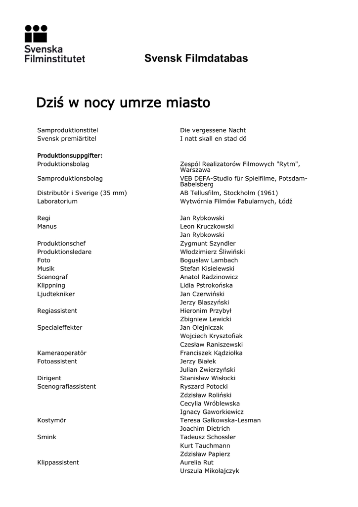Svensk Filmdatabas Dziś w nocy umrze miasto Samproduktionstitel Svensk premiärtitel Produktionsuppgifter: Produktionsbolag Samproduktionsbolag Distributör i Sverige (35 mm) Laboratorium Regi Manus Produktionschef Produktionsledare Foto Musik Scenograf Klippning Ljudtekniker Regiassistent Specialeffekter Kameraoperatör Fotoassistent Dirigent Scenografiassistent Kostymör Smink Klippassistent Die vergessene Nacht I natt skall en stad dö Zespól Realizatorów Filmowych "Rytm", Warszawa VEB DEFA-Studio für Spielfilme, PotsdamBabelsberg AB Tellusfilm, Stockholm (1961) Wytwórnia Filmów Fabularnych, Łódź Jan Rybkowski Leon Kruczkowski Jan Rybkowski Zygmunt Szyndler Włodzimierz Śliwiński Bogusław Lambach Stefan Kisielewski Anatol Radzinowicz Lidia Pstrokońska Jan Czerwiński Jerzy Blaszyński Hieronim Przybył Zbigniew Lewicki Jan Olejniczak Wojciech Krysztofiak Czesław Raniszewski Franciszek Kądziołka Jerzy Białek Julian Zwierzyński Stanisław Wisłocki Ryszard Potocki Zdzisław Roliński Cecylia Wróblewska Ignacy Gaworkiewicz Teresa Gałkowska-Lesman Joachim Dietrich Tadeusz Schossler Kurt Tauchmann Zdzisław Papierz Aurelia Rut Urszula Mikołajczyk Svensk Filmdatabas Bildformat: Färgsystem: Ljudsystem: Originallängd i minuter: Normalbild (1,37:1) Svartvit Optisk mono 95 Censur: Datum: Åldersgräns: Längd: 98382 1961-11 Tillåten från 15 år 2440 meter Sverigepremiär TV-visning Urpremiär 1961-12-04 Draken Stockholm Sverige 95 minuter 1967-01-10 TV Sverige 95 minuter 1961-09-04 Warszawa Polen 95 minuter Rollista: Andrzej Łapicki Beata Tyszkiewicz Danuta Szaflarska Jadwiga Kuryluk Barbara Horawianka Zofia Małynicz Jadwiga Chojnacka Ignacy Gogolewski Kalina Jędrusik Emil Karewicz Elżbieta Kępińska Barbara Krafftówna Wanda Łuczycka-Meller Stanisław Milski Urszula Modrzyńska Zdzisław Mrożewski Stanisław Łapiński Piotr Magda italienskan Weronika Zumpe en blond kvinna hos familjen Zumpe moster Magda tant Poldi Eryk, SS-löjtnant gatflicka Kurt Zumpe flickan i växthuset Iza ägarinnan till restaurang Astoria Vittorio, akrobat Zofia, hjälper fransmannen professor tysken som letar efter stolar