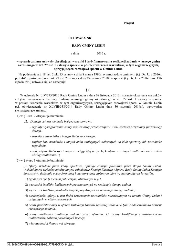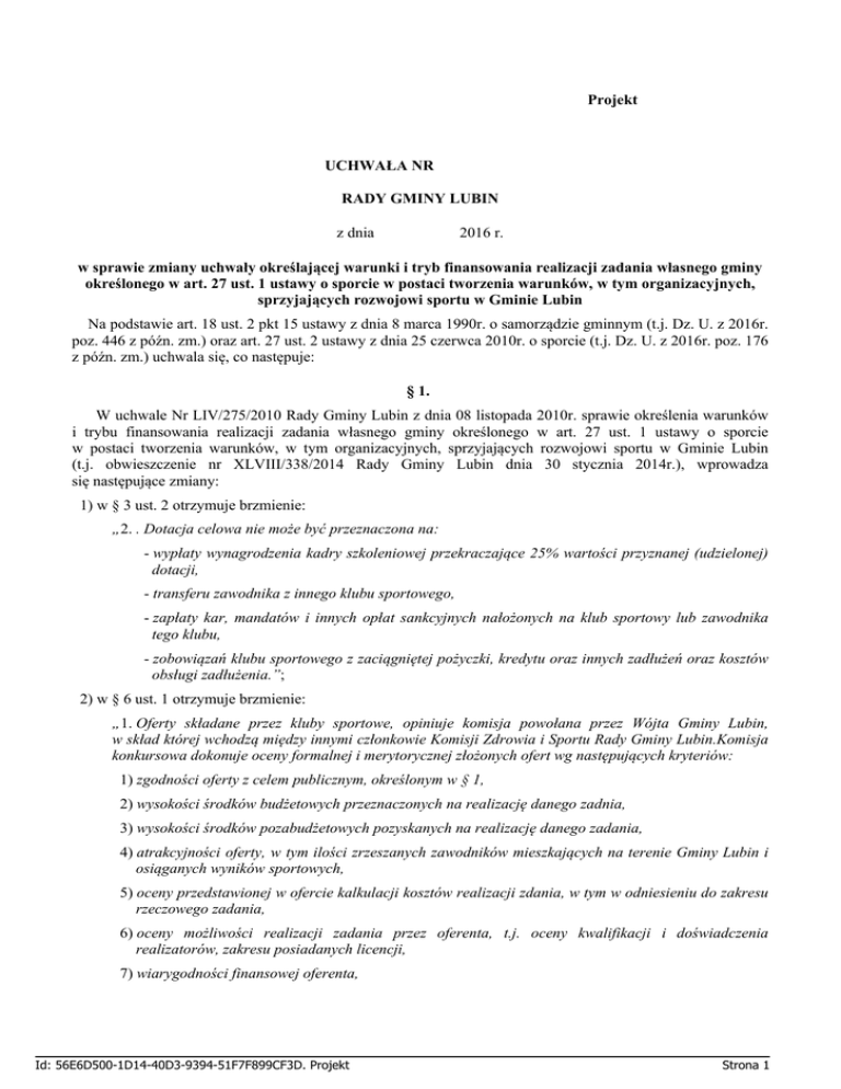 Projekt UCHWAŁA NR RADY GMINY LUBIN z dnia 2016 r. w sprawie zmiany uchwały określającej warunki i tryb finansowania realizacji zadania własnego gminy określonego w art. 27 ust. 1 ustawy o sporcie w postaci tworzenia warunków, w tym organizacyjnych, sprzyjających rozwojowi sportu w Gminie Lubin Na podstawie art. 18 ust. 2 pkt 15 ustawy z dnia 8 marca 1990r. o samorządzie gminnym (t.j. Dz. U. z 2016r. poz. 446 z późn. zm.) oraz art. 27 ust. 2 ustawy z dnia 25 czerwca 2010r. o sporcie (t.j. Dz. U. z 2016r. poz. 176 z późn. zm.) uchwala się, co następuje: § 1. W uchwale Nr LIV/275/2010 Rady Gminy Lubin z dnia 08 listopada 2010r. sprawie określenia warunków i trybu finansowania realizacji zadania własnego gminy określonego w art. 27 ust. 1 ustawy o sporcie w postaci tworzenia warunków, w tym organizacyjnych, sprzyjających rozwojowi sportu w Gminie Lubin (t.j. obwieszczenie nr XLVIII/338/2014 Rady Gminy Lubin dnia 30 stycznia 2014r.), wprowadza się następujące zmiany: 1) w § 3 ust. 2 otrzymuje brzmienie: „2. . Dotacja celowa nie może być przeznaczona na: - wypłaty wynagrodzenia kadry szkoleniowej przekraczające 25% wartości przyznanej (udzielonej) dotacji, - transferu zawodnika z innego klubu sportowego, - zapłaty kar, mandatów i innych opłat sankcyjnych nałożonych na klub sportowy lub zawodnika tego klubu, - zobowiązań klubu sportowego z zaciągniętej pożyczki, kredytu oraz innych zadłużeń oraz kosztów obsługi zadłużenia.”; 2) w § 6 ust. 1 otrzymuje brzmienie: „1. Oferty składane przez kluby sportowe, opiniuje komisja powołana przez Wójta Gminy Lubin, w skład której wchodzą między innymi członkowie Komisji Zdrowia i Sportu Rady Gminy Lubin.Komisja konkursowa dokonuje oceny formalnej i merytorycznej złożonych ofert wg następujących kryteriów: 1) zgodności oferty z celem publicznym, określonym w § 1, 2) wysokości środków budżetowych przeznaczonych na realizację danego zadnia, 3) wysokości środków pozabudżetowych pozyskanych na realizację danego zadania, 4) atrakcyjności oferty, w tym ilości zrzeszanych zawodników mieszkających na terenie Gminy Lubin i osiąganych wyników sportowych, 5) oceny przedstawionej w ofercie kalkulacji kosztów realizacji zdania, w tym w odniesieniu do zakresu rzeczowego zadania, 6) oceny możliwości realizacji zadania przez oferenta, t.j. oceny kwalifikacji i doświadczenia realizatorów, zakresu posiadanych licencji, 7) wiarygodności finansowej oferenta, Id: 56E6D500-1D14-40D3-9394-51F7F899CF3D. Projekt Strona 1 8) analizy dotychczasowej współpracy, 9) analizy wykonania zadań zleconych oraz sposobu oraz terminowości rozliczenia przez oferenta dotacji, jeżeli w latach poprzednich została udzielona przez Gminę Lubin.”; 2) w § 6 po ust. 1 dodaje się ust. 1a w brzmieniu: „1a. Złożona oferta winna gwarantować wykonanie zadania w sposób efektywny, oszczędny i terminowy.”. § 2. Zmienia się załącznik do uchwały nr LIV/275/2010 Rady Gminy Lubin z dnia 8 listopada 2010r. w sprawie określenia warunków i trybu finansowania realizacji zadania własnego gminy określonego w art. 27 ust. 1 ustawy o sporcie w postaci tworzenia warunków, w tym organizacyjnych, sprzyjających rozwojowi sportu w Gminie Lubin, który otrzymuje brzmienie jak załącznik do niniejszej uchwały. § 3. Wykonanie uchwały powierza się Wójtowi Gminy Lubin. § 4. Uchwała wchodzi w życie po upływie 14 dni od dnia jej ogłoszenia w Dzienniku Urzędowym Województwa Dolnośląskiego. Przewodniczący Rady Gminy Lubin Norbert Grabowski Id: 56E6D500-1D14-40D3-9394-51F7F899CF3D. Projekt Strona 2 Załącznik do uchwały Nr …...../......../2016 Rady Gminy Lubin z dnia …...........2016r. ....................................................... /pieczęć Wnioskodawcy/ WNIOSEK o udzielenie dotacji z budżetu Gminy Lubin na realizację zadania własnego określonego w art. 27 ust. 1 ustawy z dnia 25 czerwca 2010r. o sporcie w kwocie ........................... 1. Wnioskodawca: a) nazwa .................................................................................................................................................................... b) forma prawna ....................................................................................................................................................... c) numer w Krajowym Rejestrze Sądowym lub w innym rejestrze ......................................................................... d) NIP .................................................... Regon ....................................................................................................... e) dokładny adres ..................................................................................................................................................... f) tel. ............................................................... fax ................................................................................................... g) nazwa banku i numer rachunku ........................................................................................................................... ................................................................................................................................................................................... h) nazwiska i imiona oraz funkcje/stanowiska osób statutowo upoważnionych do reprezentowania podmiotu i posiadających zdolność do podejmowania zobowiązań finansowych w imieniu podmiotu (zawierania umów) – składania oświadczeń woli .................................................................................................................................... ................................................................................................................................................................................... .............................................................................