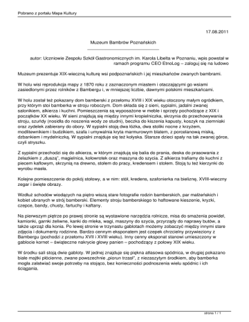 Pobrano z portalu Mapa Kultury 17.08.2011 Muzeum Bambrów Poznańskich ____________________________ autor: Uczniowie Zespołu Szkół Gastronomicznych im. Karola Libelta w Poznaniu, wpis powstał w ramach programu CEO EtnoLog – zaloguj się na ludowo Muzeum prezentuje XIX-wieczną kulturę wsi podpoznańskich i jej mieszkańców zwanych bambrami. W holu wisi reprodukcja mapy z 1870 roku z zaznaczonym miastem i otaczającymi go wsiami zasiedlonymi przez rolników z Bambergu i, w mniejszej liczbie, dawnymi polskimi mieszkańcami. W holu został też pokazany dom bamberski z przełomu XVIII i XIX wieku otoczony małym ogródkiem, przy którym stoi bamberka w stroju roboczym. Dom składa się z sieni, sypialni, jadalni zwanej salonikiem, alkierza i kuchni. Pomieszczenia są wyposażone w meble i sprzęty pochodzące z XIX i początków XX wieku. W sieni znajdują się między innymi kropielniczka, skrzynia do przechowywania stroju, szuńdy (nosidła do noszenia wody ze studni), beczka do kiszenia kapusty, koszyk na ziemniaki oraz zydelek zabierany do obory. W sypialni stoją dwa łóżka, dwa stoliki nocne z krzyżem, modlitewnikiem i budzikiem, szafa i umywalnia kryta marmurowym blatem, z porcelanową miską, dzbankiem i mydelniczką. W sypialni znajduje się też kołyska. Starsze dzieci spały na tak zwanej górce, czyli stryszku. Z sypialni przechodzi się do alkierza, w którym znajdują się balia do prania, deska do prasowania z żelazkiem z „duszą”, magielnica, kołowrotek oraz maszyna do szycia. Z alkierza trafiamy do kuchni z piecem kaflowym, skrzynią na drewno, stołem do pracy, kredensem i stołem. Stoją tu też kierzynki do wyrobu masła. Kolejne pomieszczenie do pokój stołowy, a w nim: stół, kredens, szafonierka na bieliznę, XVIII-wieczny zegar i święte obrazy. Wzdłuż schodów wiodących na piętro wiszą stare fotografie rodzin bamberskich, par małżeńskich i kobiet ubranych w strój bamberski. Elementy stroju bamberskiego to haftowane kieszenie, kryzki, czepce, bandy, chusty, fartuchy i kaftany. Na pierwszym piętrze po prawej stronie są wystawione narzędzia rolnicze, misa do smażenia powideł, kamionki, garnki żeliwne, kanki do mleka, wagi, maszyny do szycia, przyrządy do naprawy butów, a także uprząż dla konia. Po lewej stronie w trzynastu gablotach możemy zobaczyć między innymi stare zdjęcia i dokumenty rodzinne. Bardzo cennym eksponatem jest czepek chrzcielny przywieziony z Bambergu (pochodzi z przełomu XVII i XVIII wieku). Inny cenny eksponat stanowi umieszczony w gablocie kornet – świąteczne nakrycie głowy panien – pochodzący z połowy XIX wieku. W środku sali stoją dwie gabloty. W jednej znajduje się piękna atłasowa spódnica, w drugiej pokazano białe majtki płócienne, zwane powszechnie „piorun trzasł”, z niezaszytym środkiem, aby bamberka mogła załatwiać swoje potrzeby na stojąco, bez konieczności podnoszenia wielu spódnic i ich ściągania. strona 1 / 1