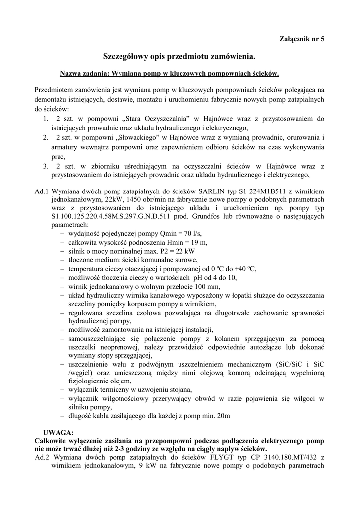 Załącznik nr 5 Szczegółowy opis przedmiotu zamówienia. Nazwa zadania: Wymiana pomp w kluczowych pompowniach ścieków. Przedmiotem zamówienia jest wymiana pomp w kluczowych pompowniach ścieków polegająca na demontażu istniejących, dostawie, montażu i uruchomieniu fabrycznie nowych pomp zatapialnych do ścieków: 1. 2 szt. w pompowni „Stara Oczyszczalnia” w Hajnówce wraz z przystosowaniem do istniejących prowadnic oraz układu hydraulicznego i elektrycznego, 2. 2 szt. w pompowni „Słowackiego” w Hajnówce wraz z wymianą prowadnic, orurowania i armatury wewnątrz pompowni oraz zapewnieniem odbioru ścieków na czas wykonywania prac, 3. 2 szt. w zbiorniku uśredniającym na oczyszczalni ścieków w Hajnówce wraz z przystosowaniem do istniejących prowadnic oraz układu hydraulicznego i elektrycznego, Ad.1 Wymiana dwóch pomp zatapialnych do ścieków SARLIN typ S1 224M1B511 z wirnikiem jednokanałowym, 22kW, 1450 obr/min na fabrycznie nowe pompy o podobnych parametrach wraz z przystosowaniem do istniejącego układu i uruchomieniem np. pompy typ S1.100.125.220.4.58M.S.297.G.N.D.511 prod. Grundfos lub równoważne o następujących parametrach: − wydajność pojedynczej pompy Qmin = 70 l/s, − całkowita wysokość podnoszenia Hmin = 19 m, − silnik o mocy nominalnej max. P2 = 22 kW − tłoczone medium: ścieki komunalne surowe, − temperatura cieczy otaczającej i pompowanej od 0 ºC do +40 ºC, − możliwość tłoczenia cieczy o wartościach pH od 4 do 10, − wirnik jednokanałowy o wolnym przelocie 100 mm, − układ hydrauliczny wirnika kanałowego wyposażony w łopatki służące do oczyszczania szczeliny pomiędzy korpusem pompy a wirnikiem, − regulowana szczelina czołowa pozwalająca na długotrwałe zachowanie sprawności hydraulicznej pompy, − możliwość zamontowania na istniejącej instalacji, − samouszczelniające się połączenie pompy z kolanem sprzęgającym za pomocą uszczelki neoprenowej, należy przewidzieć odpowiednie autozłącze lub dokonać wymiany stopy sprzęgającej, − uszczelnienie wału z podwójnym uszczelnieniem mechanicznym (SiC/SiC i SiC /węgiel) oraz umieszczoną między nimi olejową komorą odcinającą wypełnioną fizjologicznie olejem, − wyłącznik termiczny w uzwojeniu stojana, − wyłącznik wilgotnościowy przerywający obwód w razie pojawienia się wilgoci w silniku pompy, − długość kabla zasilającego dla każdej z pomp min. 20m UWAGA: Całkowite wyłączenie zasilania na przepompowni podczas podłączenia elektrycznego pomp nie może trwać dłużej niż 2-3 godziny ze względu na ciągły napływ ścieków. Ad.2 Wymiana dwóch pomp zatapialnych do ścieków FLYGT typ CP 3140.180.MT/432 z wirnikiem jednokanałowym, 9 kW na fabrycznie nowe pompy o podobnych parametrach wraz z wymiana prowadnic, armatury i orurowania oraz przystosowaniem do istniejącego układu i uruchomieniem np. pompy typ S1.80.100.100.4.50H.C.260.G.N.D prod. Grundfos lub równoważne o następujących parametrach: − wydajność pojedynczej pompy Qmin = 38 l/s, − całkowita wysokość podnoszenia Hmin = 15 m, − silnik o mocy nominalnej max. P2 = 10,5 kW − tłoczone medium: ścieki komunalne surowe, − temperatura cieczy otaczającej i pompowanej od 0 ºC do +40 ºC, − możliwość tłoczenia cieczy o wartościach pH od 4 do 10, − wirnik jednokanałowy o wolnym przelocie 80 mm, − regulowana szczelina czołowa pozwalająca na długotrwałe zachowanie sprawności hydraulicznej pompy, − samouszczelniające się połączenie pompy z kolanem sprzęgającym za pomocą uszczelki neoprenowej, − podwójne uszczelnienie wału (SiC/SiC i SiC/węgiel), − wbudowane zabezpieczenie termiczne pompy, − wyłącznik wilgotnościowy przerywający obwód w razie pojawienia się wilgoci w silniku pompy, − wodoszczelne, hermetyczne połączenie kablowe, − długość kabla zasilającego dla każdej z pomp min. 10m. W zakres modernizacji wyposażenia przepompowni ścieków wchodzi: a) wymiana istniejących kolan sprzęgających b) wymiana prowadnic pomp wraz z uchwytami na prowadnice dwururowe w wykonaniu ze stali nierdzewnej nie gorszej niż 1.4301 c) wymiana pionów tłocznych DN 150 i kolektora zbiorczego DN 200 na rurociągi wykonane ze stali nierdzewnej nie gorszej niż 1.4301, d) wymiana zasuw kołnierzowych DN150 przeznaczonych do ścieków wewnątrz pompowni – 2 szt. (śruby, nakrętki, podkładki itp ze stali nierdzewnej) e) wymiana zaworów zwrotnych kulowych DN150 przeznaczonych do ścieków wewnątrz pompowni – 2 szt. (śruby, nakrętki, podkładki itp ze stali nierdzewnej) f) montaż łańcuchów ze stali nierdzewnej o odpowiedniej wytrzymałości do opuszczania i wyciągania pomp o długości min. 10 m dla każdej z pomp, g) montaż podestu oraz drabinki obsługowej ze stali nierdzewnej, UWAGA: Na czas demontażu starego i montażu nowego wyposażenia pompowni należy zapewnić ciągły odbiór ścieków z sieci kanalizacyjnej i ich przesył do oczyszczalni ścieków. Dopuszcza się montaż pompy do ścieków w studni kanalizacyjnej (pierwsza od strony pompowni) oraz tymczasowego przewodu tłocznego włączonego do istniejącego rurociągu tłocznego z przepompowni lub wywóz ścieków wozami asenizacyjnymi do punktu zlewnego na oczyszczalni ścieków oddalonej o ok. 300m. Szacunkowy napływ ścieków wynosi ok. 1000 m3/d w okresie bezdeszczowym. W zakresie Wykonawcy pozostaje również czyszczenie zbiornika i wywóz pozostałości. Ad.3 Wymiana dwóch pomp zatapialnych do ścieków Sarlin typ S1 174M1A511 z wirnikiem jednokanałowym, 17kW, 1450 obr/min na fabrycznie nowe pompy o podobnych parametrach wraz z przystosowaniem do istniejącego układu i uruchomieniem np. pompy typ S1.100.125.170.4.54M.S274.G.N.D.511 prod. Grundfos lub równoważne o następujących parametrach: − wydajność pojedynczej pompy Qmin = 89 l/s, − całkowita wysokość podnoszenia Hmin = 12 m, − silnik o mocy nominalnej max.