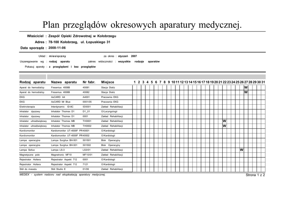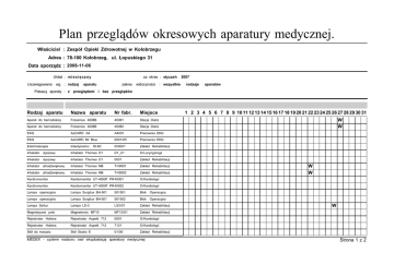 Plan przeglądów okresowych aparatury medycznej. Właściciel : Zespół Opieki Zdrowotnej w Kołobrzegu Adres : 78-100 Kołobrzeg, ul. Łopuskiego 31 Data sporządz : 2008-11-06 Układ : m i e s i ę cz ny Uszeregowanie wg : rodzaj za okres : styczeń aparatu zakres widoczności : wszystkie 2007 rodzaje aparatów Pokazuj aparaty : z przeglądami i bez przeglądów Rodzaj aparatu Nazwa aparatu Nr fabr. Miejsce Aparat do hemodializy Fresenius 4008B 40081 Stacja Dializ Aparat do hemodializy Fresenius 4008B 40082 Stacja Dializ EKG AsCARD A4 A4001 Pracownia EKG EKG AsCARD Mr Blue 0001/05 Pracownia EKG Elektroterapia Interdynamic ID0001 Zakład Rehabilitacji Inhalator dyszowy Inhalator Thomex D1 D1_01 O/Laryngologii Inhalator dyszowy ID-8C Inhalator Thomex D1 0001 Zakład Rehabilitacji Inhalator ultradżwiękowy Inhalator Thomex MB TH0001 Zakład Rehabilitacji Inhalator ultradżwiękowy Inhalator Thomex MB TH0002 Zakład Rehabilitacji Kardiomonitor Kardiomonitor UT-4000F PRO 40001 O/Kardiologii Kardiomonitor Kardiomonitor UT-4000F PRO 40002 O/Kardiologii Lampa operacyjna Lampa Surgilux BH-501 501501 Blok Operacyjny Lampa operacyjna Lampa Surgilux BH-501 501502 Blok Operacyjny Lampa Sollux Lampa LS-3 LS3/01 Zakład Rehabilitacji Magnetyczne pole Magnetronic MF10 MF10/01 Zakład Rehabilitacji Rejestrator Holtera Rejestrator Aspekt 712 0001 O/Kardiologii Rejestrator Holtera Rejestrator Aspekt 712 7121 O/Kardiologii Stół do masażu Stół Studio E 01/06 Zakład Rehabilitacji MEDEX - system nadzoru nad eksploatacją aparatury medycznej. 1 2 3 4 5 6 7 8 9 10 11 12 13 14 15 16 17 18 19 20 21 22 23 24 25 26 27 28 29 30 31 W W W W W Strona 1 z 2 Rodzaj aparatu Nazwa aparatu Nr fabr. Miejsce Stół operacyjny Stół SU-08 0801 Blok Operacyjny Stół operacyjny Stół SU-08 Operacyjny 0802 Blok Wanna do masażu podwodnego Wanna T-MP UWM TMP/001 Zakład Rehabilitacji Wanna do masażu wirowego Wanna nóg 1117T 0001/98 Zakład Rehabilitacji MEDEX - system nadzoru nad eksploatacją aparatury medycznej. 1 2 3 4 5 6 7 8 9 10 11 12 13 14 15 16 17 18 19 20 21 22 23 24 25 26 27 28 29 30 31 W W Strona 2 z 2