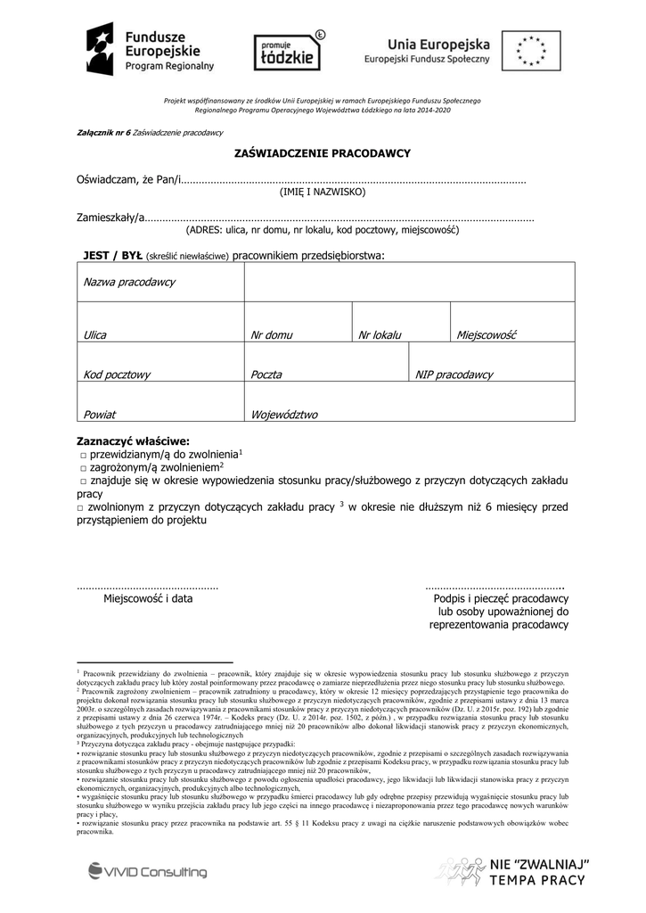 Projekt współfinansowany ze środków Unii Europejskiej w ramach Europejskiego Funduszu Społecznego Regionalnego Programu Operacyjnego Województwa Łódzkiego na lata 2014-2020 Załącznik nr 6 Zaświadczenie pracodawcy ZAŚWIADCZENIE PRACODAWCY Oświadczam, że Pan/i……………………………………………………………………………………………………… (IMIĘ I NAZWISKO) Zamieszkały/a…………………………………………………………………………………………………………………… (ADRES: ulica, nr domu, nr lokalu, kod pocztowy, miejscowość) JEST / BYŁ (skreślić niewłaściwe) pracownikiem przedsiębiorstwa: Nazwa pracodawcy Ulica Nr domu Kod pocztowy Poczta Powiat Województwo Nr lokalu Miejscowość NIP pracodawcy Zaznaczyć właściwe: □ przewidzianym/ą do zwolnienia 1 □ zagrożonym/ą zwolnieniem2 □ znajduje się w okresie wypowiedzenia stosunku pracy/służbowego z przyczyn dotyczących zakładu pracy □ zwolnionym z przyczyn dotyczących zakładu pracy 3 w okresie nie dłuższym niż 6 miesięcy przed przystąpieniem do projektu ………………………………………… Miejscowość i data 1 ……………………………………….. Podpis i pieczęć pracodawcy lub osoby upoważnionej do reprezentowania pracodawcy Pracownik przewidziany do zwolnienia – pracownik, który znajduje się w okresie wypowiedzenia stosunku pracy lub stosunku służbowego z przyczyn dotyczących zakładu pracy lub który został poinformowany przez pracodawcę o zamiarze nieprzedłużenia przez niego stosunku pracy lub stosunku służbowego. 2 Pracownik zagrożony zwolnieniem – pracownik zatrudniony u pracodawcy, który w okresie 12 miesięcy poprzedzających przystąpienie tego pracownika do projektu dokonał rozwiązania stosunku pracy lub stosunku służbowego z przyczyn niedotyczących pracowników, zgodnie z przepisami ustawy z dnia 13 marca 2003r. o szczególnych zasadach rozwiązywania z pracownikami stosunków pracy z przyczyn niedotyczących pracowników (Dz. U. z 2015r. poz. 192) lub zgodnie z przepisami ustawy z dnia 26 czerwca 1974r. – Kodeks pracy (Dz. U. z 2014r. poz. 1502, z późn.) , w przypadku rozwiązania stosunku pracy lub stosunku służbowego z tych przyczyn u pracodawcy zatrudniającego mniej niż 20 pracowników albo dokonał likwidacji stanowisk pracy z przyczyn ekonomicznych, organizacyjnych, produkcyjnych lub technologicznych 3 Przyczyna dotycząca zakładu pracy - obejmuje następujące przypadki: • rozwiązanie stosunku pracy lub stosunku służbowego z przyczyn niedotyczących pracowników, zgodnie z przepisami o szczególnych zasadach rozwiązywania z pracownikami stosunków pracy z przyczyn niedotyczących pracowników lub zgodnie z przepisami Kodeksu pracy, w przypadku rozwiązania stosunku pracy lub stosunku służbowego z tych przyczyn u pracodawcy zatrudniającego mniej niż 20 pracowników, • rozwiązanie stosunku pracy lub stosunku służbowego z powodu ogłoszenia upadłości pracodawcy, jego likwidacji lub likwidacji stanowiska pracy z przyczyn ekonomicznych, organizacyjnych, produkcyjnych albo technologicznych, • wygaśnięcie stosunku pracy lub stosunku służbowego w przypadku śmierci pracodawcy lub gdy odrębne przepisy przewidują wygaśnięcie stosunku pracy lub stosunku służbowego w wyniku przejścia zakładu pracy lub jego części na innego pracodawcę i niezaproponowania przez tego pracodawcę nowych warunków pracy i płacy, • rozwiązanie stosunku pracy przez pracownika na podstawie art. 55 § 11 Kodeksu pracy z uwagi na ciężkie naruszenie podstawowych obowiązków wobec pracownika.