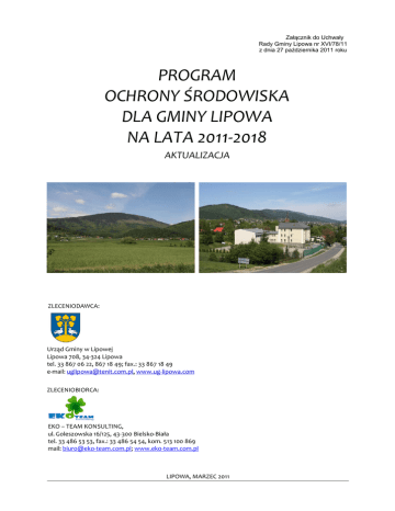 Załącznik do Uchwały Rady Gminy Lipowa nr XVI/78/11 z dnia 27 października 2011 roku PROGRAM OCHRONY ŚRODOWISKA DLA GMINY LIPOWA NA LATA 2011-2018 AKTUALIZACJA ZLECENIODAWCA: Urząd Gminy w Lipowej Lipowa 708, 34-324 Lipowa tel. 33 867 06 22, 867 18 49; fax.: 33 867 18 49 e-mail: [email protected], www.ug-lipowa.com ZLECENIOBIORCA: EKO – TEAM KONSULTING, ul. Goleszowska 16/125, 43-300 Bielsko-Biała tel. 33 486 53 53, fax.: 33 486 54 54, kom. 513 100 869 mail: [email protected]; www.eko-team.com.pl LIPOWA, MARZEC 2011 Program Ochrony Środowiska dla Gminy Lipowa na lata 2011-2018 - aktualizacja 2 Program Ochrony Środowiska dla Gminy Lipowa na lata 2011-2018 - aktualizacja AUTORZY OPRACOWANIA: Agnieszka Chylak Sebastian Kulikowski Tomasz Giza Osoby i instytucje współpracujące przy opracowaniu niniejszego dokumentu: 1. Maria Szustakowska – Urząd Gminy Lipowa, 2. Maria Jasek – Urząd Gminy Lipowa, 3. Spółka Beskid SA, 4. Przedsiębiorstwo Usług Komunalnych Sp. z o.o. w Żywcu, 5. Regionalna Dyrekcja Ochrony Środowiska w Katowicach, 6. Państwowy Wojewódzki Inspektorat Sanitarny, 7. Urząd Marszałkowski Województwa Śląskiego, Wydział Terenów Wiejskich, 8. Śląski Ośrodek Doradztwa Rolniczego w Częstochowie, 9. Agencja Restrukturyzacji i Modernizacji Rolnictwa, Biuro Powiatowe w Żywcu, 10. Powiatowy Zarząd Dróg w Żywcu, 11. Powiatowy Urząd Pracy w Żywcu, 12. Regionalny Zarząd Gospodarki Wodnej, Zarząd Zlewni Soły i Skawy z siedzibą w Żywcu, 13. Grupa Tauron, Rejon Dystrybucji Żywiec, Zdjęcia na okładce: Agnieszka Chylak 3 Program Ochrony Środowiska dla Gminy Lipowa na lata 2011-2018 - aktualizacja 1 WSTĘP ................................................................................................................................................................. 7 1.1 PODSTAWA OPRACOWANIA ................................................................................................................................. 7 1.2 METODOLOGIA OPRACOWANIA, ZAWARTOŚĆ DOKUMENTU I JEGO PODSTAWY PRAWNE ............................................... 7 2 UWARUNKOWANIE ZEWNĘTRZNE ................................................................................................................... 8 2.1 POLITYKA EKOLOGICZNA PAŃSTWA ....................................................................................................................... 8 2.2 PROJEKT PROGRAMU OCHRONY ŚRODOWISKA WOJEWÓDZTWA ŚLĄSKIEGO DO ROKU 2013 WRAZ Z PERSPEKTYWĄ DO ROKU 2018 ................................................................................................................................................................. 8 2.3 PROGRAM OCHRONY ŚRODOWISKA DLA POWIATU ŻYWIECKIEGO NA LATA 2010-2017- AKTUALIZACJA ....................... 10 2.4 PLAN ROZWOJU LOKALNEGO GMINY LIPOWA NA LATA 2007-2013 ZE SZCZEGÓLNYM UWZGLĘDNIENIEM LAT 2007-2008 ....................................................................................................................................................................... 11 3 OGÓLNA CHARAKTERYSTYKA GMINY LIPOWA .............................................................................................. 12 3.1 POŁOŻENIE ....................................................................................................................................................... 12 3.2 UKSZTAŁTOWANIE TERENU I BUDOWA GEOLOGICZNA ............................................................................................. 13 3.3 KLIMAT ............................................................................................................................................................14 3.4 OTOCZENIE SPOŁECZNO GOSPODARCZE ................................................................................................................14 3.5 TURYSTYKA I REKREACJA .................................................................................................................................... 17 4 OCENA REALIZACJI DOTYCHCZASOWEGO PROGRAMU OCHRONY ŚRODOWISKA .....................................18 4.1 OCHRONA POWIETRZA ATMOSFERYCZNEGO ......................................................................................................... 18 4.2 GOSPODARKA WODNO – ŚCIEKOWA W TYM OCHRONA PRZECIW POWODZIOWA ........................................................ 19 4.3 OCHRONA DZIEDZICTWA PRZYRODNICZEGO W TYM OCHRONA LASÓW...................................................................... 20 4.4 OCHRONA POWIERZCHNI ZIEMI I GLEB ................................................................................................................. 20 4.5 OCHRONA ZASOBÓW GEOLOGICZNYCH ................................................................................................................. 21 4.6 OCHRONA PRZED HAŁASEM ................................................................................................................................ 21 4.7 OCHRONA PRZED POLAMI ELEKTROMAGNETYCZNYMI WRAZ ICH MONITORINGIEM ...................................................... 21 4.8 PODSUMOWANIE............................................................................................................................................... 21 5 OCENA AKTUALNEGO STANU ŚRODOWISKA ................................................................................................ 23 5.1 OCHRONA POWIETRZA ATMOSFERYCZNEGO ......................................................................................................... 23 5.1.1 System gazowniczy .............................................................................................................................25 5.1.2 System elektroenergetyczny ..............................................................................................................25 5.1.3 System ciepłowniczy ...................................................................................................