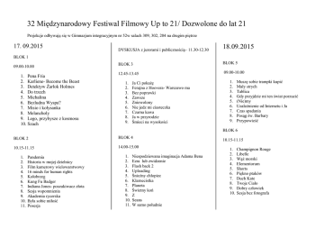 32 Międzynarodowy Festiwal Filmowy Up to 21/ Dozwolone do lat 21 Projekcje odbywają się w Gimnazjum integracyjnym nr 52w salach 309, 302, 204 na drugim piętrze 17. 09.2015 DYSKUSJA z jurorami i publicznością– 11.30-12.30 18.09.2015 BLOK 3 BLOK 5 12.45-13.45 09.00-10.00 BLOK 1 09.00-10.00 1. Pena Fria 2. Karliene- Become the Beast 3. Detektyw Żarłok Holmes 4. Do trzech 5. Michalina 6. Bezludna Wyspa? 7. Misio i kołysanka 8. Melancholy 9. Lego, przybysze z kosmosu 10. Szach 1. 2. 3. 4. 5. 6. 7. 8. 9. Ja Ci pokażę Ferajna z Hoovera- Warszawo ma Bez poprawki Zawsze Zniewolony Nie jedz mi ciasteczka Czarna kawa Ja w przyrodzie Śmieci na wysokości 1. 2. 3. 4. 5. 6. 7. 8. 9. Muszę sobie trampki kupić Mały strych Tablica Gdy przyjdzie mi ten świat porzucić (Nie)my Uzależnienie od Internetu i Ja Czas spadania Posąg św. Barbary Przypowieść BLOK 6 BLOK 2 BLOK 4 10.15-11.15 14.00-15.00 1. 2. 3. 4. 5. 6. 7. 8. 9. 10. 11. 1. 2. 3. 4. 5. 6. 7. 8. 9. 10. 11. Pandemia Historia w mojej dzielnicy Film kamerowy wielowarstwowy 16 minds for human rights Kołobrzeg Kung Fu Badger Indiana Jones- poszukiwacz złota Sesja wspomnienia Akademia rycerska Była sobie miłość Posesja Niespodziewana imaginacja Adama Bena Ezra lub zwidzenie Flash back 2 Uploading Śnieżny chłopiec Klarnecistka Planeta Świetny koń Z Seans W samo południe 10.15-11.15 1. 2. 3. 4. 5. 6. 7. 8. 9. 10. Champignon Rouge Libelle Wąż morski Elementorum Shorts Piękno ptaków Duch Kate Twoje Ciało Dobry człowiek Sesja bez fotografa KONFERENCJA TWÓRCÓW FILMU ŻARTOWNIŚ – 11.30-12.30 BLOK 7 12.45-13.45 1. 2. 3. 4. Przeprowadzka Ślimak i Muszelka Ballada o Złym Czarnoksiężniku Peut tout acheter 5. 6. 7. 8. 9. 10. 11. Paczka balonów Dziwny film Żartowniś Nie ta twarz Oda do marności Za zieloną nitką Tłum BLOK 8 14.00-15.00 1. 2. 3. 4. 5. 6. 7. 8. 9. Konwalie Złe zioło Sen o rowerze Zobaczysz Zegar Martwa planeta Grzebień Giallo Kawa