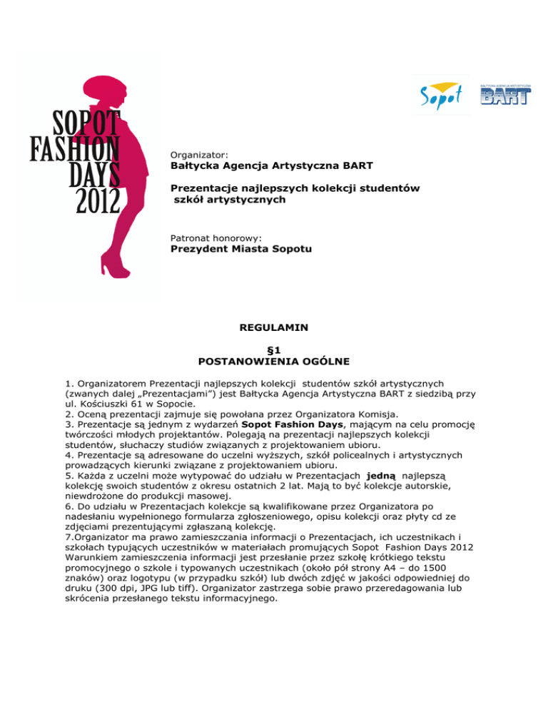 Organizator: Bałtycka Agencja Artystyczna BART Prezentacje najlepszych kolekcji studentów szkół artystycznych Patronat honorowy: Prezydent Miasta Sopotu REGULAMIN §1 POSTANOWIENIA OGÓLNE 1. Organizatorem Prezentacji najlepszych kolekcji studentów szkół artystycznych (zwanych dalej „Prezentacjami”) jest Bałtycka Agencja Artystyczna BART z siedzibą przy ul. Kościuszki 61 w Sopocie. 2. Oceną prezentacji zajmuje się powołana przez Organizatora Komisja. 3. Prezentacje są jednym z wydarzeń Sopot Fashion Days, mającym na celu promocję twórczości młodych projektantów. Polegają na prezentacji najlepszych kolekcji studentów, słuchaczy studiów związanych z projektowaniem ubioru. 4. Prezentacje są adresowane do uczelni wyŜszych, szkół policealnych i artystycznych prowadzących kierunki związane z projektowaniem ubioru. 5. KaŜda z uczelni moŜe wytypować do udziału w Prezentacjach jedną najlepszą kolekcję swoich studentów z okresu ostatnich 2 lat. Mają to być kolekcje autorskie, niewdroŜone do produkcji masowej. 6. Do udziału w Prezentacjach kolekcje są kwalifikowane przez Organizatora po nadesłaniu wypełnionego formularza zgłoszeniowego, opisu kolekcji oraz płyty cd ze zdjęciami prezentującymi zgłaszaną kolekcję. 7.Organizator ma prawo zamieszczania informacji o Prezentacjach, ich uczestnikach i szkołach typujących uczestników w materiałach promujących Sopot Fashion Days 2012 Warunkiem zamieszczenia informacji jest przesłanie przez szkołę krótkiego tekstu promocyjnego o szkole i typowanych uczestnikach (około pół strony A4 – do 1500 znaków) oraz logotypu (w przypadku szkół) lub dwóch zdjęć w jakości odpowiedniej do druku (300 dpi, JPG lub tiff). Organizator zastrzega sobie prawo przeredagowania lub skrócenia przesłanego tekstu informacyjnego. §2 TERMINY 1. Przesyłanie zgłoszeń i materiałów promocyjnych na adres Organizatora – do 31.03.2012 2. Dostarczenie kolekcji do Organizatora nie później niŜ 1 dzień przed pokazem. 3. Planowany termin prezentacji podczas Sopot Fashion Days w terminie 2-3.06.2012r §3 KOMISJA I WYRÓśNIENIA 1. Organizator powoła zespół oceniający, zwany w niniejszym Regulaminie Komisją, w skład którego wejdą: przedstawiciele Organizatora, styliści, kreatorzy mody, przedstawiciele mediów, komentatorzy działów mody. Komisja wyłoni ze swego grona Przewodniczącego. 2. Komisja pracuje niejawnie i jej decyzje są ostateczne. Członkowie Komisji zobowiązują się do utrzymania tajemnicy obrad do momentu ogłoszenia wyników. 3. Po obejrzeniu pokazów Komisja przyzna jedno główne wyróŜnienie dla najlepszej kolekcji. WyróŜnionemu projektantowi Organizator zapewni profesjonalną sesję zdjęciową jego kolekcji na terenie Sopotu oraz udział w kolejnej edycji Sopot Fashion Days. Ponadto szkoła typująca i projektant otrzymają dodatkową promocję w mediach patronujących Sopot Fashion Days (fotorelacje, wywiady itp.). Szkoła otrzyma równieŜ pamiątkową statuetkę Prezydenta Miasta Sopotu. 4. Komisja ogłosi werdykt i wręczy wyróŜnienia projektantowi i przedstawicielowi typującej go szkoły podczas gali Sopot Fashion Days. §4 WARUNKI PRZYSTĄPIENIA DO KONKURSU 1. Przesłanie na adres Biura Organizatora wypełnionego Formularza Zgłoszeniowego oraz płyty CD lub DVD prezentującej kolekcję zgłoszoną do Konkursu, w tym dwa zdjęcia w wysokiej rozdzielczości do druku (format: 15x21 cm, JPG lub tiff, 300 dpi). Formularz w wersji elektronicznej naleŜy równocześnie przesłać na adres mailowy [email protected] 2. Udział w Prezentacjach jest bezpłatny. 3. Osoby, które zakwalifikowały się do finału Prezentacji: a) przygotowują kolekcję składającą się max. z 15 sylwetek wraz z dodatkami, w tym butami. Zgłoszone wzory muszą spełniać następujące wymagania: stroje damskie – rozmiar 36-38, na wzrost od 175 cm do 180 cm; stroje męskie - wzrost od 182 cm do 186 cm. 4. Finaliści Prezentacji zobowiązani są dostarczyć kolekcje realizatorowi pokazu w terminie określonym przez Organizatora. §5 INFORMACJE DODATKOWE DLA UCZESTNIKOW KONKURSU 1. Zgłoszenia do Prezentacji przyjmowane będą wyłącznie na Formularzu Zgłoszeniowym, będącym załącznikiem do regulaminu. 2. Biuro Sopot Fashion Days niezwłocznie powiadomi osoby, które zakwalifikowały się do finału Prezentacji. Powiadomienie zostanie przesłane mailowo na adresy wskazane w Formularzu 3. Organizator zastrzega sobie prawo ustalania kolejności prezentacji kolekcji podczas finału Prezentacji na sopockim Molo. 4. Organizator zapewnia realizację pokazu konkursowego. a) Za scenariusz pokazu, oprawę muzyczną i zapewnienie modelek pełną odpowiedzialność przejmuje organizator pokazu. b.)Uczestnicy pokazów we wszystkich sprawach związanych z prezentacją kolekcji powinni kontaktować się z realizatorem pokazu wyznaczonym przez Organizatora. 5. Wszystkim biorącym udział projektantom oraz przedstawicielom uczelni Organizator zapewnia zaproszenie na pokaz finałowy. 6. Organizator zapewnia projektantom biorącym udział w Prezentacjach: a) zaproszenia na pokazy i afterparty, b) identyfikator/kartę wstępu upowaŜniającą do przebywania w obiekcie podczas prób pokazów, c) zestaw materiałów promocyjnych Sopot Fashion Days 2012 7. Organizator nie pokrywa kosztów podróŜy uczestników Prezentacji, transportu, noclegów, wyŜywienia przygotowania kolekcji ani kosztów zgłoszenia do udziału w Prezentacji. 8. Organizator zastrzega sobie prawo do bezpłatnej reprodukcji zdjęć dostarczonych przez Uczestników w katalogu towarzyszącym Sopot Fashion Days oraz zdjęć w prasie, telewizji oraz innych publikacjach pokonkursowych, łącznie z wydawnictwami komercyjnymi. 9. Organizatorzy nie odsyłają nadesłanych prac. Uczestnicy mogą odebrać zgłoszenia jedynie osobiście, najpóźniej w dniu Prezentacji. 10. Uczestnicy Prezentacji są zobowiązani do obecności na pokazie i wyjścia w 
