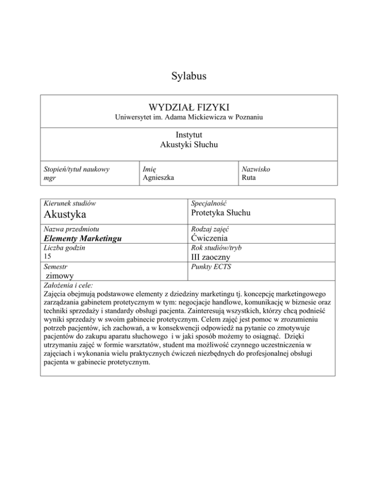 Sylabus WYDZIAŁ FIZYKI Uniwersytet im. Adama Mickiewicza w Poznaniu Instytut Akustyki Słuchu Stopień/tytuł naukowy mgr Imię Agnieszka Nazwisko Ruta Kierunek studiów Specjalność Akustyka Protetyka Słuchu Nazwa przedmiotu Rodzaj zajęć Elementy Marketingu Ćwiczenia Liczba godzin 15 Semestr Rok studiów/tryb III zaoczny Punkty ECTS zimowy Założenia i cele: Zajęcia obejmują podstawowe elementy z dziedziny marketingu tj. koncepcję marketingowego zarządzania gabinetem protetycznym w tym: negocjacje handlowe, komunikację w biznesie oraz techniki sprzedaży i standardy obsługi pacjenta. Zainteresują wszystkich, którzy chcą podnieść wyniki sprzedaży w swoim gabinecie protetycznym. Celem zajęć jest pomoc w zrozumieniu potrzeb pacjentów, ich zachowań, a w konsekwencji odpowiedź na pytanie co zmotywuje pacjentów do zakupu aparatu słuchowego i w jaki sposób możemy to osiągnąć. Dzięki utrzymaniu zajęć w formie warsztatów, student ma możliwość czynnego uczestniczenia w zajęciach i wykonania wielu praktycznych ćwiczeń niezbędnych do profesjonalnej obsługi pacjenta w gabinecie protetycznym. Tematyka zajęć / odsetek czasu zajęć % : 1. KONCEPCJA MARKETINGOWEGO ZARZĄDZANIA GABINETEM PROTETYKI SŁUCHU / 25% • Co to jest koncepcja marketingowa? • Klient i jego potrzeby. Nowoczesne standardy obsługi pacjenta. Profesjonalne metody rozmowy przez telefon. Zachowania pacjentów i segmentacja. Techniki badań potrzeb pacjentów. • Budowanie wizerunku gabinetu protetyki słuchu. • Rynek protetyki słuchu w Polsce - dane statystyczne 2. NEGOCJACJE HANDLOWE / 25% • Co to są negocjacje? • Przygotowanie do negocjacji, schemat prowadzenia negocjacji • Główne style negocjacji – charakterystyka • Techniki negocjacji • Manipulacje w negocjacjach • Skuteczny negocjator • Negocjacje na rynkach międzynarodowych 3. KOMUNIKACJA W BIZNESIE / 25% • Komunikacja werbalna i niewerbalna • Metody komunikowania się z zewnętrznym i wewnętrznym otoczeniem punktu protetycznego • Bariery komunikacji – konflikty i ich rozwiązywanie • Kształtowanie wizerunku własnego i punktu protetycznego 4. TECHNIKI SPRZEDAŻY / 25% • Etapy sprzedaży • Nowoczesne techniki sprzedaży • Budowanie relacji z pacjentem • Działania po-sprzedażowe Sposoby oceny pracy studenta Udział w ocenie końcowej ocena ciągła (bieżące przygotowanie do zajęć i aktywność) śródsemestralne kolokwia pisemne/ustne końcowe zaliczenie pisemne/ustne egzamin pisemny 90% egzamin ustny kontrola obecności Praca końcowa semestralna/roczna inne: 10% Literatura obowiązkowa Kotler Ph., Marketing, Wydanie XI, Rebis, Poznań 2005 Mruk H., Pilarczyk B, Szulce H., Marketing – uwarunkowania i instrumenty, Wydawnictwo AE, Poznań 2005 Literatura uzupełniająca Gordon I.H., Relacje z klientem. Marketing partnerski., PWE, Warszawa 2001 Underhill P., Dlaczego kupujemy?, Wyd. MT Biznes, 2001 Doyle P., Marketing wartości, Felberg SJA, Warszawa 2003 Trout J., Ries A., 22 niezmienne prawa marketingu, PWE, Warszawa 1996 Sullivan M., Adcock D., Marketing w handlu detalicznym, Oficyna Ekonomiczna, Kraków 2003 Zaltmann G., Jak myślą klienci. Podróż w głąb umysłu rynku, Forum, Poznań 2005 Westerby G., Na terytorium wroga. Tajemnice Mosadu, Wyd. Bellona 2001 Johnson S., Kto zabrał mój ser?, Studio Emka, Warszawa 2000 Lundin S. C., Paul H., Christensen J., Fish! Chwyciło!, Studio Emka, Warszawa 2001 Hill S.,Marketing radykalny, Prószyński i S-ka, Warszawa 2000 Trout J., Biznes to nie bajka, Prószyński i S-ka, Warszawa 2000 Simon H.,Tajemniczy mistrzowie, Studia Przypadków, PWN, Warszawa 1999 Czasopisma: Harvard Business Review (Polska) Marketing i Rynek Charaktery