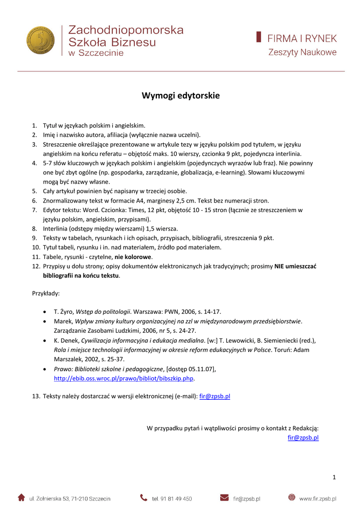 Wymogi edytorskie 1. Tytuł w językach polskim i angielskim. 2. Imię i nazwisko autora, afiliacja (wyłącznie nazwa uczelni). 3. Streszczenie określające prezentowane w artykule tezy w języku polskim pod tytułem, w języku angielskim na końcu referatu – objętość maks. 10 wierszy, czcionka 9 pkt, pojedyncza interlinia. 4. 5-7 słów kluczowych w językach polskim i angielskim (pojedynczych wyrazów lub fraz). Nie powinny one być zbyt ogólne (np. gospodarka, zarządzanie, globalizacja, e-learning). Słowami kluczowymi mogą być nazwy własne. 5. Cały artykuł powinien być napisany w trzeciej osobie. 6. Znormalizowany tekst w formacie A4, marginesy 2,5 cm. Tekst bez numeracji stron. 7. Edytor tekstu: Word. Czcionka: Times, 12 pkt, objętość 10 - 15 stron (łącznie ze streszczeniem w języku polskim, angielskim, przypisami). 8. Interlinia (odstępy między wierszami) 1,5 wiersza. 9. Teksty w tabelach, rysunkach i ich opisach, przypisach, bibliografii, streszczenia 9 pkt. 10. Tytuł tabeli, rysunku i in. nad materiałem, źródło pod materiałem. 11. Tabele, rysunki - czytelne, nie kolorowe. 12. Przypisy u dołu strony; opisy dokumentów elektronicznych jak tradycyjnych; prosimy NIE umieszczać bibliografii na końcu tekstu. Przykłady: T. Żyro, Wstęp do politologii. Warszawa: PWN, 2006, s. 14-17. Marek, Wpływ zmiany kultury organizacyjnej na zzl w międzynarodowym przedsiębiorstwie. Zarządzanie Zasobami Ludzkimi, 2006, nr 5, s. 24-27. K. Denek, Cywilizacja informacyjna i edukacja medialna. [w:] T. Lewowicki, B. Siemieniecki (red.), Rola i miejsce technologii informacyjnej w okresie reform edukacyjnych w Polsce. Toruń: Adam Marszalek, 2002, s. 25-37. Prawo: Biblioteki szkolne i pedagogiczne, [dostęp 05.11.07], http://ebib.oss.wroc.pl/prawo/bibliot/bibszkip.php. 13. Teksty należy dostarczać w wersji elektronicznej (e-mail): [email protected] W przypadku pytań i wątpliwości prosimy o kontakt z Redakcją: [email protected] 1