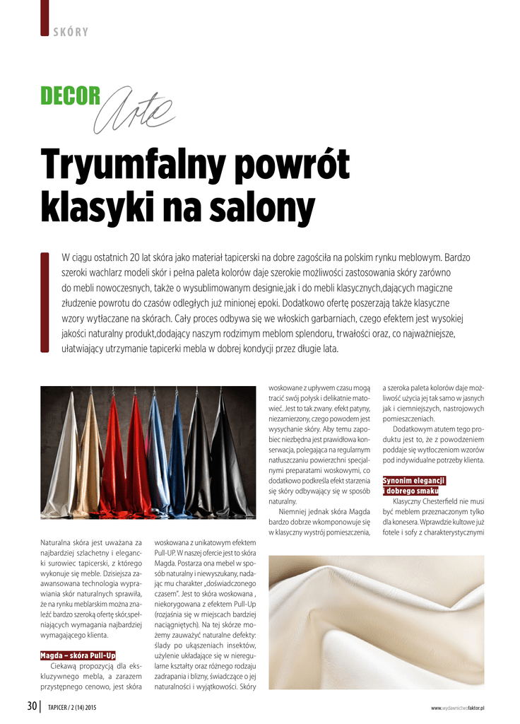 SKÓRY Tryumfalny powrót klasyki na salony W ciągu ostatnich 20 lat skóra jako materiał tapicerski na dobre zagościła na polskim rynku meblowym. Bardzo szeroki wachlarz modeli skór i pełna paleta kolorów daje szerokie możliwości zastosowania skóry zarówno do mebli nowoczesnych, także o wysublimowanym designie,jak i do mebli klasycznych,dających magiczne złudzenie powrotu do czasów odległych już minionej epoki. Dodatkowo ofertę poszerzają także klasyczne wzory wytłaczane na skórach. Cały proces odbywa się we włoskich garbarniach, czego efektem jest wysokiej jakości naturalny produkt,dodający naszym rodzimym meblom splendoru, trwałości oraz, co najważniejsze, ułatwiający utrzymanie tapicerki mebla w dobrej kondycji przez długie lata. woskowane z upływem czasu mogą tracić swój połysk i delikatnie matowieć. Jest to tak zwany. efekt patyny, niezamierzony, czego powodem jest wysychanie skóry. Aby temu zapobiec niezbędna jest prawidłowa konserwacja, polegająca na regularnym natłuszczaniu powierzchni specjalnymi preparatami woskowymi, co dodatkowo podkreśla efekt starzenia się skóry odbywający się w sposób naturalny. Niemniej jednak skóra Magda bardzo dobrze wkomponowuje się w klasyczny wystrój pomieszczenia, Naturalna skóra jest uważana za najbardziej szlachetny i elegancki surowiec tapicerski, z którego wykonuje się meble. Dzisiejsza zaawansowana technologia wyprawiania skór naturalnych sprawiła, że na rynku meblarskim można znaleźć bardzo szeroką ofertę skór,spełniających wymagania najbardziej wymagającego klienta. Magda – skóra Pull-Up Ciekawą propozycją dla ekskluzywnego mebla, a zarazem przystępnego cenowo, jest skóra 30 | TAPICER / 2 (14) 2015 a szeroka paleta kolorów daje możliwość użycia jej tak samo w jasnych jak i ciemniejszych, nastrojowych pomieszczeniach. Dodatkowym atutem tego produktu jest to, że z powodzeniem poddaje się wytłoczeniom wzorów pod indywidualne potrzeby klienta. Synonim elegancji i dobrego smaku Klasyczny Chesterfield nie musi być meblem przeznaczonym tylko dla konesera. Wprawdzie kultowe już fotele i sofy z charakterystycznymi woskowana z unikatowym efektem Pull-UP. W naszej ofercie jest to skóra Magda. Postarza ona mebel w sposób naturalny i niewyszukany, nadając mu charakter „doświadczonego czasem”. Jest to skóra woskowana , niekorygowana z efektem Pull-Up (rozjaśnia się w miejscach bardziej naciągniętych). Na tej skórze możemy zauważyć naturalne defekty: ślady po ukąszeniach insektów, użylenie układające się w nieregularne kształty oraz różnego rodzaju zadrapania i blizny, świadczące o jej naturalności i wyjątkowości. Skóry www.wydawnictwofaktor.pl SKÓRY wbitymi guzami w tapicerkę mogliśmy prędzej oglądać na amerykańskich filmach ubiegłego stulecia, niż widzieć i podziwiać ich piękno w naszych wnętrzach. Dzisiaj oryginalny mebel typu Chesterfield jest również trudno dostępny i z reguły można go dostać przede wszystkim na indywidualne zamówienie. Powodem jest trudna technika układania skóry i nie każdy tapicer, nawet w dzisiejszej dobie dostępu do informacji, posiada tę wiedzę. Tęsknota za klasyką i elegancją nie pozwala mebla- rzom i garbarzom na pozostawienie pustego miejsca. Odpowiedzią na zapotrzebowanie rynku na meble klasy Chesterfield jest skóra semi-anilinowa typu Ranch. Doskonale poddaje się obróbce przy produkcji mebli typu Chesterfield, nie odbiegając od standardów światowego designu. Pełną ofertę skór naturalnych można zobaczyć na stronie www.decorarte.pl Łukasz Majewski Decor Arte reklama www.wydawnictwofaktor.pl 2 (14) 2015 / TAPICER | 31