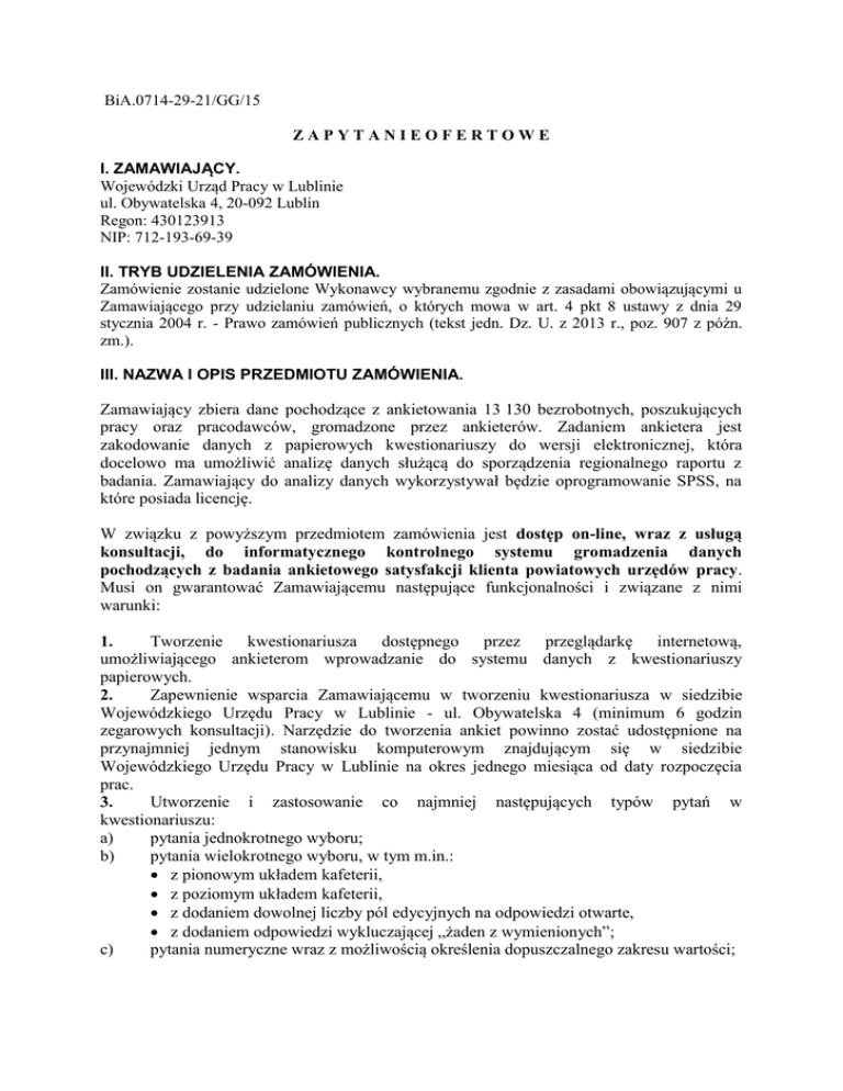 BiA.0714-29-21/GG/15 ZAPYTANIEOFERTOWE I. ZAMAWIAJĄCY. Wojewódzki Urząd Pracy w Lublinie ul. Obywatelska 4, 20-092 Lublin Regon: 430123913 NIP: 712-193-69-39 II. TRYB UDZIELENIA ZAMÓWIENIA. Zamówienie zostanie udzielone Wykonawcy wybranemu zgodnie z zasadami obowiązującymi u Zamawiającego przy udzielaniu zamówień, o których mowa w art. 4 pkt 8 ustawy z dnia 29 stycznia 2004 r. - Prawo zamówień publicznych (tekst jedn. Dz. U. z 2013 r., poz. 907 z późn. zm.). III. NAZWA I OPIS PRZEDMIOTU ZAMÓWIENIA. Zamawiający zbiera dane pochodzące z ankietowania 13 130 bezrobotnych, poszukujących pracy oraz pracodawców, gromadzone przez ankieterów. Zadaniem ankietera jest zakodowanie danych z papierowych kwestionariuszy do wersji elektronicznej, która docelowo ma umożliwić analizę danych służącą do sporządzenia regionalnego raportu z badania. Zamawiający do analizy danych wykorzystywał będzie oprogramowanie SPSS, na które posiada licencję. W związku z powyższym przedmiotem zamówienia jest dostęp on-line, wraz z usługą konsultacji, do informatycznego kontrolnego systemu gromadzenia danych pochodzących z badania ankietowego satysfakcji klienta powiatowych urzędów pracy. Musi on gwarantować Zamawiającemu następujące funkcjonalności i związane z nimi warunki: 1. Tworzenie kwestionariusza dostępnego przez przeglądarkę internetową, umożliwiającego ankieterom wprowadzanie do systemu danych z kwestionariuszy papierowych. 2. Zapewnienie wsparcia Zamawiającemu w tworzeniu kwestionariusza w siedzibie Wojewódzkiego Urzędu Pracy w Lublinie - ul. Obywatelska 4 (minimum 6 godzin zegarowych konsultacji). Narzędzie do tworzenia ankiet powinno zostać udostępnione na przynajmniej jednym stanowisku komputerowym znajdującym się w siedzibie Wojewódzkiego Urzędu Pracy w Lublinie na okres jednego miesiąca od daty rozpoczęcia prac. 3. Utworzenie i zastosowanie co najmniej następujących typów pytań w kwestionariuszu: a) pytania jednokrotnego wyboru; b) pytania wielokrotnego wyboru, w tym m.in.: z pionowym układem kafeterii, z poziomym układem kafeterii, z dodaniem dowolnej liczby pól edycyjnych na odpowiedzi otwarte, z dodaniem odpowiedzi wykluczającej „żaden z wymienionych”; c) pytania numeryczne wraz z możliwością określenia dopuszczalnego zakresu wartości; d) pytania otwarte, w których odpowiedź udzielana jest poprzez wpisanie odpowiedzi tekstowej. Musi istnieć możliwość ograniczenia dopuszczalnej liczby znaków i określenia rozmiaru pola tekstowego, w następujących odmianach: ze swobodnym polem tekstowym o predefiniowanej długości, z walidacją poprawności na zasadzie wyrażeń regularnych (np. adresu mailowego), z maską oczekiwanego formatu (daty, kodu, konta, waluty, itp.), z walidacją udziałów procentowych do 100% (np. skala stałych sum), ww. możliwości wykorzystania pytań otwartych muszą być dostępne z poziomu interfejsu graficznego oprogramowania, bez wymagania znajomości od użytkowników języka skryptowego; e) pytania półotwarte, zawierające zdefiniowaną kafeterię oraz jedną lub więcej pozycji pól tekstowych do dodania do istniejącej listy odpowiedzi. Wszystkie dodane pola tekstowe muszą być dostępne do budowy dowolnych powiązań logicznych i filtrów oraz precyzyjnie rejestrowane w zbiorze wynikowym; f) pytania w formie rozwijanego menu – wybór odpowiedzi następuje z rozwijalnej listy; g) pytania z odpowiedziami w postaci obrazów z możliwością jednokrotnego i wielokrotnego wyboru; h) pytania typu kalendarz z możliwością wskazania określonej daty z wykorzystaniem mechanizmu kalendarza. 4. Dostępna możliwość wyboru, czy na dane pytanie odpowiedź będzie wymagana, czy też nie. Tworzenie ankiety, w których wszystkie pytania są na jednej stronie internetowej, jak również takich, w których pytania umieszczone są na wielu stronach, z możliwością decydowania o miejscu podziału ankiety pomiędzy stronami. Przy przejściu pomiędzy stronami odpowiedzi respondentów muszą być automatycznie zapisywane do bazy danych, bez konieczności naciskania dodatkowych przycisków. Musi istnieć możliwość „wymuszania odpowiedzi” – tzn. zamiast przejścia na kolejną stronę respondent (w przypadku badania satysfakcji ankieter w roli respondenta) powinien otrzymać informację, że nie udzielił odpowiedzi na dane pytanie, bądź udzielił odpowiedzi niepełnej. 5. Oprogramowanie musi posiadać możliwość tworzenia złożonych interaktywnych reguł przejścia pomiędzy pytaniami w ankiecie, w następującym zakresie: filtry muszą działać zarówno na podstawie odpowiedzi respondenta, jak również na podstawie danych o respondencie zgromadzonych w bazie przed realizacją badania; wymagane jest, aby było możliwe uzależnienie wyświetlenia pytania respondentowi w zależności od jego wcześniejszych odpowiedzi; projektowanie reguł przejścia musi być dostępne z poziomu interfejsu graficznego i nie może wymagać od użytkowników znajomości języka skryptowego. W przypadku pominiętych przez regułę przejścia pytań kwestionariusza musi istnieć możliwość zadeklarowania przez Zamawiającego wartości braku danych, odpowiadającego odpowiedzi „nie dotyczy”, w taki sposób, że dla pytań pominiętych przez regułę system automatycznie przyporządkuje wartość zdefiniowanego braku danych. 6. Oprogramowanie musi umożliwiać zastosowanie filtrów logicznych na poziomie pojedynczego pytania ankiety w taki sposób, że zaznaczenie jednej odpowiedzi w pytaniu wykluczać będzie możliwość wybrania pozostałych odpowiedzi. Musi posiadać funkcjonalność krzyżowej walidacji udzielanych odpowiedzi, obejmującej możliwość weryfikowania odpowiedzi z pytania lub sumy z pytań bieżących w odniesieniu do odpowiedzi na pytanie poprzedzające. 7. Kwestionariusz musi zostać umieszczony na serwerze Wykonawcy. W sytuacji, kiedy Wykonawca lub Zamawiający wykryje poważn
