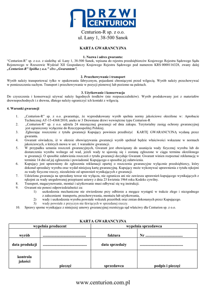 Centurion-R sp. z o.o. ul. Łany 1, 38-500 Sanok KARTA GWARANCYJNA 1. Nazwa i adres gwaranta: “Centurion-R” sp. z o.o. z siedzibą: ul. Łany 1, 38-500 Sanok, wpisana do rejestru przedsiębiorców Krajowego Rejestru Sądowego Sądu Rejonowego w Rzeszowie Wydział XII Gospodarczy Krajowego Rejestru Sądowego pod numerem KRS 0000116328, zwany dalej „Centurion-R” Spółka z o.o.” albo „Gwarantem”. 2. Przechowywanie i transport Wyrób należy transportować tylko w opakowaniu fabrycznym, pojazdami chroniącymi przed wilgocią. Wyrób należy przechowywać w pomieszczeniu suchym. Transport i przechowywanie w pozycji pionowej lub poziomo na paletach. 3. Użytkowanie i konserwacja Do czyszczenia i konserwacji używać należy łagodnych środków (nie rozpuszczalników). Wyrób produkowany jest z materiałów drewnopochodnych i z drewna, dlatego należy ograniczyć ich kontakt z wilgocią. 4. Warunki gwarancji 1. 2. 3. 4. 5. 6. 7. 8. 9. 10. „Centurion-R” sp. z o.o. gwarantuje, że wyprodukowany wyrób spełnia normy jakościowe określone w: Aprobacie Technicznej AT-15-4368/2010, aneks nr 3 Drewniane drzwi wewnętrzne typu Centurion-R „Centurion-R” sp. z o.o. udziela 24 miesięcznej gwarancji od dnia zakupu. Terytorialny zasięg ochrony gwarancyjnej jest ograniczony wyłącznie do Rzeczypospolitej Polskiej. Zgłaszając roszczenie z tytułu gwarancji Kupujący powinien przedłożyć KARTĘ GWARANCYJNĄ wydaną przez gwaranta. Gwarant oświadcza, iż w okresie obowiązywania gwarancji wyrób spełniał będzie właściwości wskazane w normach jakościowych, o których mowa w ust. 1 warunków gwarancji. W przypadku uznania roszczeń gwarancyjnych, Gwarant jest obowiązany do usunięcia wady fizycznej wyrobu lub do dostarczenia wyrobu wolnego od wad, jeżeli wady te ujawnią się i zostaną zgłoszone w ciągu terminu określonego w gwarancji. O sposobie załatwienia roszczeń z tytułu gwarancji decyduje Gwarant. Gwarant winien rozpoznać reklamację w terminie 14 dni od jej zgłoszenia i powiadomić Kupującego o sposobie jej załatwienia. Kupujący jest uprawniony do zgłoszenia reklamacji opartej o roszczenia gwarancyjne wyłącznie przedsiębiorcy, który dokonał sprzedaży wyrobu oraz wydał niniejszą kartę gwarancyjną. Kupujący może wykonywać uprawnienia z tytułu rękojmi za wady fizyczne rzeczy, niezależnie od uprawnień wynikających z gwarancji. Udzielona gwarancja na sprzedany towar nie wyłącza, nie ogranicza ani nie zawiesza uprawnień kupującego wynikających z rękojmi za wady uregulowanej przepisami ustawy z dnia 23 kwietnia 1964 roku Kodeks cywilny. Transport, magazynowanie, montaż i użytkowanie musi odbywać się wg instrukcji. Gwarant nie ponosi odpowiedzialności za: 1) uszkodzenia mechaniczne nie stwierdzone przy odbiorze a mogące wystąpić w trakcie złego i niezgodnego z zaleceniami transportu, przechowywania, montażu lub użytkowania, 2) wady i uszkodzenia wyrobu powstałe wskutek przeróbek oraz zmian dokonanych przez Kupującego. 3) wady powstałe z przyczyn nie tkwiących w sprzedanej rzeczy. Sprawy sporne wynikające z niniejszej umowy gwarancyjnej rozstrzyga sąd właściwy dla Centurion sp. z o.o. wypełnia producent KARTA GWARANCYJNA wypełnia sprzedawca wyrób ............................................ faktura Nr ...................................... data produkcji ............................................. data sprzedaży ............................................ pieczęć sprzedawca kontrola jakości www.centurion.com.pl podpis i pieczęć Centurion-R sp. z o. o. ul. Łany 1, 38-500 Sanok Instrukcja montażu skrzydła drzwiowego Montaż skrzydła drzwiowego można przeprowadzić dopiero po ukończeniu wszystkich innych prac jak np. malowanie, układanie podłogi itp.. Nie można przeprowadzać montażu skrzydła w pomieszczeniach brudnych i wilgotnych. Montaż 1. Rozpakować skrzydło i sprawdzić: jakość wykonania elementów (obróbka, malowanie) dokładność wykonania elementów ( wymiary, prostoliniowość krawędzi, płaskość powierzchni) kompletność Przystąpienie do montażu wskazuje, że skrzydło drzwiowe zostało odebrane pod względem jakościowym (wolne od wad jawnych) 2. 3. Sprawdzić prawidłowość montażu ościeżnicy w ścianie. Założyć skrzydło drzwiowe do ościeżnicy. Wyregulować ewentualnie położenie skrzydła w stosunku do ościeżnicy, regulując ustawienie zawiasów (wkręcając lub wykręcając je) w skrzydle i ościeżnicy. Prawidłowy montaż skrzydła i ościeżnicy powinien zapewnić jednakowe szczeliny pomiędzy skrzydłem a ościeżnicą na całej wysokości i szerokości. Uszczelka w ościeżnicy (jeżeli występuje) może ulec ściśnięciu maksymalnie o 3mm. Regulacja zawiasów nie może kompensować niedokładności w ustawieniu ościeżnicy. Założyć szyld i klamki, ewentualnie wkładkę zamka (nie wchodzą w zakres dostawy). Należy zachować ostrożność przy wykonywaniu wymienionych prac aby nie dopuścić do uszkodzenia poszczególnych elementów. 6. Stosowanie taśm malarskich jest dopuszczalne tylko na okres niezbędny do przeprowadzenia prac jednak nie dłużej niż zaleca to producent taśm (UWAGA: większość dostępnych taśm winno być usunięte do ½ godziny od czasu ich przyklejenia.) 7. Przed przystąpieniem do montażu należy dopasować długość ościeżnicy do długości skrzydła oraz istniejącego otworu montażowego. (UWAGA; niektóry typ ościeżnic jest dłuższy od skrzydła do 5 cm ze względu na różne sposoby montażu) 8. Ze względu na sposób wykończenia oraz konstrukcję skrzydła, dopuszcza się korektę długości skrzydła poprzez przycięcie drzwi od dołu z tym, że nie więcej niż dwa centymetry. Inne przeróbki powodują utratę gwarancji i mogą być przyczyną trwałej deformacji wyrobu. 9. Skrzydło drzwiowe wykonane jest z drewna oraz materiałów drewnopochodnych. Włókna drewniane są wyjątkowo podatne na zmiany wil