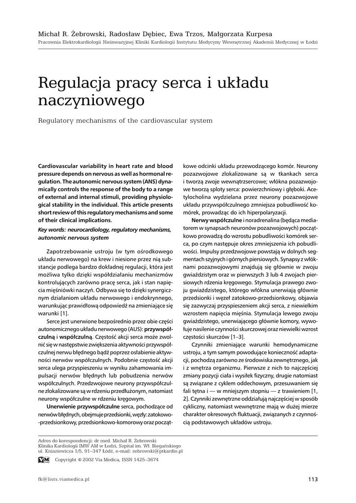 Michał R. Żebrowski, Radosław Dębiec, Ewa Trzos, Małgorzata Kurpesa Pracownia Elektrokardiologii Nieinwazyjnej Kliniki Kardiologii Instytutu Medycyny Wewnętrznej Akademii Medycznej w Łodzi Regulacja pracy serca i układu naczyniowego Regulatory mechanisms of the cardiovascular system Cardiovascular variability in heart rate and blood pressure depends on nervous as well as hormonal regulation. The autonomic nervous system (ANS) dynamically controls the response of the body to a range of external and internal stimuli, providing physiological stability in the individual. This article presents short review of this regulatory mechanisms and some of their clinical implications. Key words: neurocardiology, regulatory mechanisms, autonomic nervous system Zapotrzebowanie ustroju (w tym ośrodkowego układu nerwowego) na krew i niesione przez nią substancje podlega bardzo dokładnej regulacji, która jest możliwa tylko dzięki współdziałaniu mechanizmów kontrolujących zarówno pracę serca, jak i stan napięcia mięśniówki naczyń. Odbywa się to dzięki synergicznym działaniom układu nerwowego i endokrynnego, warunkując prawidłową odpowiedź na zmieniające się warunki [1]. Serce jest unerwione bezpośrednio przez obie części autonomicznego układu nerwowego (AUS): przywspółczulną i współczulną. Częstość akcji serca może zwolnić się w następstwie zwiększenia aktywności przywspółczulnej nerwu błędnego bądź poprzez osłabienie aktywności nerwów współczulnych. Podobnie częstość akcji serca ulega przyspieszeniu w wyniku zahamowania impulsacji nerwów błędnych lub pobudzenia nerwów współczulnych. Przedzwojowe neurony przywspółczulne zlokalizowane są w rdzeniu przedłużonym, natomiast neurony współczulne w rdzeniu kręgowym. Unerwienie przywspółczulne serca, pochodzące od nerwów błędnych, obejmuje przedsionki, węzły: zatokowo-przedsionkowy, przedsionkowo-komorowy oraz począt- kowe odcinki układu przewodzącego komór. Neurony pozazwojowe zlokalizowane są w tkankach serca i tworzą zwoje wewnątrzsercowe; włókna pozazwojowe tworzą sploty serca: powierzchniowy i głęboki. Acetylocholina wydzielana przez neurony pozazwojowe układu przywspółczulnego zmniejsza pobudliwość komórek, prowadząc do ich hiperpolaryzacji. Nerwy współczulne i noradrenalina (będąca mediatorem w synapsach neuronów pozazwojowych) początkowo prowadzą do wzrostu pobudliwości komórek serca, po czym następuje okres zmniejszenia ich pobudliwości. Impulsy przedzwojowe powstają w dolnych segmentach szyjnych i górnych piersiowych. Synapsy z włóknami pozazwojowymi znajdują się głównie w zwoju gwiaździstym oraz w pierwszych 3 lub 4 zwojach piersiowych rdzenia kręgowego. Stymulacja prawego zwoju gwiaździstego, którego włókna unerwiają głównie przedsionki i węzeł zatokowo-przedsionkowy, objawia się zazwyczaj przyspieszeniem akcji serca, z niewielkim wzrostem napięcia mięśnia. Stymulacja lewego zwoju gwiaździstego, unerwiającego głównie komory, wywołuje nasilenie czynności skurczowej oraz niewielki wzrost częstości skurczów [1–3]. Czynniki zmieniające warunki hemodynamiczne ustroju, a tym samym powodujące konieczność adaptacji, pochodzą zarówno ze środowiska zewnętrznego, jak i z wnętrza organizmu. Pierwsze z nich to najczęściej zmiany pozycji ciała i wysiłek fizyczny, drugie natomiast są związane z cyklem oddechowym, przesuwaniem się fali tętna i — w mniejszym stopniu — z trawieniem [1, 2]. Czynniki zewnętrzne oddziałują najczęściej w sposób cykliczny, natomiast wewnętrzne mają w dużej mierze charakter okresowych fluktuacji, związanych z czynnością podstawowych układów ustroju. Adres do korespondencji: dr med. Michał R. Żebrowski Klinika Kardiologii IMW AM w Łodzi, Szpital im. Wł. Biegańskiego ul. Kniaziewicza 1/5, 91–347 Łódź, e-mail: [email protected] Copyright „ 2002 Via Medica, ISSN 1425–3674 [email protected] 113 Forum Kardiologów 2002, tom 7, nr 3 Źródłem bodźców pochodzenia wewnętrznego są znajdujące się w licznych tkankach wyspecjalizowane receptory, kontrolujące ciśnienie krwi, napięcie sprężyste tkanek bądź też stężenie jonów wodorowych. Z punktu widzenia ważności dla utrzymania hemostazy układu krążenia należy wymienić w kolejności następujące ich rodzaje: — baroreceptory nisko- i wysokociśnieniowe (pierwsze zlokalizowane są w żyłach głównych i prawym przedsionku serca, drugie zaś w łuku aorty i zatokach szyjnych) [3]; — mechanoreceptory układu oddechowego oraz przedsionków i komór serca [4]; — chemoreceptory pnia mózgu i znajdujące się w dorzeczu żyły wrotnej [5]. Receptory te stanowią początek aferentnych dróg, którymi odpowiednie impulsy przekazywane są do ośrodkowego układu nerwowego. Aktywność wspomnianych receptorów zmienia się cyklicznie wraz z cyklem zmian kontrolowanych parametrów, to jest ciśnienia krwi, napięcia odpowiednich tkanek czy stężenia jonów wodorowych. W ślad za tym również cyklicznie zmienia się aktywność aferentnych neuronów błędnych i językowo-gardłowych, które są dośrodkowymi szlakami bodźców pochodzących z opisanych receptorów. Neurony te mają swoje synapsy w różnych jądrach pasma samotnego (tractus solitaris), a stąd, za pomocą neuronów pośredniczących, impulsy przekazywane są jednocześnie do ośrodka naczynioruchowego w tworze siatkowatym (formatio reticularis), w którym powstają eferentne wzorce aktywności współczulnej, oraz do jąder ruchowych nerwów błędnych i jąder dwuznacznych (nuclei ambigues), gdzie generowana jest eferentna aktywność przywspółczulna. W tych ośrodkach, a także w paśmie samotnym, następuje integracja z bodźcami pochodzącymi z wyższych struktur AUS [3, 6]. Zgodnie z cyklicznie zmieniającą się aktywnością neuronów aferentnych obu części AUS również neurony eferentne wykazują fazowoś