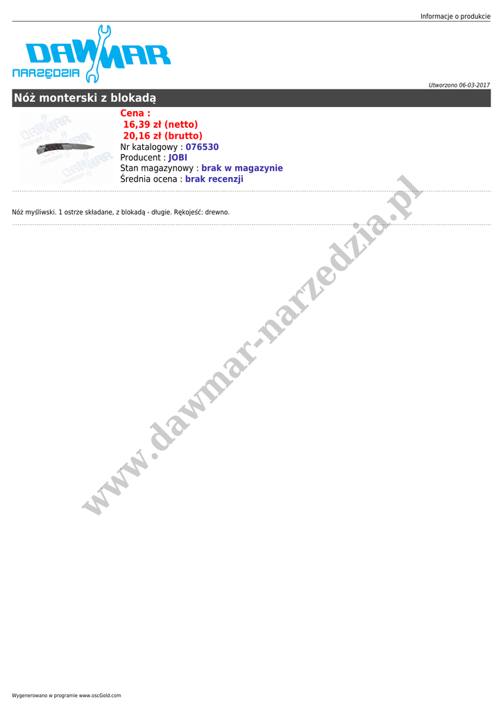 Informacje o produkcie Utworzono 06-03-2017 Nóż monterski z blokadą Cena : 16,39 zł (netto) 20,16 zł (brutto) zi a. p l Nr katalogowy : 076530 Producent : JOBI Stan magazynowy : brak w magazynie Średnia ocena : brak recenzji w w w .d aw m ar -n ar ze d Nóż myśliwski. 1 ostrze składane, z blokadą - długie. Rękojeść: drewno. Wygenerowano w programie www.oscGold.com