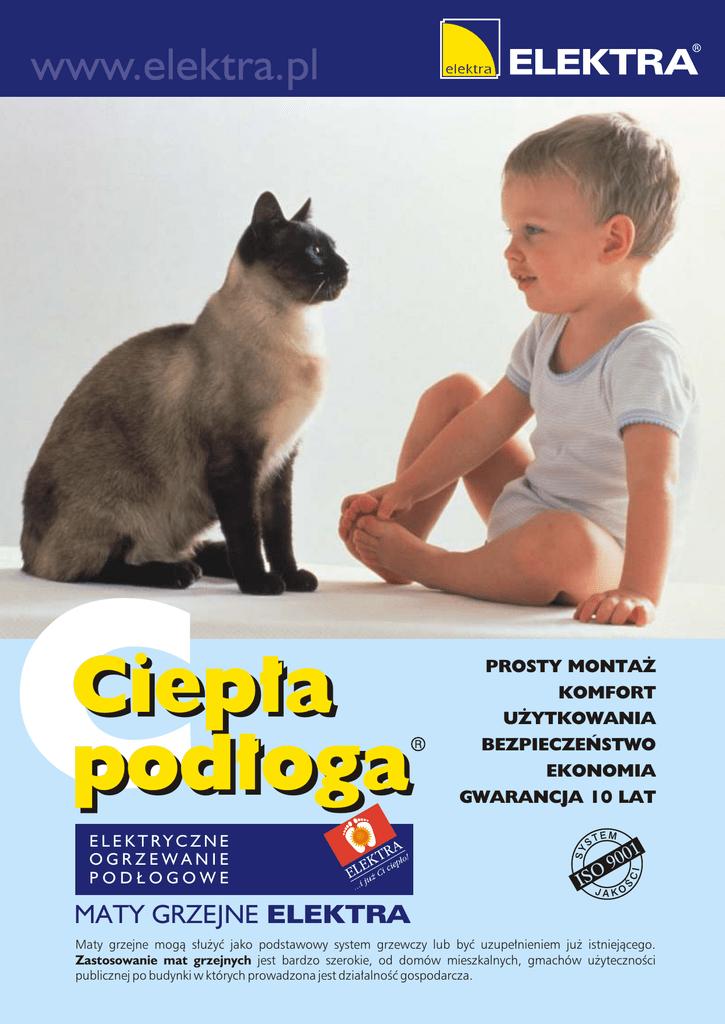 C Ciepła podłoga PROSTY MONTAŻ KOMFORT UŻYTKOWANIA BEZPIECZEŃSTWO EKONOMIA GWARANCJA 10 LAT ELEKTRYCZNE OGRZEWANIE PODŁOGOWE MATY GRZEJNE ELEKTRA Maty grzejne mogą służyć jako podstawowy system grzewczy lub być uzupełnieniem już istniejącego. Zastosowanie mat grzejnych jest bardzo szerokie, od domów mieszkalnych, gmachów użyteczności publicznej po budynki w których prowadzona jest działalność gospodarcza. Badania naukowe wykazały, że elektryczne ogrzewanie podłogowe to najkorzystniejszy dla człowieka system ogrzewania, uwzględniający fizjologiczny rozkład temperatury ciała. PIONOWY ROZKŁAD TEMPERATURY W POMIESZCZENIU DLA RÓŻNYCH TYPÓW OGRZEWANIA 16 18 20 22 24 26 0 C Dzięki bardzo małej grubości maty grzejne znalazły szerokie zastosowanie przy adaptacji i remontach istniejących rozwiązań konstrukcyjnych, które nie dopuszczają możliwości podniesienia podłogi. Maty grzejne mogą być również wykorzystane w nowym budownictwie, oraz wszędzie tam, gdzie nie można zastosować typowego ogrzewania podłogowego w postaci przewodów grzejnych. elektryczne ogrzewanie podłogowe profil idealny grzejniki konwekcyjne usytuowane przy ścianach wewnętrznych ogrzewanie powietrzne Maty grzejne ELEKTRA mogą być wykorzystywane pod każdym typem podłogi przystosowanym do ogrzewania podłogowego, tzn. pod podłogą dobrze oddającą ciepło, np. terakota, posadzka kamienna jak również wykładzina dywanowa. Polecamy ją jako bardzo skuteczny system dogrzewający. W przypadku dobrej izolacji termicznej pod podłogą z powodzeniem może być również wykorzystana jako system podstawowy. Jest to najszybszy, najprostszy, najefektywniejszy sposób dogrzania pomieszczeń lub tylko wybranych miejsc - przy minimalnym nakładzie pracy. 1 2 3 Montaż maty grzejnej jest bardzo prosty. Postępując zgodnie z załączoną do produktu szczegółową instrukcją jesteś w stanie bez kłopotu wykonać u siebie w domu prawidłowo funkcjonujące ogrzewanie podłogowe. 4 Maty grzejne jednostronnie zasilane dzięki swojej budowie są jeszcze prostsze w układaniu i montażu. Maty dwustronnie zasilane są cieńsze, natomiast podczas układania należy pamietać aby oba przewody zimne zostały doprowadzone do jednego punktu zasilającego. Przykład ułożenia maty grzejnej Dzięki dobrze dobranym regulatorom zaoszczędzisz Wykres pracy regulatora elektromechanicznego i elektronicznego Temperatura °C 30% Regulator elektromechaniczny Czas Regulator elektroniczny energii REGULATORY ELEKTRONICZNE Z PROGRAMATOREM Łączą w sobie zalety regulatorów elektronicznych z "inteligencją" cyfrowego układu sterującego. Możliwość programowania temperatury w cyklu dzień/tydzień. Możliwość odczytywania na ciekłokrystalicznym wyświetlaczu danych, takich jak: temperatura rzeczywista pomieszczenia, uprzednio zaprogramowana temperatura komfortowa i ekonomiczna, czas pracy systemu grzejnego, numer programu oraz jego graficzny symbol. Wybrane modele mają funkcję adaptacyjną: regulator temperatury sam "wylicza" moment włączenia ogrzewania, aby osiągnąć pożądaną temperaturę o zaprogramowanej porze. Obciążalność do 3600W. Montowane natynkowo lub podtynkowo. Cztery zdarzenia: pobudka, wyjście, powrót, noc. Do każdego z nich indywidualnie programowany czas oraz temperatura. To nowatorskie rozwiązanie pozwala na programowanie nawet czterech poziomów temperatury w różnych godzinach. Poprzez duży ciekłokrystaliczny wyświetlacz oraz symbole graficzne programowanie odbywa się z "dziecinną łatwością". Posiada funkcję adaptacyjną. Możliwy montaż w podwójnej ramce, np. z wyłącznikiem światła. ELEKTRA OCC2 REGULATORY ELEKTRONICZNE Najczęściej stosowane. Podstawową ich zaletą jest duża dokładność pomiaru temperatury (0,3oC ÷ 0,1oC). Pracują bezgłośnie. Wyposażone są w czujnik powietrzny, podłogowy lub powietrzny i podłogowy z zabezpieczeniem podłogi przed przegrzaniem. Obciążalność do 3600W. Montowane natynkowo lub podtynkowo. Możliwość współpracy z zegarem sterującym pozwala zaoszczędzić do 30% energii elektrycznej. ELEKTRA OTN z obniżką temperatury może być podłączony do zewnętrznego zegara "dzień / tydzień", na którym można programować okresy temperatury komfortowej i ekonomicznej. Ukrytymi pod pokrętłem pierścieniami można ograniczyć mechanicznie zakres obrotu pokrętła, tzn. minimalną i maksymalną nastawę temperatury. Regulator OTN jest dostarczany w komplecie z czujnikiem podłogowym lub wbudowanym czujnikiem powietrznym. Możliwy montaż w podwójnej ramce, np. z wyłącznikiem światła. ELEKTRA OTN DANE TECHNICZNE MATY GRZEJNE ELEKTRA MD - jednostronnie zasilane ELEKTRA MG - dwustronnie zasilane RODZAJ WYMIARY POWIERZCHNIA MOC RODZAJ WYMIARY POWIERZCHNIA MOC - mxm m2 W - mxm m2 W 100 W/m2 MG 100/1,0 MG 100/1,5 MG 100/2,0 MG 100/2,5 MG 100/3,0 MG 100/3,5 MG 100/4,5 MG 100/5,0 MG 100/6,0 MG 100/8,0 MG 100/9,0 MG 100/10,0 MG 100/12,0 0,5 x 2,0 0,5 x 3,0 0,5 x 4,0 0,5 x 5,0 0,5 x 6,0 0,5 x 7,0 0,5 x 9,0 0,5 x 10,0 0,5 x 12,0 0,5 x 16,0 0,5 x 18,0 0,5 x 20,0 0,5 x 24,0 100 W/m2 1,00 1,50 2,00 2,50 3,00 3,50 4,50 5,00 6,00 8,00 9,00 10,00 12,00 100 150 200 250 300 350 450 500 600 800 900 1000 1200 MD 100/1,0 MD 100/1,5 MD 100/2,0 MD 100/2,5 MD 100/3,0 MD 100/3,5 MD 100/4,0 MD 100/4,5 MD 100/5,0 MD 100/6,0 MD 100/8,0 MD 100/10,0 MD 100/12,0 160 W/m2 MG 160/1,0 MG 160/1,5 MG 160/2,0 MG 160/2,5 MG 160/3,0 MG 160/3,5 MG 160/4,0 MG 160/5,0 MG 160/6,0 MG 160/7,0 MG 160/8,0 MG 160/9,0 MG 160/10,0 0,5 x 2,0 0,5 x 3,0 0,5 x 4,0 0,5 x 5,0 0,5 x 6,0 0,5 x 7,0 0,5 x 8,0 0,5 x 10,0 0,5 x 12,0 0,5 x 14,0 0,5 x 16,0 0,5 x 18,0 0,5 x 20,0 0,5 x 2,0 0,5 x 3,0 0,5 x 4,0 0,5 x 5,0 0,5 x 6,0 0,5 x 7,0 0,5 x 8,0 0,5 x 9,0 0,5 x 10,0 0,5 x 12,0 0,5 x 16,0 0,5 x 20,0 0,5 x 24,0 1,00 1,50 2,00 2,50 3,00 3,50 4,00 4,50 5,00 6,00 8,00 10,00 12,00 100 150 200 250 300 350 400 450 500 600 800 1000 1200 1,00 1,50 2,00 2,50 3,00 3,50 4,0