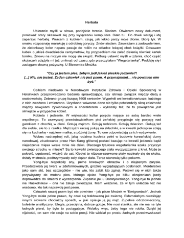 Herbata Ubieranie myśli w słowa, podejście trzecie. Siadam. Otwieram nowy dokument, ponieważ stary skasował się przy wyłączeniu komputera. Biało tu. Po chwili wstaję i idę zaparzyć herbatę. Wracam z kubkiem, czuję, jak lekko parzy moje dłonie. Biorę łyk. W smaku rozpoznaję marakuję z odrobiną goryczy. Znów siadam. Zauważam z zadowoleniem, że zielonkawy kolor naparu pasuje do roślin na okładce leżącej obok książki. Odsuwam kubek o jakieś dwadzieścia centymetrów, by przypadkiem nie zalać zielenią również kartek tomiku. Znowu na niczym nie mogę się skupić. Próbuję ustawić myśli w zdania, choć część skojarzeń zdążyła mi już umknąć od czasu, gdy przeczytałam “Wegetariankę”. Poddaję się i zaciągam słowną pożyczkę. U Sławomira Mrożka. “Czy ja jestem pies, żebym jadł jakieś pieskie jedzenie?! [...] Nie, nie jesteś. Żaden człowiek nie jest psem. A przynajmniej... nie powinien nim być.” Całkiem niedawno w Narodowym Instytucie Zdrowia i Opieki Społecznej w Helsinkach przeprowadzono badania sprawdzające, czy istnieje związek między dietą a osobowością. Zebrano grupę liczącą 1608 seniorów. Wypełnili oni kwestionariusze, każdego z nich zważono i zmierzono. Uzyskane wówczas dane nie tylko potwierdziły silną zależność między nawykami żywieniowymi a charakterem wykazały też, że to powiązanie jest silniejsze w przypadku kobiet. Kobieta i jedzenie. W większości kultur pojęcia mające ze sobą bardzo wiele wspólnego. To zazwyczaj przedstawicielkom płci żeńskiej przypisuje się pozycję nad garnkiem z chochlą w dłoni. Gotują mężom. Gotują rodzicom. Gotują dzieciom. Gotują też dla siebie, ale to z rzadka. Mężczyźni raczej polują na składniki, a w kwestii jadłospisu zdają się na kucharkę najpierw matkę, a później żonę. To one odpowiadają za ich wyżywienie. Wobec nadrzędnej roli, jaką rodzima kuchnia pełni w budowie koreańskiej dumy narodowej, zbudowanie przez Han Kang głównej postaci bazując na kwestii jedzenia bądź niejedzenia mięsa wcale mnie nie dziwi. Dlaczego tytułowa wegetarianka szuka przyczyn swojego strachu w mięsie? Są to kawałki zwierzęcego ciała wyczyszczone z krwi. Może je pokroić, ugotować, włożyć do ust. Kiedyś te różowoczerwone płaty napinały się do skoku, drżały w stresie, podtrzymywały cały ciężar ciała. Teraz stanowią tylko pokarm. Yonghye niepokoiły sny, pełne krwawych obrazów i o niejasnym zarysie. Przedstawiały jej twarz w zdeformowanych, groźnie wyglądających odsłonach. Morderstwo jako sam akt, bez szczegółów nie wie, kto zabił, kto zginął. Pojawił się w nich także przywiązany do motoru pies, którego ojciec Yonghye po kilku okrążeniach jazdy doprowadza do śmierci z wyczerpania. Zupełnie jak u Dostojewskiego. Yonghye to jednak nie Raskolnikow ona nie żałuje zwierzęcia. Mam wrażenie, że w tym układzie też nie wiadomo, kto tak naprawdę jest psem. Człowiek raczej psem być nie powinien jak pisze Mrożek w “Emigrantach”. Jednak Yonghye miała pełne prawo, by czuć się traktowaną jak zwierzę. Skłamałabym określając innymi słowami chociażby sposób, w jaki opisuje ją jej mąż. Zupełnie odczłowieczony, boleśnie analityczny. Uległa, przeciętna, dobrze gotuje. Nie nosi stanika, ale nie ma na tyle ładnych piersi, by było to pociągające. Wolałby więc, żeby tego nie robiła. Dzięki jej nijakości, on sam nie czuje na sobie presji. Nie widział po prostu żadnych przeciwwskazań do małżeństwa. Wyselekcjonował ją tak, jak wybiera się gatunek psa pasujący do nawyków przyszłego właściciela. Gdy tylko Yonghye zaczęła stawiać opór, wyłamywać poza ramy podręcznikowej dobrej żony, złożył wniosek o udzielenie rozwodu oddał niesfornego szczeniaka do schroniska. Ten sam schemat powtarza się. W jej wspomnieniach pełno traumatycznych obrazów z udziałem agresywnego ojca. Starsza siostra przez dłuższy czas nawet nie podejmuje próby zrozumienia Yonghye ona oszalała, przecież to oczywiste. Inhye próbuje więc wegetariankę przywrócić do pionu. Wytresować. Być może Yonghye spożywając mięso ma wrażenie zjadania samej siebie, a przynajmniej czegoś bardzo do niej podobnego, przynależącego do tego samego gatunku. Jednak w “Wegetariance” granica między ofiarą a mordercą jest bardzo cienka i postrzępiona. Każdy krzywdzący jest jednocześnie krzywdzonym. Decyzja Yonghye, chociaż miała ona do niej pełne prawo, spowodowała wydarzenia, które znacznie zaburzyły życie jej męża i rodziny. Jej przestawienie się na wegetarianizm było niczym brzdęknięcie naczyń w opowiadaniu Youngha Kim wywołało lawinę tragicznych zdarzeń, chociaż samo w sobie mogło wydawać się nieszkodliwe. Człowiek człowiekowi wilkiem. Między innymi dlatego Yonghye zdecydowała się na ucieczkę z tego świata zwierząt. Zechciała, by na jej ciele rosły kwiaty, dłonie zapuściły się głęboko w glebę i chłonęły wodę, by karmiły ją promienie słońca. Rośliny nie krzywdzą. Mężczyzna z namalowanymi na ciele kwiatami przestaje mieć postać oprawcy i zagrożenia, a przeobraża się w coś pięknego i delikatnego. Ludzie są zbyt skomplikowani, zbyt skupieni na sobie. A przez to niebezpieczni. W miarę opróżniania kubka do głowy przychodzą mi kolejne cytaty. Ten jest autorstwa Anny Świrczyńskiej. “Potem przyjdą ludzie. Dadzą mi skórę, kolor oczu, płeć i nazwisko. Dadzą przeszłość i przyszłość gatunku homo sapiens.” Czy poza biologią istnieje coś takiego jak definicja człowieka? Pytam, ponieważ z punktu widzenia systematyki to bardzo proste. Człowiek to ssak z rodziny człowiekowatych, przedstawiciel rodzaju Homo. Wyróżnia go większa pojemność czaszki, wyprostowana postawa, wzrost. Jednak z jakiegoś powodu mówimy, że człowiek może być nieludzki. Co w takim razie stanowi normę ludzkiego zachowania? Na drab