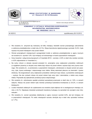 URZĄD STATYSTYCZNY W WARSZAWIE ul. 1 Sierpnia 21, 02-134 Warszawa Kontakt: e-mail:[email protected] tel. 22 464 23 15 faks 22 846 76 67 Internet: www.stat.gov.pl/warsz KOMUNIKAT O SYTUACJI SPOŁECZNO-GOSPODARCZEJ WOJEWÓDZTWA MAZOWIECKIEGO WE WRZEŚNIU 2012 R. Nr 9/2012 opublikowany 26.10.2012 *** ⇒ We wrześniu br. utrzymał się notowany od kilku miesięcy niewielki wzrost przeciętnego zatrudnienia w sektorze przedsiębiorstw w skali roku (0,1%). Stopa bezrobocia rejestrowanego wyniosła 10,2% i była wyższa niż przed miesiącem oraz przed rokiem. ⇒ Wzrost przeciętnych miesięcznych wynagrodzeń brutto w sektorze przedsiębiorstw w ujęciu rocznym we wrześniu br. wyniósł 1,9% i był mniejszy od notowanego w trzech poprzednich miesiącach. ⇒ Ceny towarów i usług konsumpcyjnych w II kwartale 2012 r. wzrosły o 3,9% w skali roku (wobec wzrostu o 4,0% odpowiednio w I kwartale br.). ⇒ Na rynku rolnym w okresie styczeń–wrzesień br. przeciętne ceny większości produktów roślinnych (z wyjątkiem pszenicy w skupie) oraz mleka były niższe niż przed rokiem; wyższe były ceny żywca rzeźnego. We wrześniu br., w porównaniu z poprzednim miesiącem, odnotowano w skupie wzrost cen pszenicy, żyta, żywca wołowego i wieprzowego oraz mleka. Mniej natomiast płacono za ziemniaki i żywiec drobiowy. Na targowiskach ceny większości produktów roślinnych były niższe, a produktów zwierzęcych – wyższe. Na obu rynkach niższe niż przed rokiem były ceny żyta i ziemniaków, a także ceny skupu mleka. Poprawiła się opłacalność produkcji żywca wieprzowego. ⇒ We wrześniu br. odnotowano spadek produkcji sprzedanej przemysłu w skali roku (o 1,8%, w cenach stałych). Niższa niż przed rokiem była również produkcja budowlano-montażowa (o 24,2%, w cenach bieżących). ⇒ Liczba mieszkań oddanych do użytkowania we wrześniu była większa niż w analogicznym miesiącu ub. roku o 43,1%. Najwięcej mieszkań przekazali inwestorzy budujący na sprzedaż lub wynajem oraz indywidualni. ⇒ We wrześniu br. wzrost sprzedaży detalicznej w ujęciu rocznym wyniósł 4,6%, ale był mniejszy niż w poprzednich miesiącach. Po wielu miesiącach wzrostu obniżyła się w skali roku sprzedaż hurtowa (o 1,7%). 1 SPIS TREŚCI Strona Rynek pracy..................................................................................................................................................... 4 Wynagrodzenia................................................................................................................................................ 8 Ceny detaliczne ............................................................................................................................................. 10 Rolnictwo ....................................................................................................................................................... 12 Przemysł i budownictwo ................................................................................................................................ 16 Budownictwo mieszkaniowe.......................................................................................................................... 18 Rynek wewnętrzny......................................................................................................................................... 21 Wybrane dane o województwie mazowieckim .............................................................................................. 22 UWAGI OGÓLNE • • • • • Prezentowane w Komunikacie dane: o zatrudnieniu, wynagrodzeniach oraz o produkcji sprzedanej przemysłu i budownictwa, produkcji budowlano-montażowej, a także o sprzedaży detalicznej i hurtowej towarów dotyczą podmiotów gospodarczych, w których liczba pracujących przekracza 9 osób, o sektorze przedsiębiorstw, dotyczą podmiotów prowadzących działalność gospodarczą w zakresie: leśnictwa i pozyskiwania drewna; rybołówstwa w wodach morskich; górnictwa i wydobywania; przetwórstwa przemysłowego; wytwarzania i zaopatrywania w energię elektryczną, gaz, parę wodną, gorącą wodę i powietrze do układów klimatyzacyjnych; dostawy wody; gospodarowania ściekami i odpadami oraz działalności związanej z rekultywacją; budownictwa; handlu hurtowego i detalicznego; naprawy pojazdów samochodowych, włączając motocykle; transportu i gospodarki magazynowej; działalności związanej z zakwaterowaniem i usługami gastronomicznymi; informacji i komunikacji; działalności związanej z obsługą rynku nieruchomości; działalności prawniczej, rachunkowo-księgowej i doradztwa podatkowego, działalności firm centralnych (head offices); doradztwa związanego z zarządzaniem; działalności w zakresie architektury i inżynierii; badań i analiz technicznych; reklamy, badania rynku i opinii publicznej; pozostałej działalności profesjonalnej, naukowej i technicznej; działalności w zakresie usług administrowania i działalności wspierającej; działalności związanej z kulturą, rozrywką i rekreacją; naprawy i konserwacji komputerów i artykułów użytku osobistego i domowego; pozostałej indywidualnej działalności usługowej, o cenach detalicznych dotyczą towarów żywnościowych i nieżywnościowych oraz usług, które pochodzą z notowań cen prowadzonych przez ankieterów w wybranych punktach sprzedaży, w wytypowanych rejonach badania cen; ceny żywności notowane są raz w miesiącu z wyjątkiem owoców i warzyw, w zakresie których notowania cen prowadzone są dwa razy w miesiącu, o skupie produktów rolnych obejmują skup od producentów z terenu województwa; ceny podano bez podatku VAT, o wynikach finansowych przedsiębiorstw oraz nakładach inwestycyjnych dotyczą podmiotów gospodarczych prowadzących księgi rachunkowe (z wyjątkiem przedsiębiorstw rolnictwa, leśnictwa, łowiectwa i rybactwa, działalności finansowej i ubezpieczeniowej oraz s