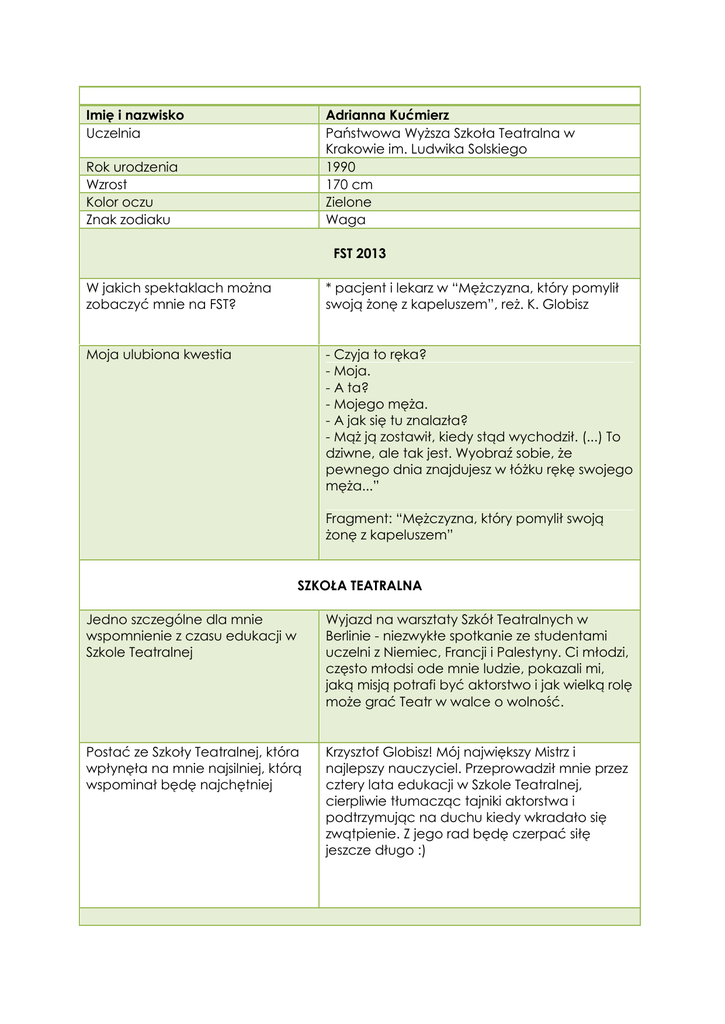 Imię i nazwisko Uczelnia Adrianna Kućmierz Państwowa Wyższa Szkoła Teatralna w Krakowie im. Ludwika Solskiego 1990 170 cm Zielone Waga Rok urodzenia Wzrost Kolor oczu Znak zodiaku FST 2013 W jakich spektaklach można zobaczyć mnie na FST? * pacjent i lekarz w “Mężczyzna, który pomylił swoją żonę z kapeluszem”, reż. K. Globisz Moja ulubiona kwestia - Czyja to ręka? - Moja. - A ta? - Mojego męża. - A jak się tu znalazła? - Mąż ją zostawił, kiedy stąd wychodził. (...) To dziwne, ale tak jest. Wyobraź sobie, że pewnego dnia znajdujesz w łóżku rękę swojego męża...” Fragment: “Mężczyzna, który pomylił swoją żonę z kapeluszem” SZKOŁA TEATRALNA Jedno szczególne dla mnie wspomnienie z czasu edukacji w Szkole Teatralnej Wyjazd na warsztaty Szkół Teatralnych w Berlinie - niezwykłe spotkanie ze studentami uczelni z Niemiec, Francji i Palestyny. Ci młodzi, często młodsi ode mnie ludzie, pokazali mi, jaką misją potrafi być aktorstwo i jak wielką rolę może grać Teatr w walce o wolność. Postać ze Szkoły Teatralnej, która wpłynęła na mnie najsilniej, którą wspominał będę najchętniej Krzysztof Globisz! Mój największy Mistrz i najlepszy nauczyciel. Przeprowadził mnie przez cztery lata edukacji w Szkole Teatralnej, cierpliwie tłumacząc tajniki aktorstwa i podtrzymując na duchu kiedy wkradało się zwątpienie. Z jego rad będę czerpać siłę jeszcze długo :) O MNIE Co umiem, czym się chwalę? Dobrze tańczę (jestem instruktorem salsy), śpiewam, gram na fortepianie, mam wiele pasji: żeglarstwo, jazda konna, jazda na nartach, malarstwo. Uczenie się nowych rzeczy sprawia mi przyjemność i przychodzi z łatwością. Pracuję przy tworzeniu gier komputerowych w technice Motion Capture. Czego nie potrafię? Nie potrafię szybko biegać... doskwiera mi też to, że nie mówię po hiszpańsku, choć bardzo bym chciała. Ale po dyplomie zabieram się za siebie! Aktor jest po to by… Chcę się dzielić swoją energią i nie potrafię żyć bez żadnej dziedziny sztuki, które łączy w sobie Teatr. Ja jestem aktorem bo… To, że znikają wszystkie prozaiczne myśli i codzienne problemy. W teatrze kocham… To, że znikają wszystkie prozaiczne myśli i codzienne problemy. MOJE PLANY Zawodowa propozycja nie do odrzucenia/ zawodowa propozycja konieczna do odrzucenia TAK: spektakl muzyczny, film kostiumowy. NIE: nieuzasadnione sceny wulgarne/obsceniczne Marzę o… TEATR: Chciałabym zagrać w sztuce Falka Richtera, współpracować nadal z Wojciechem Kościelniakiem. W Krakowie marzy mi się Teatr STU i oczywiście Teatr Stary, w Warszawie Dramatyczny. Ogromnie ucieszyłabym się z możliwości zagrania w Teatrze Telewizji. FILM: Marzę o współpracy z Andrzejem Wajdą, a z młodych reżyserów - Jankiem Komasą. Za granicą? Almodovar albo Tarantino! Poza tradycyjnym aktorstwem bardzo chciałabym tworzyć filmy w technice Motion Capture.