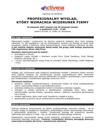 zaprasza na szkolenie: PROFESJONALNY WYGLĄD, KTÓRY WZMACNIA WIZERUNEK FIRMY 23 listopada 2007 (piątek) lub 28 listopada (środa) w godzinach: 9:30 - 17:00 Galeria na Kole, ul. Ciołka 16, Warszawa Dla kogo szkolenie? Odpowiedni wygląd i zachowanie nie dotyczą wyłącznie osobistej sfery życia każdego człowieka. To, jak wyglądamy i jak się zachowujemy, przenosi się również na nasze życie zawodowe i opinię o instytucji, którą reprezentujemy. Coraz dobitniej podkreśla się fakt, w jak wielkim stopniu wizerunek danej osoby lub grupy osób buduje pozytywny (lub negatywny) obraz całej firmy. Szkolenie skierowane jest do kobiet: ■ pracujących w biurze, ■ mających częsty kontakt z klientami swojej firmy (Dział Handlowy, Dział Obsługi Klientów, Recepcja, itp.), ■ i innych reprezentujących swoją firmę na zewnątrz (Dział Marketingu, Public Relations i inne). Korzyści ze szkolenia Wygląd, styl, zachowanie osób mających bezpośredni kontakt z klientami często wywiera dużo większe wrażenie niż merytoryczna wartość wypowiadanych słów. Wizerunek zewnętrzny pracowników jest istotnym elementem ich prestiżu zawodowego i równocześnie jest fundamentem i świadectwem ogólnego wizerunku firmy. Oferowane szkolenie: ■ dostarczy solidną, usystematyzowaną i przejrzystą wiedzę na temat profesjonalnego ubioru i zachowania kobiety w jej środowisku pracy, ■ podniesie praktycznie umiejętności kobiet w kreowaniu własnego wyglądu, ■ wzbogaci w wiedzę pomocną w kształtowaniu osobistego stylu, który będzie odzwierciedlać wartość kobiety, zawodowy prestiż i właściwe rozumienie sprawowanej roli w firmie, ■ wskaże zagrożenia, jakie może nieść niewłaściwy wygląd w pracy, ■ bezpośrednio przyczyni się do udoskonalenia wizerunku przedsiębiorstwa. Zakres szkolenia Podczas szkolenia prezentowane są zasady profesjonalnego wizerunku kobiety - na co zwracać uwagę, by wygląd był wiarygodny, podkreślający prestiż zajmowanego stanowiska, a jednocześnie atrakcyjny i kobiecy. Uczestniczki poznają też praktyczne sposoby właściwego korzystania z mody - tak, by nie zepsuć profesjonalnego wrażenia. Współczesna rzeczywistość stawia przed kobietami prawdziwe wyzwania w dziedzinie kreowania własnego wizerunku. Trenerzy i konsultanci Activeny pomagają stworzyć wizerunek korzystny dla firmy i uczestniczek szkolenia. TEMATYKA SZKOLENIA: Zasady elegancji – ubiór do pracy ■ Jaki wpływ ma nasz wygląd na innych – elementy profesjonalnego stroju kobiety. ■ Związek między indywidualnym stylem a wizerunkiem firmy, ■ Wizerunek a kariera zawodowa – jak nas oceniają inni, ■ Jak wygrywać poprzez własny wygląd – praktyczne wskazówki. Kompletowanie ubioru ■ Jak kompletować garderobę, by nie ponosić nadmiernych wydatków? ■ Jak korzystać z mody? ■ Jak radzić sobie podczas upału? Dodatki ■ Rola dodatków w komponowaniu stroju. ■ Dobór dodatków do typu urody (kolory, wielkości) - ogólne wskazówki. ■ Jakie dodatki są odpowiednie do pracy, a jakie na inne okazje. Dobór fasonów do sylwetki ■ Elementy komponowania stroju. ■ Analiza sylwetki. ■ Zasady dobierania najodpowiedniejszych fasonów do typów sylwetek. Analiza kolorystyczna ■ Zasady indywidualnego doboru kolorów do osoby. ■ Analiza kolorystyczna na konkretnym przykładzie. Makijaż do pracy ■ Dobór do typu urody - przykłady rozwiązań dobrych i złych, ogólne zasady. ■ Jaki makijaż jest odpowiedni do pracy, a jaki nie - praktyczne wskazówki. Fryzury i ozdoby włosów ■ Jakie typy fryzur są odpowiednie do pracy, a jakie nie. ■ Jakie ozdoby do włosów są właściwe w pracy, a jakie na inne okazje. Metody dydaktyczne Podstawą stosowanych metod dydaktycznych jest budowanie pozytywnej motywacji uczestniczek. Elementy wizerunku nie są narzucane arbitralnie, ale wypracowywane przy aktywnym udziale uczestniczek zajęć. Metodyka szkoleniowa obejmuje: ■ zajęcia wykładowe wsparte prezentacjami multimedialnymi i rekwizytami; ■ inscenizowane praktyczne przykłady i ćwiczenia; ■ zajęcia warsztatowe dla całej grupy; ■ moderowane dyskusje podsumowujące poszczególne sesje. Trenerzy Szkolenie będzie prowadzone i konsultantów wizerunku. przez ekspertów z dziedziny etykiety biznesu Trenerzy Activeny mają za sobą wieloletnie doświadczenia w pracy zawodowej w dziedzinach takich jak profesjonalne szkolenia dla kadry kierowniczej i działów handlowych, zarządzanie sprzedażą i marketingiem w międzynarodowych firmach, konsultacje wizerunku, stylizacja i wizaż. Zgłoszenie Na zgłoszenia, wyłącznie na formularzu zgłoszeniowym, czekamy do 12.11.2007. Prosimy o kontakt z Kingą Rogulską: tel. 0-668 197 876, fax: (22) 889 89 52, e-mail: [email protected] ACTIVENA Szkolenia i doradztwo marketingowe, ul. Poetów 10B/16, 03-147 Warszawa tel./fax: (22) 889 89 52, e-mail: [email protected], www.activena.pl