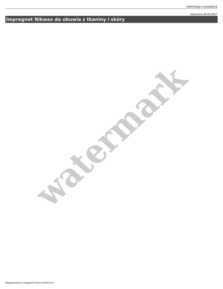 Informacje o produkcie Utworzono 06-03-2017 w at er m ar k Impregnat Nikwax do obuwia z tkaniny i skóry Wygenerowano w programie www.oscGold.com Cena : 29.00 zł w at er m ar k Nr katalogowy : 1042 Producent : Nikwax Dostępność : Dostępny Stan magazynowy : bardzo wysoki Średnia ocena : brak recenzji Informacje o produkcie w at er m ar k Impregnat w atomizerze. Pojemność: 125ml Wygenerowano w programie www.oscGold.com