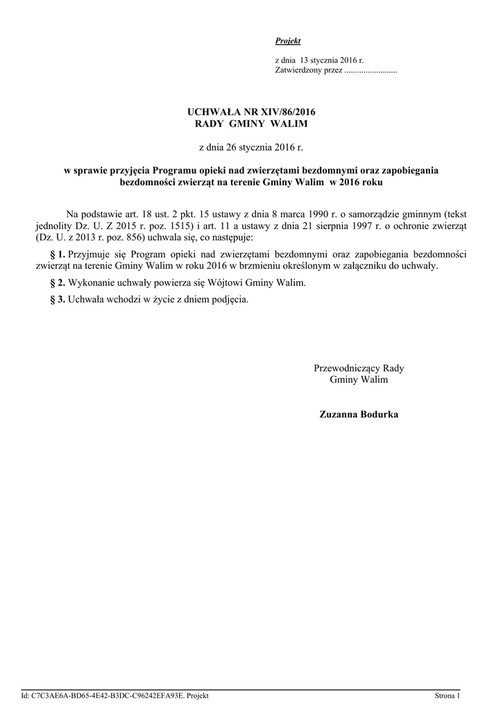 Projekt z dnia 13 stycznia 2016 r. Zatwierdzony przez ......................... UCHWAŁA NR XIV/86/2016 RADY GMINY WALIM z dnia 26 stycznia 2016 r. w sprawie przyjęcia Programu opieki nad zwierzętami bezdomnymi oraz zapobiegania bezdomności zwierząt na terenie Gminy Walim w 2016 roku Na podstawie art. 18 ust. 2 pkt. 15 ustawy z dnia 8 marca 1990 r. o samorządzie gminnym (tekst jednolity Dz. U. Z 2015 r. poz. 1515) i art. 11 a ustawy z dnia 21 sierpnia 1997 r. o ochronie zwierząt (Dz. U. z 2013 r. poz. 856) uchwala się, co następuje: § 1. Przyjmuje się Program opieki nad zwierzętami bezdomnymi oraz zapobiegania bezdomności zwierząt na terenie Gminy Walim w roku 2016 w brzmieniu określonym w załączniku do uchwały. § 2. Wykonanie uchwały powierza się Wójtowi Gminy Walim. § 3. Uchwała wchodzi w życie z dniem podjęcia. Przewodniczący Rady Gminy Walim Zuzanna Bodurka Id: C7C3AE6A-BD65-4E42-B3DC-C96242EFA93E. Projekt Strona 1 Uzasadnienie Ustawy o ochronie zwierząt z dnia 21 sierpnia 1997 r. (Dz. U. z 2013 r. poz. 856) nakłada na Rade Gminy obowiązek określenia w drodze uchwały, corocznie do dnia 31 marca Programu opieki nad zwierzętami bezdomnymi oraz zapobiegania bezdomności zwierząt. Stanowi to wypełnienie obowiązku zapewnienia opieki bezdomnym zwierzętom przez gminę, wynikającego z art. 11 ust. 1 ww. ustawy. Zgodnie z ustawą o ochronie zwierząt uchwalanie przez gminy programu opieki nad zwierzętami bezdomnymi oraz zapobiegania bezdomności zwierząt, przyczyni się do ograniczenia bezdomności zwierząt. Projekt Programu został przedstawiony do zaopiniowania następującym instytucjom : 1. Powiatowemu Lekarzowi Weterynarii w Wałbrzychu, 2. Towarzystwu Opieki nad zwierzętami w Polsce, Zarząd Główny w Warszawie, 3. Dzierżawcom i zarządcom obwodów łowieckich, działających na terenie gminy. Sporządziła Adriana Zygadło Id: C7C3AE6A-BD65-4E42-B3DC-C96242EFA93E. Projekt Strona 2 Program opieki nad zwierzętami bezdomnymi oraz zapobiegania bezdomności zwierząt na terenie Gminy Walim w roku 2016 WPROWADZENIE „Zwierzę, jako istota żyjąca, zdolna do odczuwania cierpienia, nie jest rzeczą. Człowiek jest mu winien poszanowanie, ochronę i opiekę.” (art. 1 ustawy z dnia 21 sierpnia 1997 r. o ochronie zwierząt). Podstawą prawną podjęcia przez Radę Gminy Walim uchwały w sprawie „Programu opieki nad zwierzętami bezdomnymi oraz zapobiegania bezdomności zwierząt na terenie Gminy Walim” jest art. 11a ustawy z dnia 21 sierpnia 1997 r. o ochronie zwierząt. (Dz. U. 1997 r. nr 111 poz. 724). Program ma zastosowanie do wszystkich zwierząt domowych, w szczególności psów i kotów, w tym kotów wolno żyjących oraz zwierząt gospodarskich. Bezdomność zwierząt jest zjawiskiem społecznym, którego głównymi przyczynami są : 1. niekontrolowane rozmnażanie; 2. porzucanie zwierząt przez właścicieli; 3. ucieczki zwierząt; 4. łatwość pozyskiwania zwierząt; 5. panujące mody na dane rasy zwierząt; 6. brak edukacji i wiedzy społeczeństwa w zakresie zapobiegania bezdomności, ze szczególnym uwzględnieniem sterylizacji i kastracji. Elektroniczne znakowanie (czipowanie) zwierząt to jedna z głównych metod zapobiegania bezdomności zwierząt. Sterylizacja i kastracja (pozbawienie możliwości rozmnażania) zwierząt bezdomnych oraz domowych to norma we wszystkich cywilizowanych krajach oraz najskuteczniejsza metoda unikania niekontrolowanej rozrodczości zwierząt. Realizacja wszystkich zadań, określonych w rozdziale 2 Programu, zmierza do ograniczenia liczby bezdomnych zwierząt trafiających pod opiekę Schroniska dla bezdomnych zwierząt. Rozdział 1 POSTANOWIENIA OGÓLNE §1 Ilekroć w uchwale jest mowa o: 1. Schronisku, należy przez to rozumieć Schronisko dla zwierząt „AZYL” z siedzibą Dzierżoniów ul. Brzegowa 15, przy pomocy którego Gmina realizuje zapisy Programu. 2. Zwierzętach bezdomnych, należy przez to rozumieć zwierzęta domowe lub gospodarskie, które uciekły, zabłąkały się lub zostały porzucone przez człowieka, a nie ma możliwości ustalenia ich właściciela lub innej osoby, pod której opieką trwale dotąd pozostawały; 3. Zwierzętach domowych, należy przez to rozumieć zwierzęta tradycyjnie przebywające wraz z człowiekiem w jego domu lub odpowiednim pomieszczeniu, utrzymywane przez człowieka w charakterze jego towarzysza; 4. Programie, należy przez to rozumieć Program opieki nad zwierzętami bezdomnymi oraz zapobiegania bezdomności zwierząt na terenie Gminy Walim w 2016 roku. §2 1. Koordynatorem Programu jest Wójt Gminy Walim 2. Realizatorami Programu są: 1) Wójt Gminy Walim; 2) Schronisko dla bezdomnych zwierząt. Id: C7C3AE6A-BD65-4E42-B3DC-C96242EFA93E. Projekt Strona 1 Rozdział 2 CEL I ZADANIA PROGRAMU §3 1. Celem programu jest zapobieganie bezdomności zwierząt na terenie Gminy Walim oraz opieka nad zwierzętami bezdomnymi. 2. Zadania priorytetowe Programu to: a) elektroniczne znakowanie (czipowanie) zwierząt, w szczególności psów; b) ograniczanie populacji bezdomnych zwierząt poprzez sterylizację i kastrację, w szczególności psów i kotów; c) usypianie ślepych miotów; d) zapewnienie opieki bezdomnym zwierzętom z terenu Gminy; e) sprawowanie opieki nad kotami wolno żyjącymi, w tym sterylizacja, kastracja i dokarmianie; f) poszukiwanie nowych właścicieli dla bezdomnych zwierząt; g) odławianie bezdomnych zwierząt; h) zapewnienie całodobowej opieki weterynaryjnej w przypadkach zdarzeń drogowych z udziałem zwierząt; i) edukacja mieszkańców Gminy w zakresie opieki nad zwierzętami. Rozdział 3 ELEKTRONICZNE ZNAKOWANIE (CZIPOWANIE) ZWIERZĄT §4 Elektroniczne znakowanie (czipowanie) zwierząt, w szczególności psów i kotów realizują: 1) Schronisko dla bezdomnych zwierząt poprzez: a) czipowanie bezdomnych zwierząt przyjmowanych do Schroniska, b) bieżące wprowadzanie danych o zaczipowanych zwierzętach do Międzynarodowej Bazy danych 
