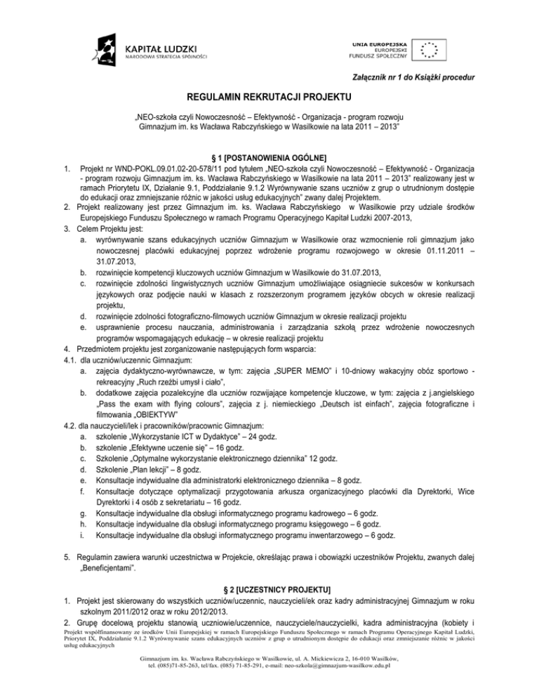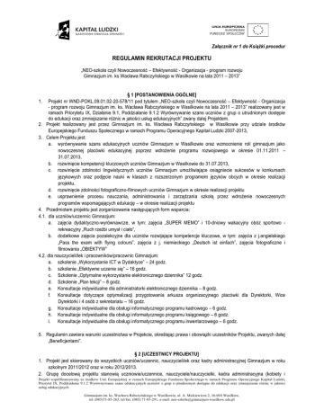 Załącznik nr 1 do Książki procedur REGULAMIN REKRUTACJI PROJEKTU „NEO-szkoła czyli Nowoczesność – Efektywność - Organizacja - program rozwoju Gimnazjum im. ks Wacława Rabczyńskiego w Wasilkowie na lata 2011 – 2013” § 1 [POSTANOWIENIA OGÓLNE] Projekt nr WND-POKL.09.01.02-20-578/11 pod tytułem „NEO-szkoła czyli Nowoczesność – Efektywność - Organizacja - program rozwoju Gimnazjum im. ks. Wacława Rabczyńskiego w Wasilkowie na lata 2011 – 2013” realizowany jest w ramach Priorytetu IX, Działanie 9.1, Poddziałanie 9.1.2 Wyrównywanie szans uczniów z grup o utrudnionym dostępie do edukacji oraz zmniejszanie różnic w jakości usług edukacyjnych” zwany dalej Projektem. 2. Projekt realizowany jest przez Gimnazjum im. ks. Wacława Rabczyńskiego w Wasilkowie przy udziale środków Europejskiego Funduszu Społecznego w ramach Programu Operacyjnego Kapitał Ludzki 2007-2013, 3. Celem Projektu jest: a. wyrównywanie szans edukacyjnych uczniów Gimnazjum w Wasilkowie oraz wzmocnienie roli gimnazjum jako nowoczesnej placówki edukacyjnej poprzez wdrożenie programu rozwojowego w okresie 01.11.2011 – 31.07.2013, b. rozwinięcie kompetencji kluczowych uczniów Gimnazjum w Wasilkowie do 31.07.2013, c. rozwinięcie zdolności lingwistycznych uczniów Gimnazjum umożliwiające osiągniecie sukcesów w konkursach językowych oraz podjęcie nauki w klasach z rozszerzonym programem języków obcych w okresie realizacji projektu, d. rozwinięcie zdolności fotograficzno-filmowych uczniów Gimnazjum w okresie realizacji projektu e. usprawnienie procesu nauczania, administrowania i zarządzania szkołą przez wdrożenie nowoczesnych programów wspomagających edukację – w okresie realizacji projektu 4. Przedmiotem projektu jest zorganizowanie następujących form wsparcia: 4.1. dla uczniów/uczennic Gimnazjum: a. zajęcia dydaktyczno-wyrównawcze, w tym: zajęcia „SUPER MEMO” i 10-dniowy wakacyjny obóz sportowo rekreacyjny „Ruch rzeźbi umysł i ciało”, b. dodatkowe zajęcia pozalekcyjne dla uczniów rozwijające kompetencje kluczowe, w tym: zajęcia z j.angielskiego „Pass the exam with flying colours”, zajęcia z j. niemieckiego „Deutsch ist einfach”, zajęcia fotograficzne i filmowania „OBIEKTYW” 4.2. dla nauczycieli/lek i pracowników/pracownic Gimnazjum: a. szkolenie „Wykorzystanie ICT w Dydaktyce” – 24 godz. b. szkolenie „Efektywne uczenie się” – 16 godz. c. Szkolenie „Optymalne wykorzystanie elektronicznego dziennika” 12 godz. d. Szkolenie „Plan lekcji” – 8 godz. e. Konsultacje indywidualne dla administratorki elektronicznego dziennika – 8 godz. f. Konsultacje dotyczące optymalizacji przygotowania arkusza organizacyjnego placówki dla Dyrektorki, Wice Dyrektorki i 4 osób z sekretariatu – 16 godz. g. Konsultacje indywidualne dla obsługi informatycznego programu kadrowego – 6 godz. h. Konsultacje indywidualne dla obsługi informatycznego programu księgowego – 6 godz. i. Konsultacje indywidualne dla obsługi informatycznego programu inwentarzowego – 6 godz. 1. 5. Regulamin zawiera warunki uczestnictwa w Projekcie, określając prawa i obowiązki uczestników Projektu, zwanych dalej „Beneficjentami”. § 2 [UCZESTNICY PROJEKTU] 1. Projekt jest skierowany do wszystkich uczniów/uczennic, nauczycieli/ek oraz kadry administracyjnej Gimnazjum w roku szkolnym 2011/2012 oraz w roku 2012/2013. 2. Grupę docelową projektu stanowią uczniowie/uczennice, nauczyciele/nauczycielki, kadra administracyjna (kobiety i Projekt współfinansowany ze środków Unii Europejskiej w ramach Europejskiego Funduszu Społecznego w ramach Programu Operacyjnego Kapitał Ludzki, Priorytet IX, Poddziałanie 9.1.2 Wyrównywanie szans edukacyjnych uczniów z grup o utrudnionym dostępie do edukacji oraz zmniejszanie różnic w jakości usług edukacyjnych Gimnazjum im. ks. Wacława Rabczyńskiego w Wasilkowie, ul. A. Mickiewicza 2, 16-010 Wasilków, tel. (085)71-85-263, tel/fax. (085) 71-85-291, e-mail: [email protected] mężczyźni) Gimnazjum im. ks. Wacława Rabczyńskiego w Wasilkowie zainteresowani usprawnieniem procesu nauczania, administrowania i zarządzania szkołą przez wdrożenie nowoczesnych programów wspomagających edukację. § 3 [PRAWA I OBOWIĄZKI BENEFICJENTÓW] 1. Beneficjent projektu ma prawo do: a. bezpłatnego udziału w zajęciach pozalekcyjnych oraz / lub pozaszkolnych, na które został zakwalifikowany, b. zgłaszania uwag i oceny zajęć, w których uczestniczy, c. bezpłatnego otrzymania zaświadczenia / dyplomu uczestnictwa w zajęciach Projektu. d. Bezpłatnych przejazdów autobusem szkolnym, który będzie dowoził na popołudniowe zajęcia pozalekcyjne / pozaszkolne. 2. Beneficjent projektu zobowiązany jest do : a. złożenia dokumentów potwierdzających uczestnictwo w Projekcie, b. uczestnictwa w co najmniej 80% zajęć, określonych w § 1 ust.4, c. aktywnego i systematycznego udziału w zajęciach, na które został zakwalifikowany, d. poddawania się systematycznie badaniom ankietowym, mającym na celu monitorowanie i raportowanie realizacji poszczególnych działań w ramach Projektu, e. informowania o wszystkich zdarzeniach mogących zakłócić dalsze uczestnictwo w Projekcie najpóźniej w przeciągu 1 dnia od czasu, w którym to zdarzenie nastąpiło, f. przedstawienia pisemnego usprawiedliwienia potwierdzonego przez rodzica lub opiekuna prawnego – w przypadku nieobecności na zajęciach, g. podpisania oświadczenia zapoznania się z niniejszym regulaminem (załącznik nr 2 – deklaracja uczestnictwa) 3. Każdy Beneficjent ma prawo do nieodpłatnego udziału w Projekcie. 1. 2. 3. 1. § 4 [WARUNKI UCZESTNICTWA W PROJEKCIE] W projekcie mogą uczestniczyć osoby, które są uczniami / uczennicami lub nauczycielami / pracownikami Gimnazjum im. ks. Wacława Rabczyńskiego w Wasilkowie w wieku 13-16 lat oraz złożą poprawnie wypełnione dokumenty rekrutacyjne stanowiące załączniki do nin