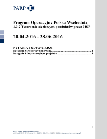 Program Operacyjny Polska Wschodnia 1.3.2 Tworzenie sieciowych produktów przez MŚP 20.04.2016 - 28.06.2016 PYTANIA I ODPOWIEDZI Kategoria 3: Koszty kwalifikowane ..................................................................... 2 Kategoria 4: Kryteria wyboru projektów .......................................................... 4 1 Kategoria 3: Koszty kwalifikowane Idź do spisu treści Pytanie 66: Kategoria 3: Koszty kwalifikowane Pytanie 1 Czy wydatki na budowę wyciągu narciarskiego są kosztami kwalifikowanymi w poddziałaniu 1.3.2 POPW Pytanie 2 Jeśli wydatki z pytania 1 nie są kosztami kwalifikowanymi to czy wystąpienie wydatku niekwalifikowanego (planowany zakup wyciągu narciarskiego przez jednego z konsorcjantów w ramach projektu - będącego turystycznym produktem sieciowym) ze względu na rodzaj działalności wykluczonej z możliwości uzyskania wsparcia w ramach POWP u jednego z konsorcjantów spowoduje negatywną ocenę formalną projektu, a tym samym jego odrzucenie w całości, czy też projekt pozytywnie przejdzie ocenę formalną a wydatki zostaną uznane za niekwalifikowane - do poniesienia ze środków własnych Pytanie 3 Czy wykonywanie wykluczonej działalności przez jednego z konsorcjantów (tu 4939Z Pozostały transport lądowy pasażerski gdzieindziej niesklasyfikowany), działalność ta nie jest jego jedyną ani przeważającą działalnością, powoduje niespełnienie kryterium formalnego dla całego projektu (kryteria formalne - projekt pkt 2)? Pytanie 4 Czy zakup w ramach projektu urządzeń do naśnieżania i przygotowania tras narciarskich będzie stanowił koszt kwalifikowany? Pytanie 5 Czy planowana działalność polegająca na przygotowaniu i utrzymaniu tras narciarskich, nie jest działalnością wykluczoną z możliwości uzyskania wsparcia w ramach poddziałania 1.3.2 POPW. Zgodnie z kryterium formalnym – projekt nr 2 „Przedmiot projektu nie dotyczy rodzajów działalności wykluczonych z możliwości uzyskania wsparcia w ramach poddziałania 1.3.2 POPW” weryfikacji podlegać będzie, czy przedmiot realizacji projektu może być wspierany w ramach przedmiotowego poddziałania, tj. czy nie stanowi działalności wykluczonej z możliwości uzyskania pomocy na podstawie § 4 oraz § 20 Rozporządzenia Ministra Infrastruktury i Rozwoju w sprawie udzielania przez Polską Agencję Rozwoju Przedsiębiorczości pomocy finansowej w ramach osi I Przedsiębiorcza Polska Wschodnia Programu Operacyjnego Polska Wschodnia 2014-2020. Weryfikacja w zakresie przedmiotu projektu szczegółowo została opisana w Instrukcji wypełniania wniosku o dofinansowanie część VIII. Klasyfikacja projektu, pola „Numer kodu PKD działalności, której dotyczy projekt” oraz „Opis rodzaju działalności”. Rozporządzenie nr 651/2014 określa działalności, w których nie jest możliwe udzielanie pomocy w określonych obszarach działalności, w tym m.in. działalności w sektorze transportu i związanej z nim infrastruktury. Zgodnie z zapisami Załącznika do Regulaminu nr 3 Instrukcja wypełniania wniosku o dofinansowanie projektu, część VIII. Klasyfikacja projektu, pole Numer kodu PKD działalności, której dotyczy projekt należy sprawdzić, czy w zakresie wnioskowanego projektu znajduje się działalność wykluczona, wymieniona w § 4 oraz § 20 rozporządzenia Ministra Infrastruktury i Rozwoju z dnia 13 lipca 2015 r. w sprawie udzielania przez Polską Agencję Rozwoju 2 Przedsiębiorczości pomocy finansowej w ramach osi I Przedsiębiorcza Polska Wschodnia Programu Operacyjnego Polska Wschodnia 2014-2020 (Dz.U. poz. 1007). Kategoria 3: Koszty kwalifikowane Dodatkowo na podstawie § 4 ust. 4 Rozporządzenia Ministra Infrastruktury i Rozwoju z dnia 13 lipca 2015 r. w sprawie udzielania przez Polską Agencję Rozwoju Przedsiębiorczości pomocy finansowej w ramach osi I Przedsiębiorcza Polska Wschodnia Programu Operacyjnego Polska Wschodnia 2014-2020 (Dz.U. poz. 1107) pomoc finansowa nie może być udzielona na działalność w zakresie: 1) produkcji lub wprowadzania do obrotu napojów alkoholowych; 2) produkcji lub wprowadzania do obrotu treści pornograficznych; 3) obrotu materiałami wybuchowymi, bronią i amunicją; 4) gier losowych, zakładów wzajemnych, gier na automatach i gier na automatach o niskich wygranych; 5) produkcji lub wprowadzania do obrotu środków odurzających, substancji psychotropowych lub prekursorów. Projekt może zostać dofinansowany jedynie w przypadku, gdy nie dotyczy działalności wykluczonej. Pomocniczo można posłużyć się dokumentem opublikowanym przez Ministerstwo Infrastruktury i Rozwoju w lipcu 2015 r. pt. "Opracowanie dotyczące rodzajów działalności gospodarczej wykluczonych z możliwości ubiegania się o dofinansowanie w ramach Programu Operacyjnego Inteligentny Rozwój, wynikających z zakresu udzielania pomocy publicznej w określonych sektorach działalności gospodarczej w ramach zidentyfikowanego rodzaju pomocy publicznej". Dokument znajduje się on w następującej lokalizacji: http://poir.parp.gov.pl/zapoznaj-sie-z-prawem-i-dokumentamipoir/opracowanie-dotyczace-rodzajow-dzialalnosci-gospodarczejwykluczonych-ze-wsparcia-ramach-programu-inteligentny-rozwoj Prowadzenie działalności wykluczonej przez jednego z konsorcjantów nie powoduje automatycznie wykluczenia projektu w oparciu o kryterium formalne – projekt nr 2 „Przedmiot projektu nie dotyczy rodzajów działalności wykluczonych z możliwości uzyskania wsparcia w ramach poddziałania 1.3.2 POPW”. Jak wskazuje sama konstrukcja pytania zagadnienie dotyczące działalności wykluczonej nie dotyczy poszczególnych konsorcjantów, ale planowanego do realizacji projektu. Dopiero kiedy sam projekt (lub jego składowa/element) dotyczy działalności wykluczonej projekt może podlegać negatywnej ocenie. Powyższe zostało opisane szczegółowo w rozdziale 10 Rodzaj działalności gospodarczej a charakter wspieranego przedsięwzięcia wsp